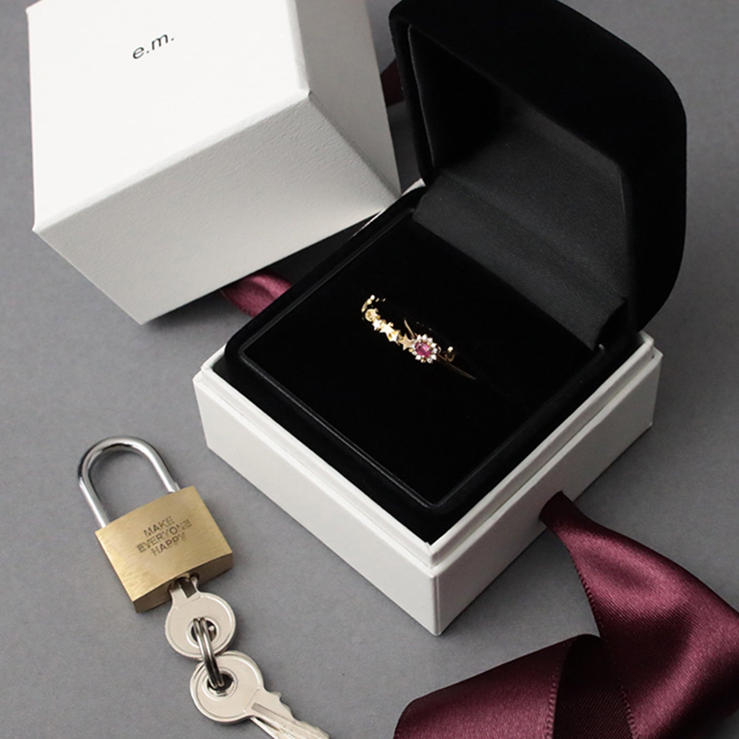 e.m.青山店限定カラーのカラーストーンリングや、ホースシューやイニシャルなどのチャーム、モチーフをセレクトできるオーダーリングなど4周年を記念した「4」にまつわるアイテムや店内装飾を豊富に展開し、お客様への感謝を伝える特別な時間をご提供します。