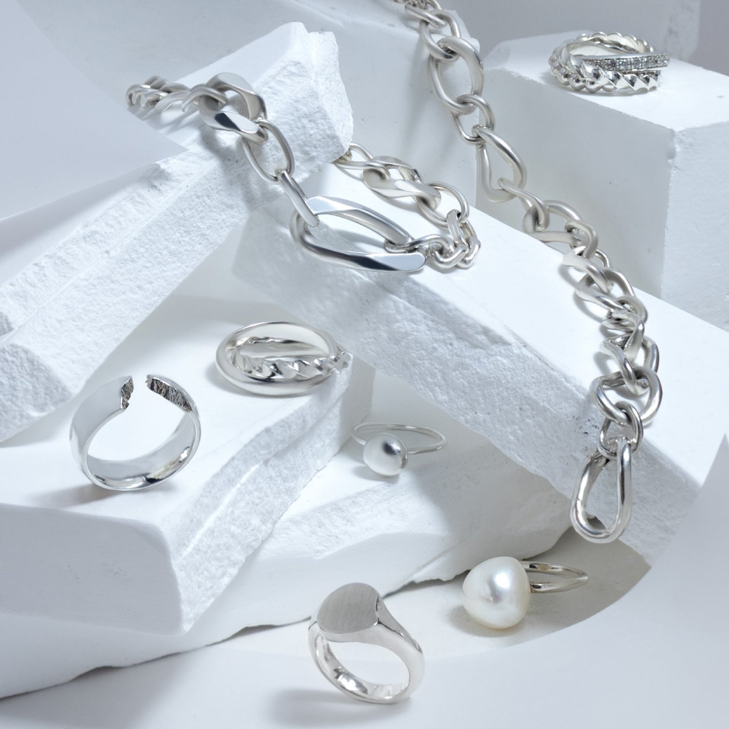 さらに、シルバーの持つ凛とした輝きを堪能できる、装飾をそぎ落としシンプルな美を極めたブレスレットやイヤーカフもラインナップ。