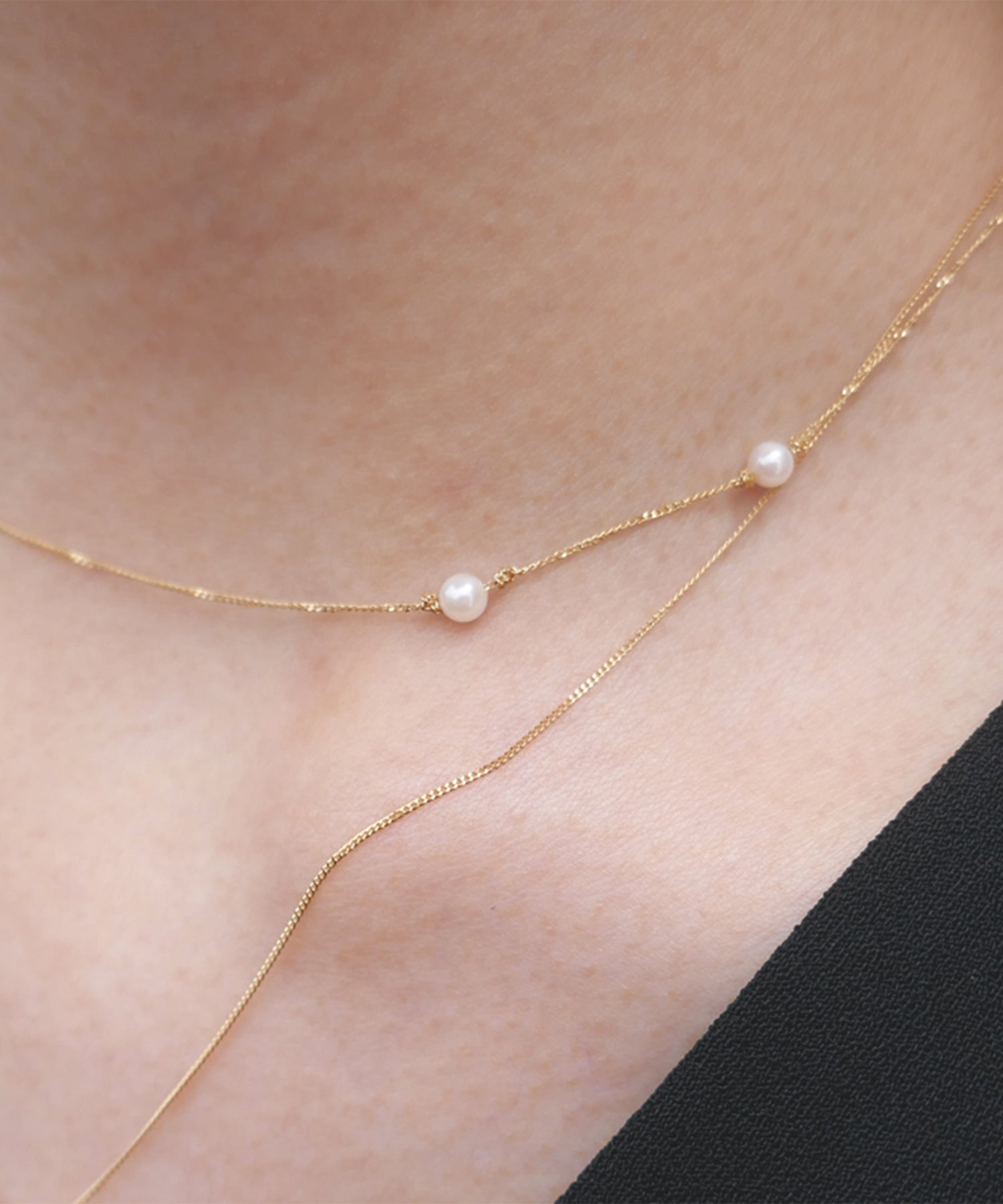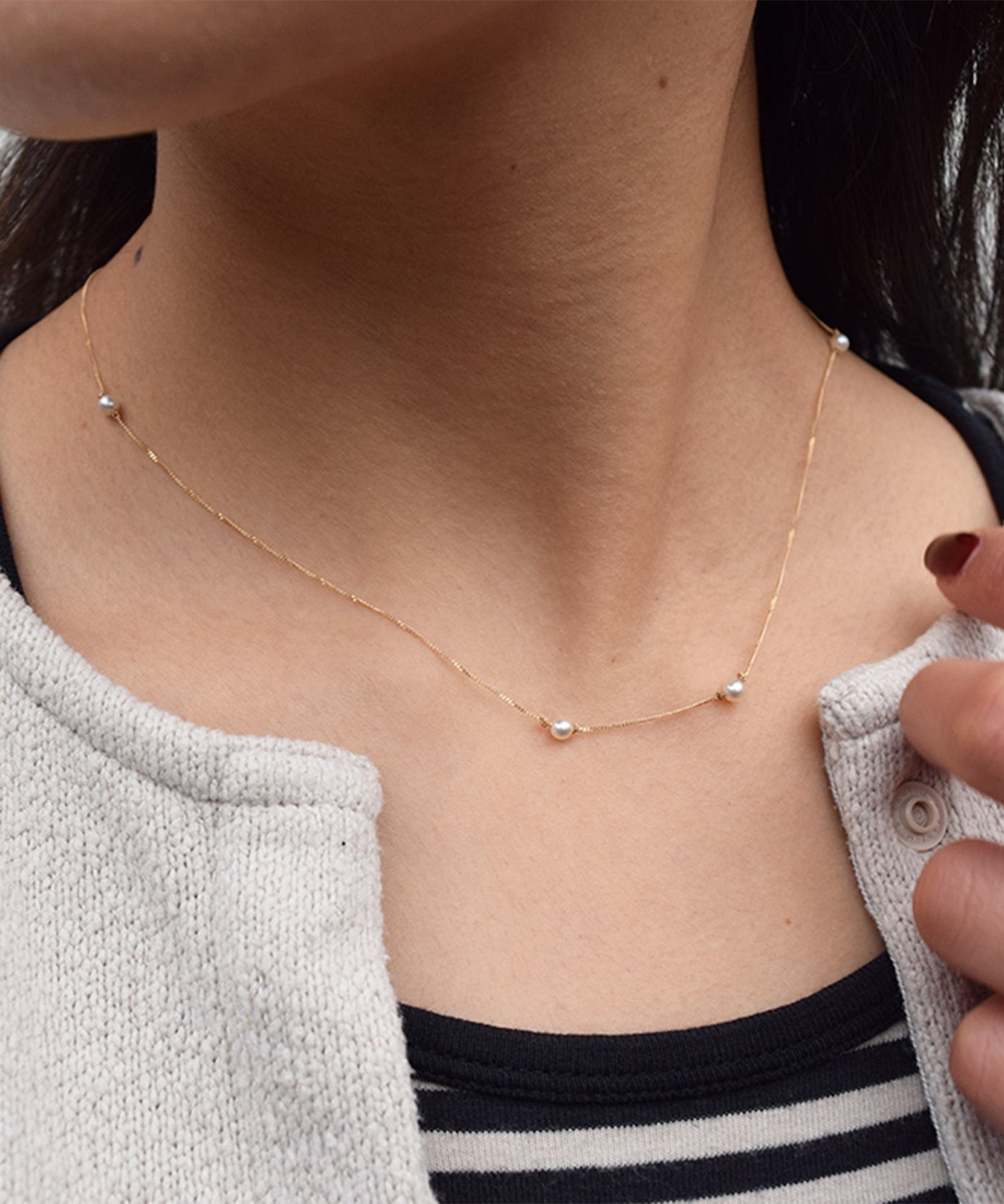 チェーンの結び目でパールを留めている遊び心あるデザインのネックレス。アコヤパールはランダムに配置し、首元を1周パールで飾ります。