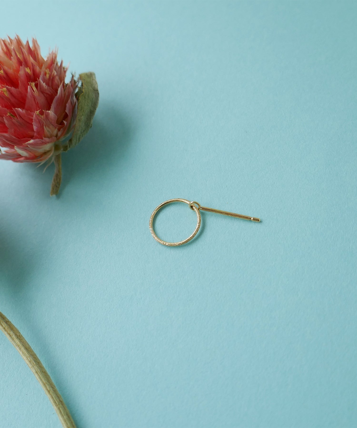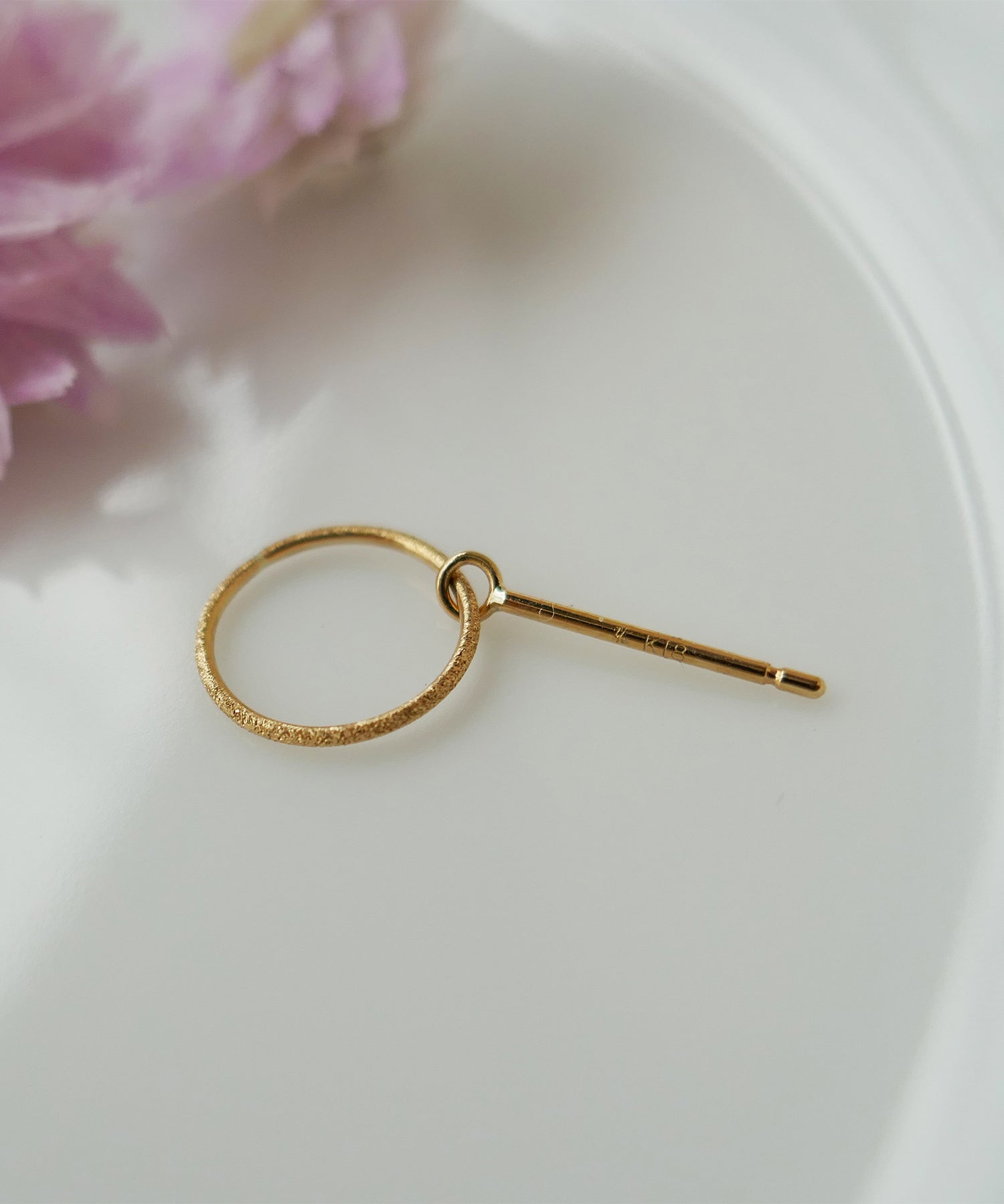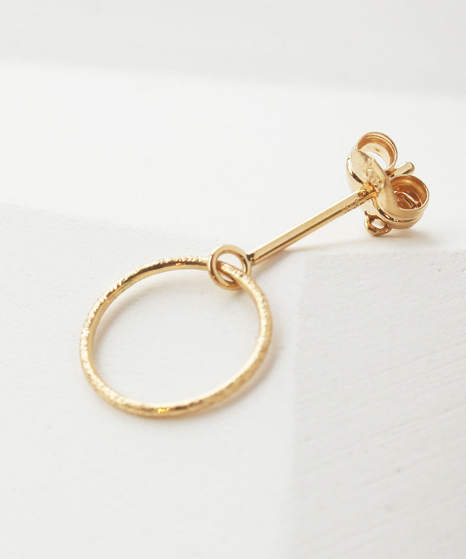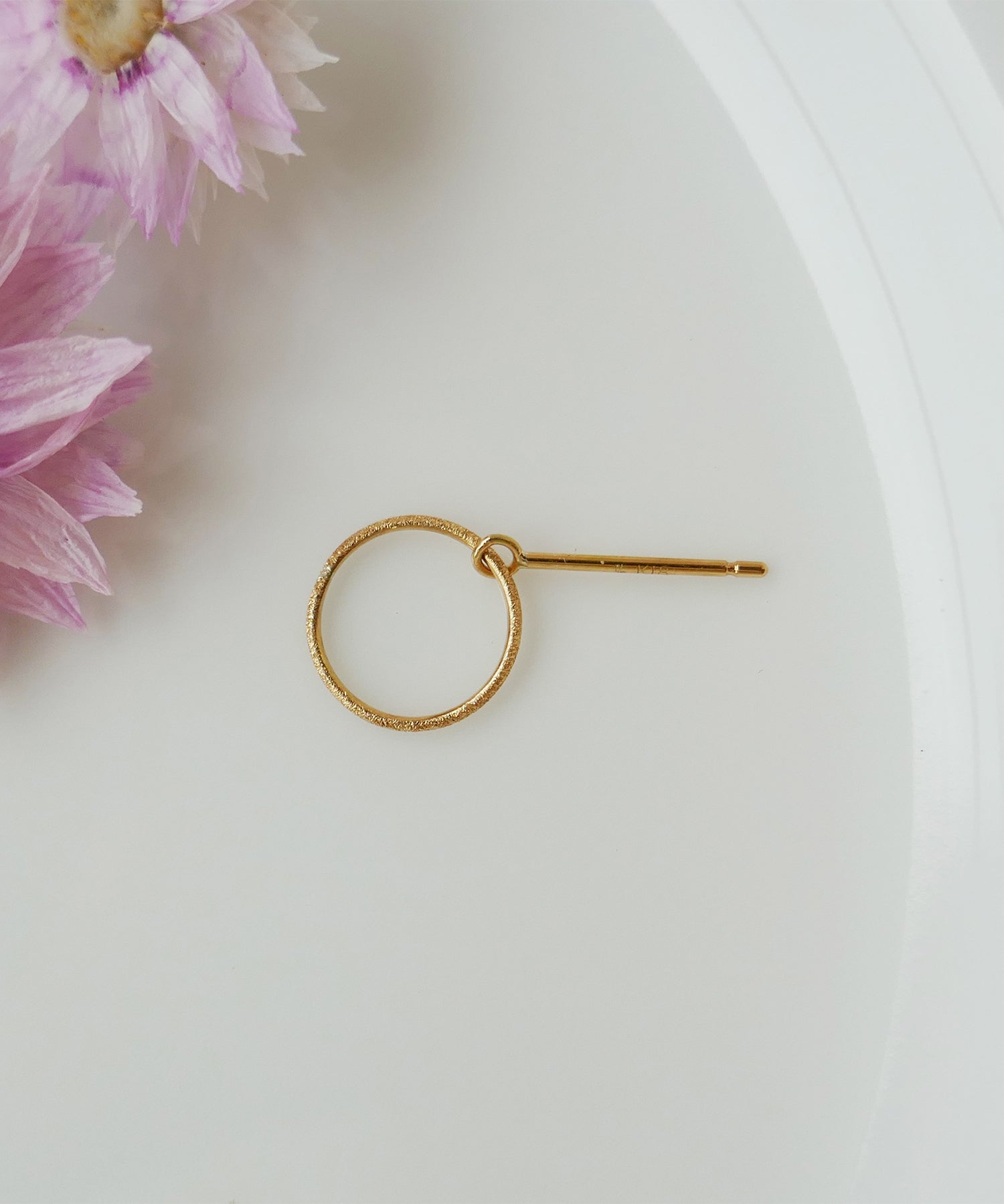 スターダスト加工が施された揺れるミニフープモチーフのピアス。ひっかかりの心配も無いミニマムなデザインながら着けるとキラキラと輝き存在感を放ちます。大きめフープピアスとの左右アシンメトリーコーデやシンプルなポストピアスとの並べ着けなどデザイン違いで楽しむのがおすすめです。