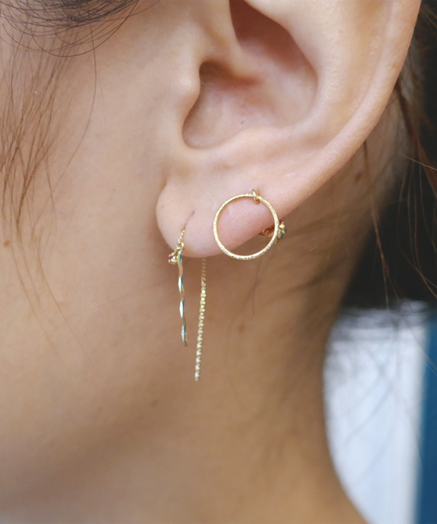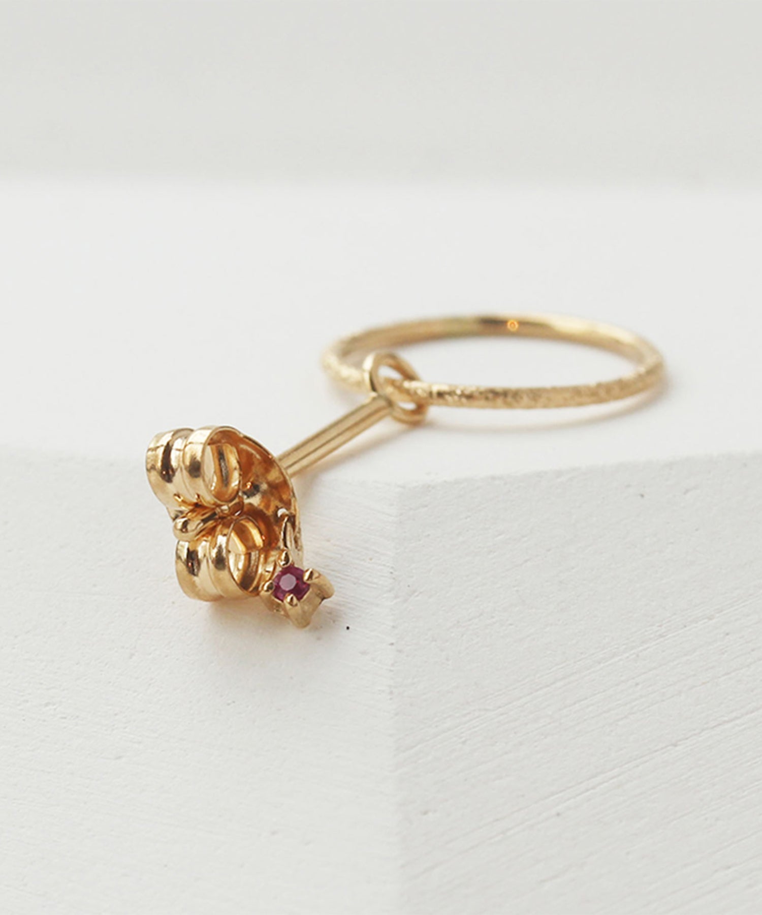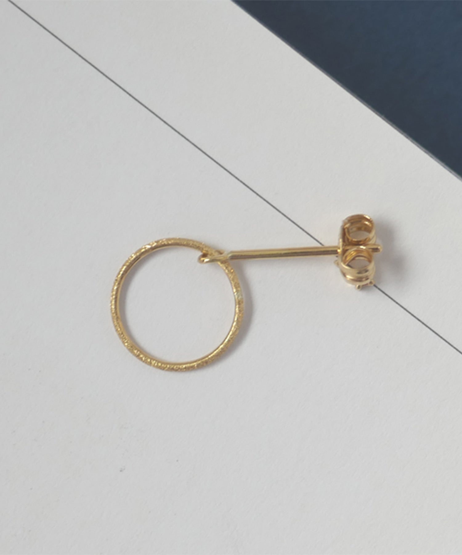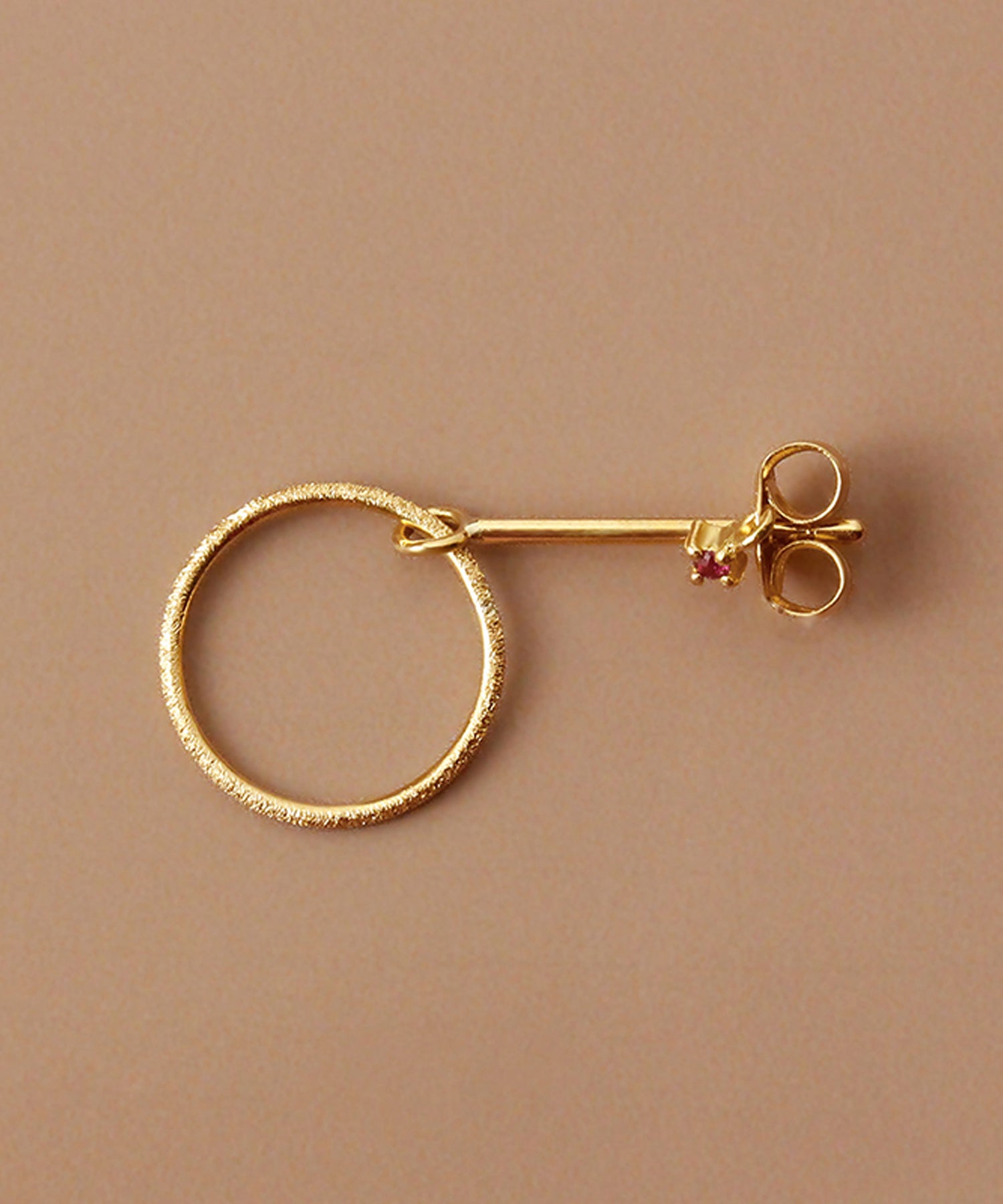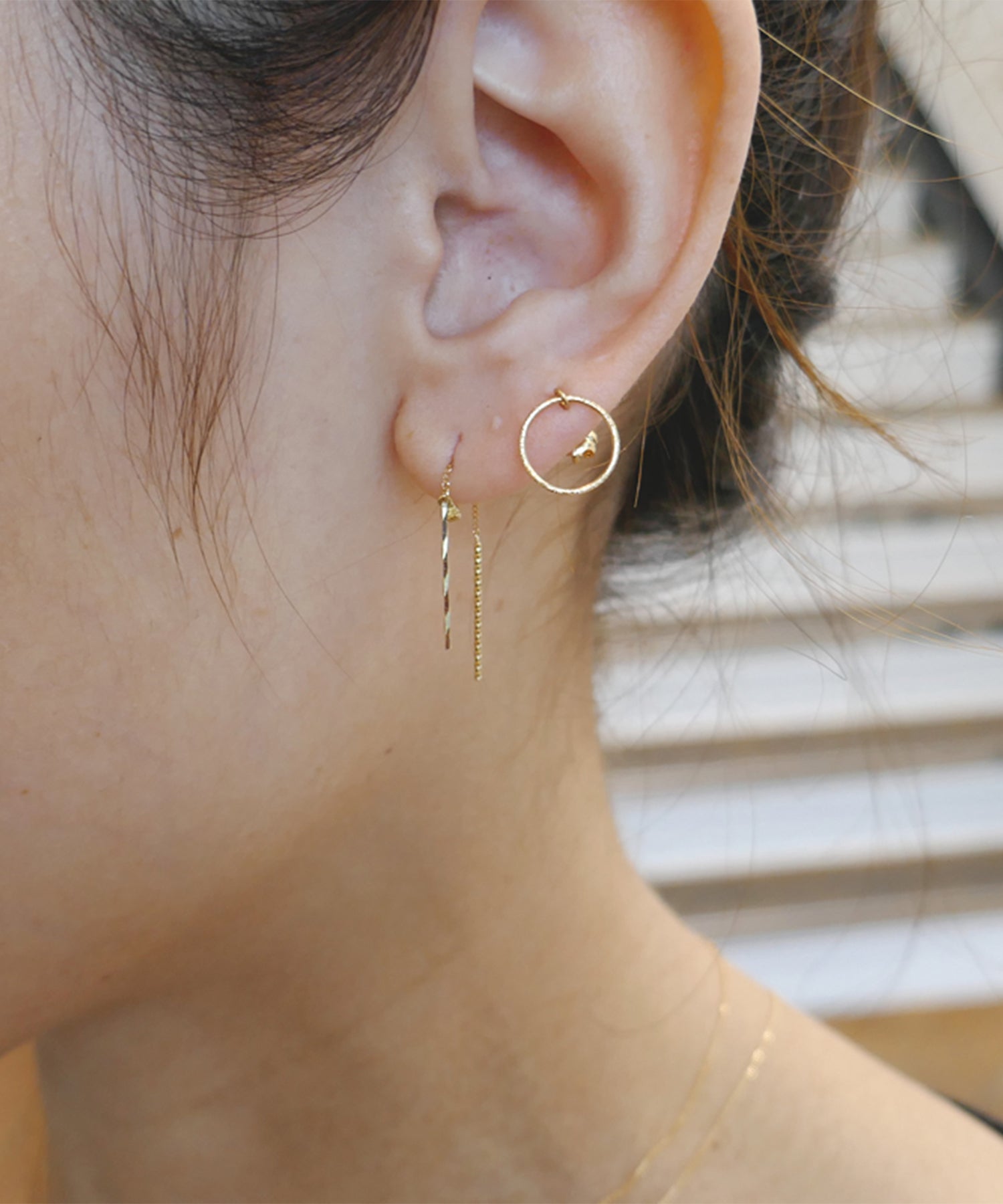 スターダスト加工が施された揺れるミニフープモチーフのピアス。ひっかかりの心配も無いミニマムなデザインながら着けるとキラキラと輝き存在感を放ちます。大きめフープピアスとの左右アシンメトリーコーデやシンプルなポストピアスとの並べ着けなどデザイン違いで楽しむのがおすすめです。