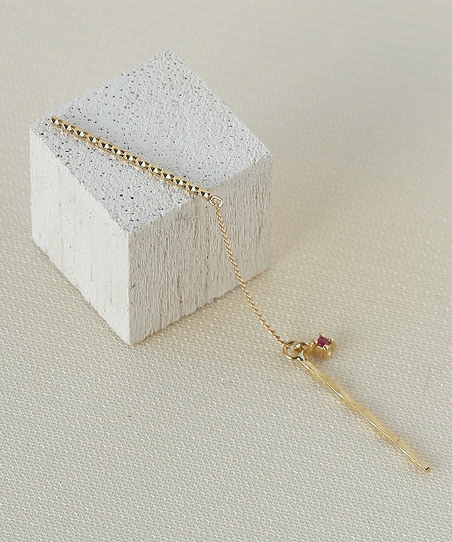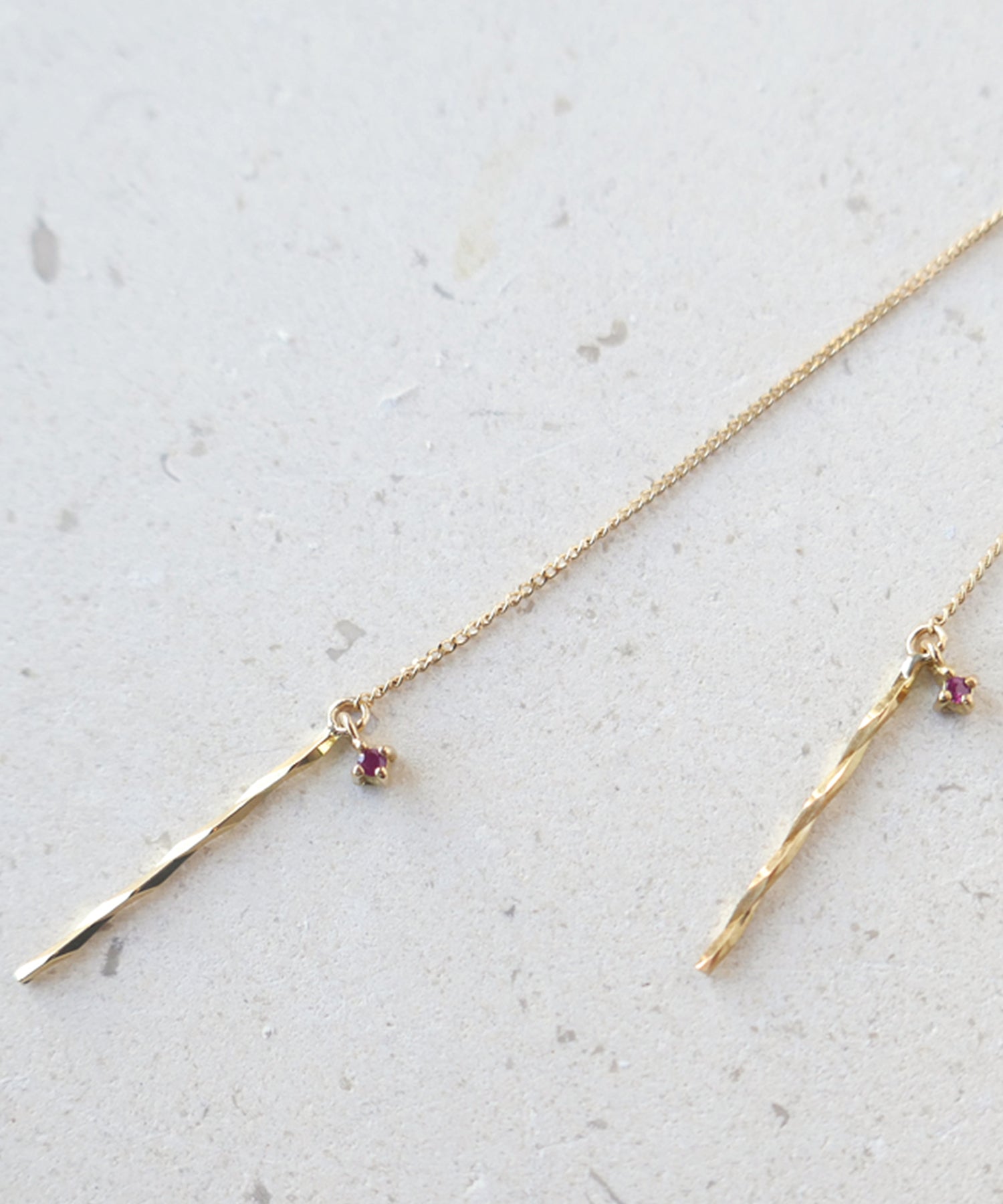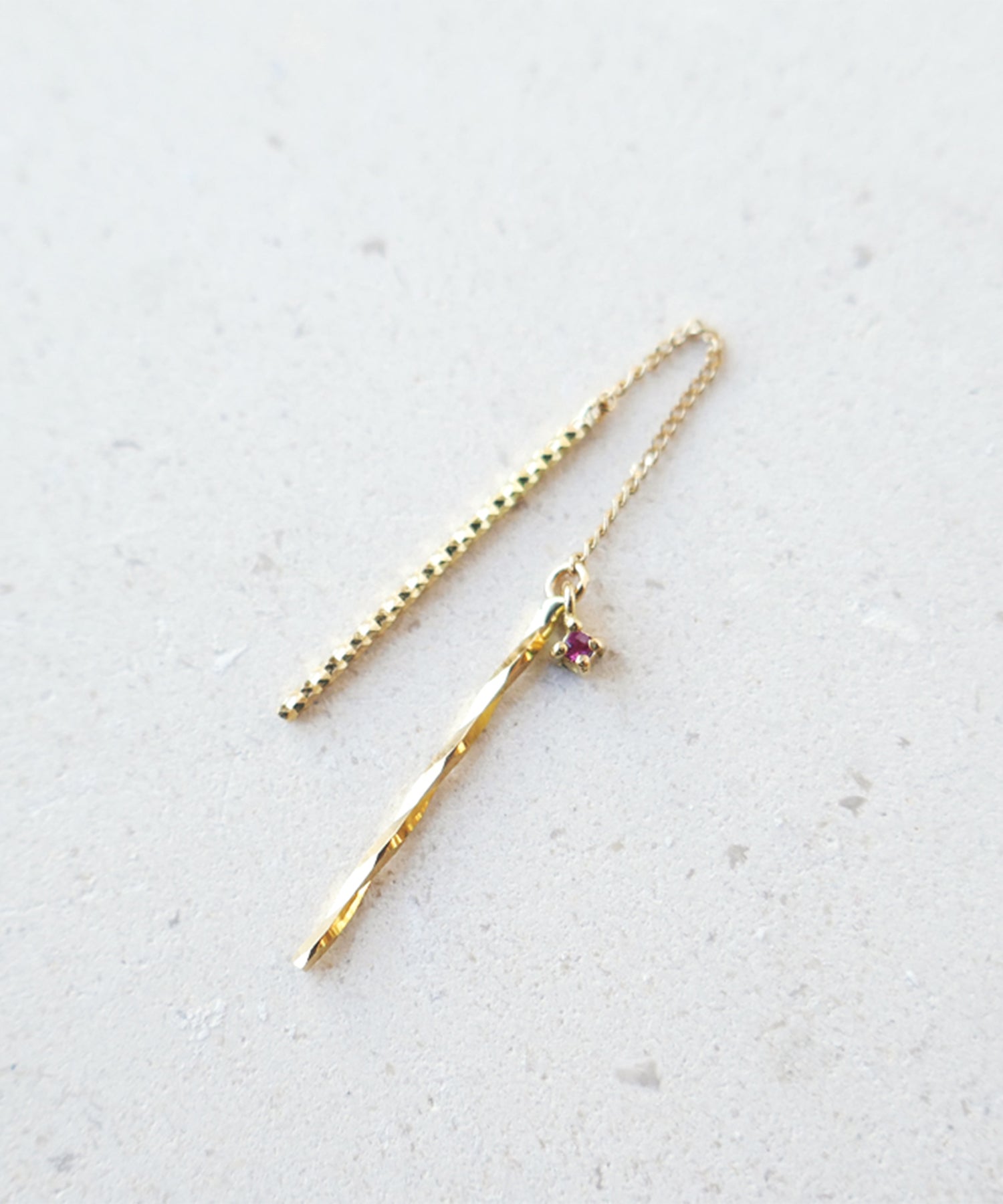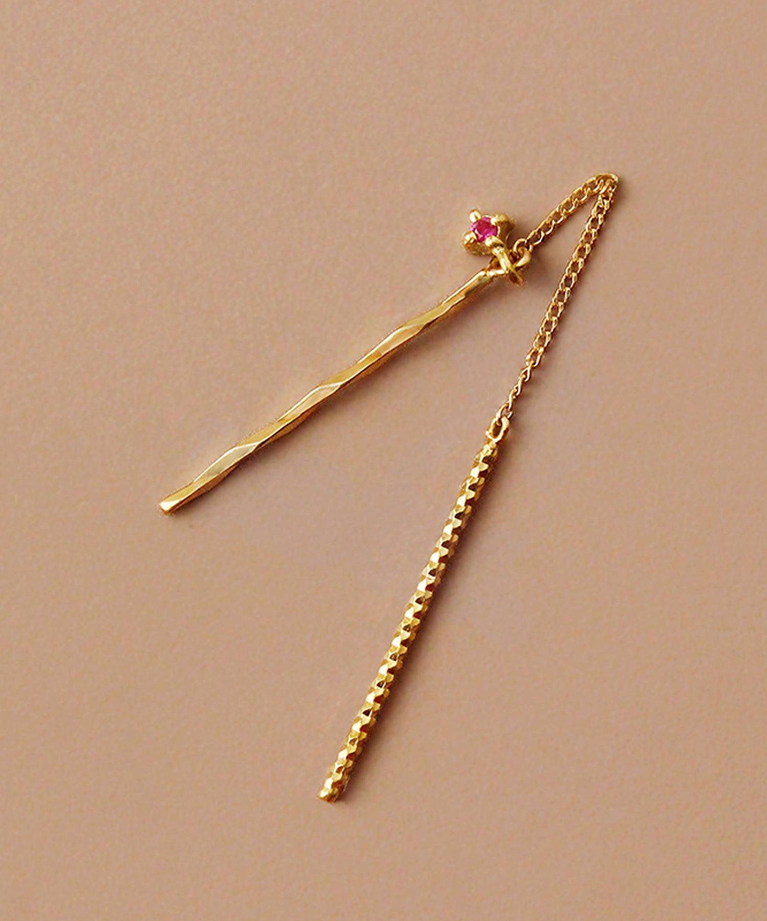 2種類のゴールドのバーが両端で揺れるピアスは短く着けやすいサイズで軟骨などにもおすすめです。さりげなく揺れるお守りルビーも目立ってかわいい魅惑のアイテム。