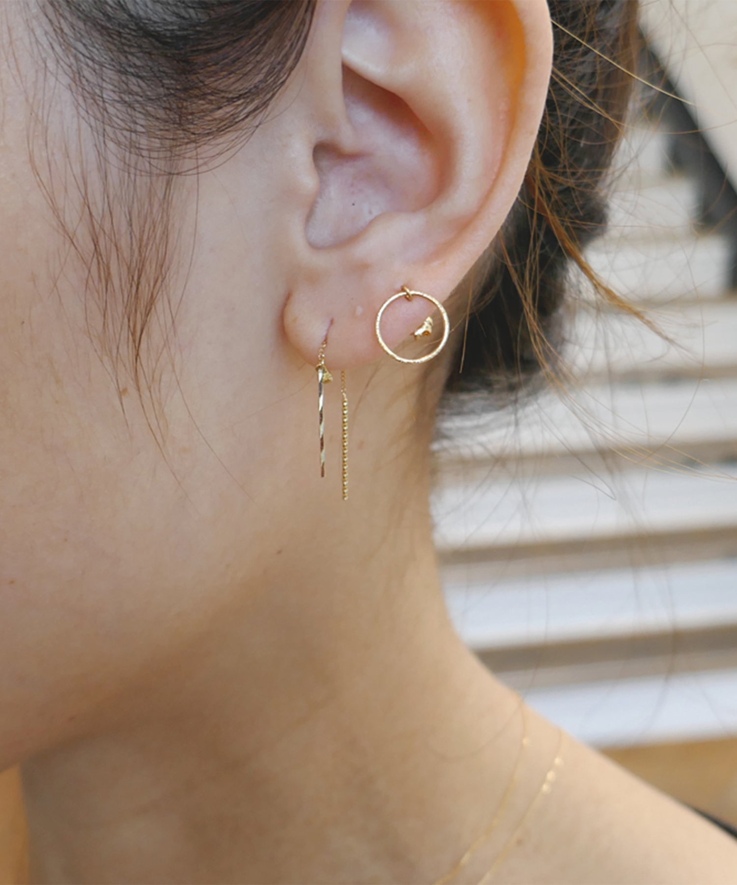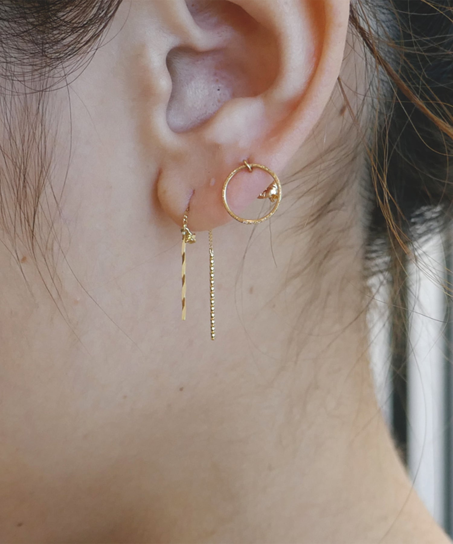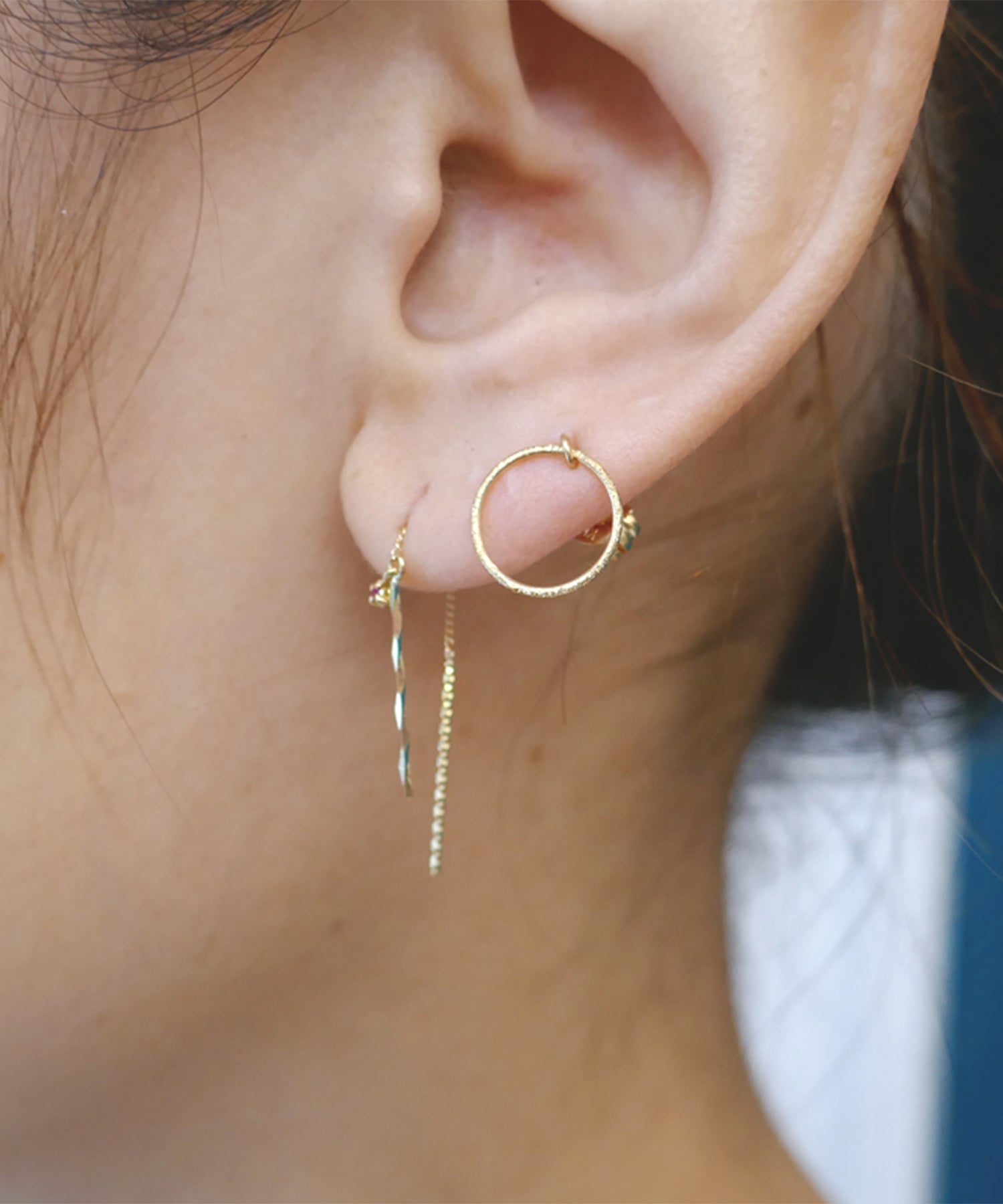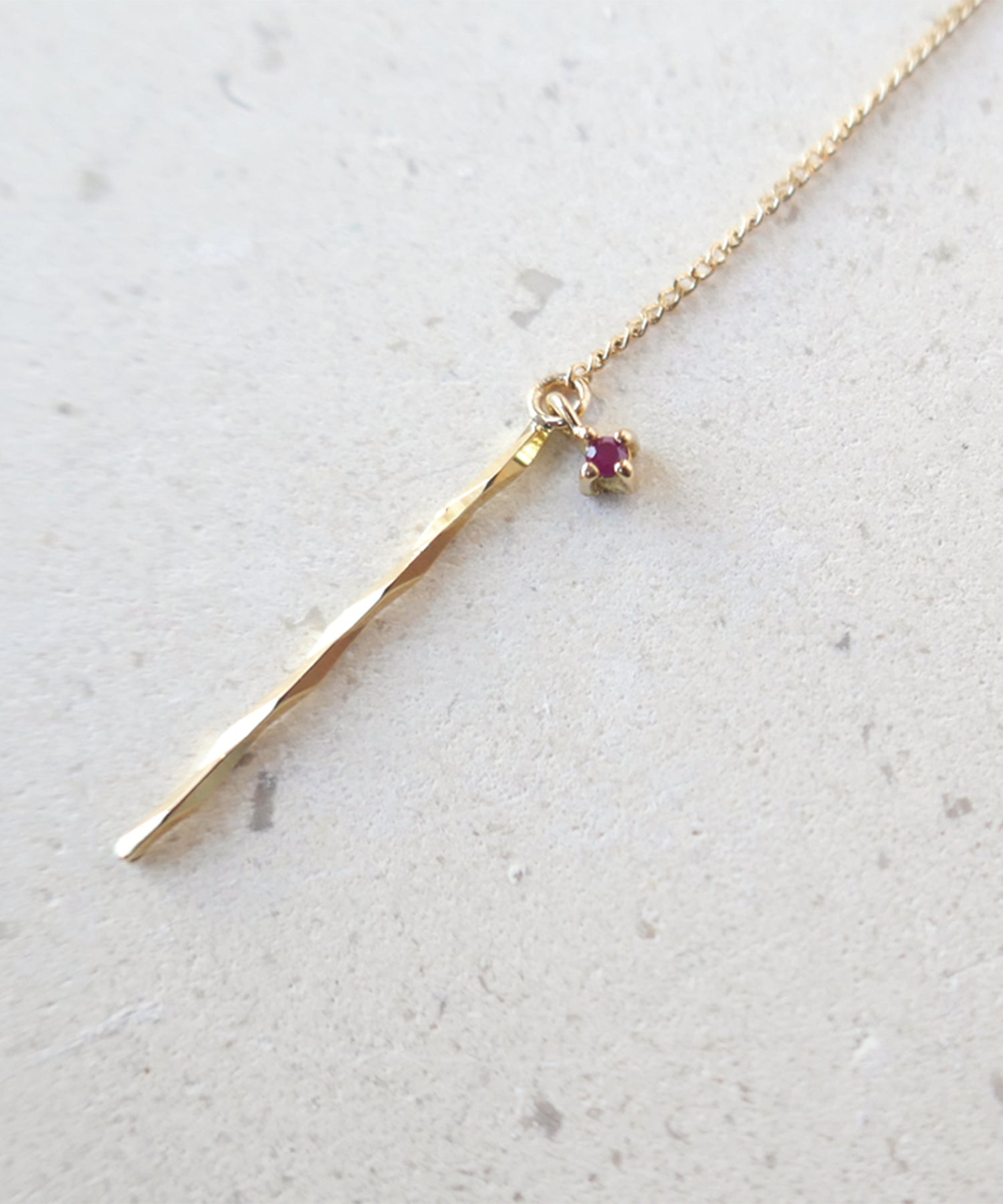 2種類のゴールドのバーが両端で揺れるピアスは短く着けやすいサイズで軟骨などにもおすすめです。さりげなく揺れるお守りルビーも目立ってかわいい魅惑のアイテム。