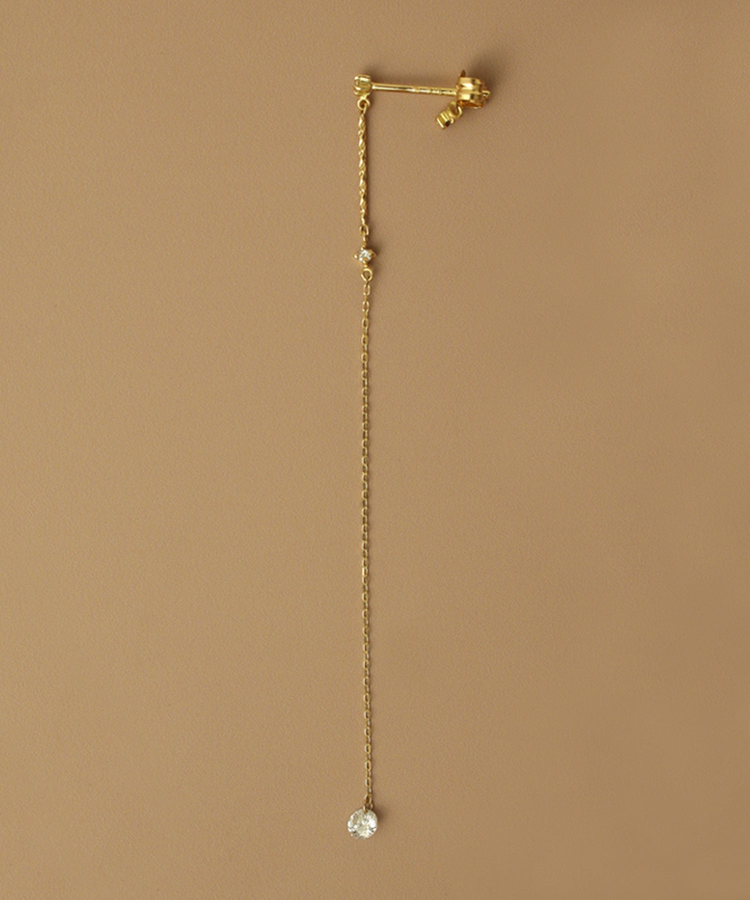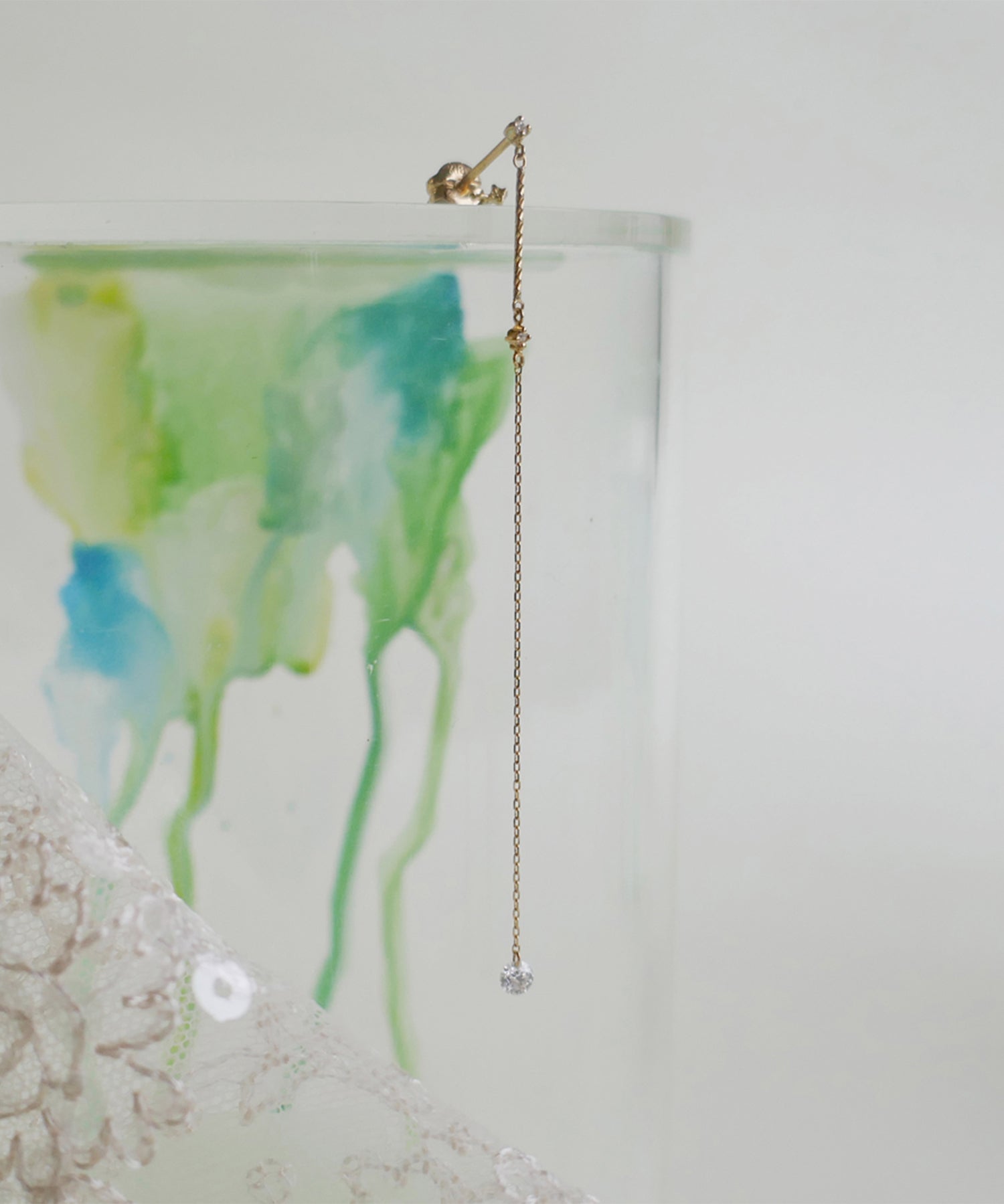 ダイヤモンドとカットバーが連なるロングチェーンのゴールドピアス。繊細なディテールはゆっくりと時間をかけて雫が滴る様が表現された優美なデザイン。