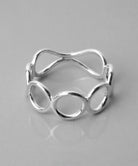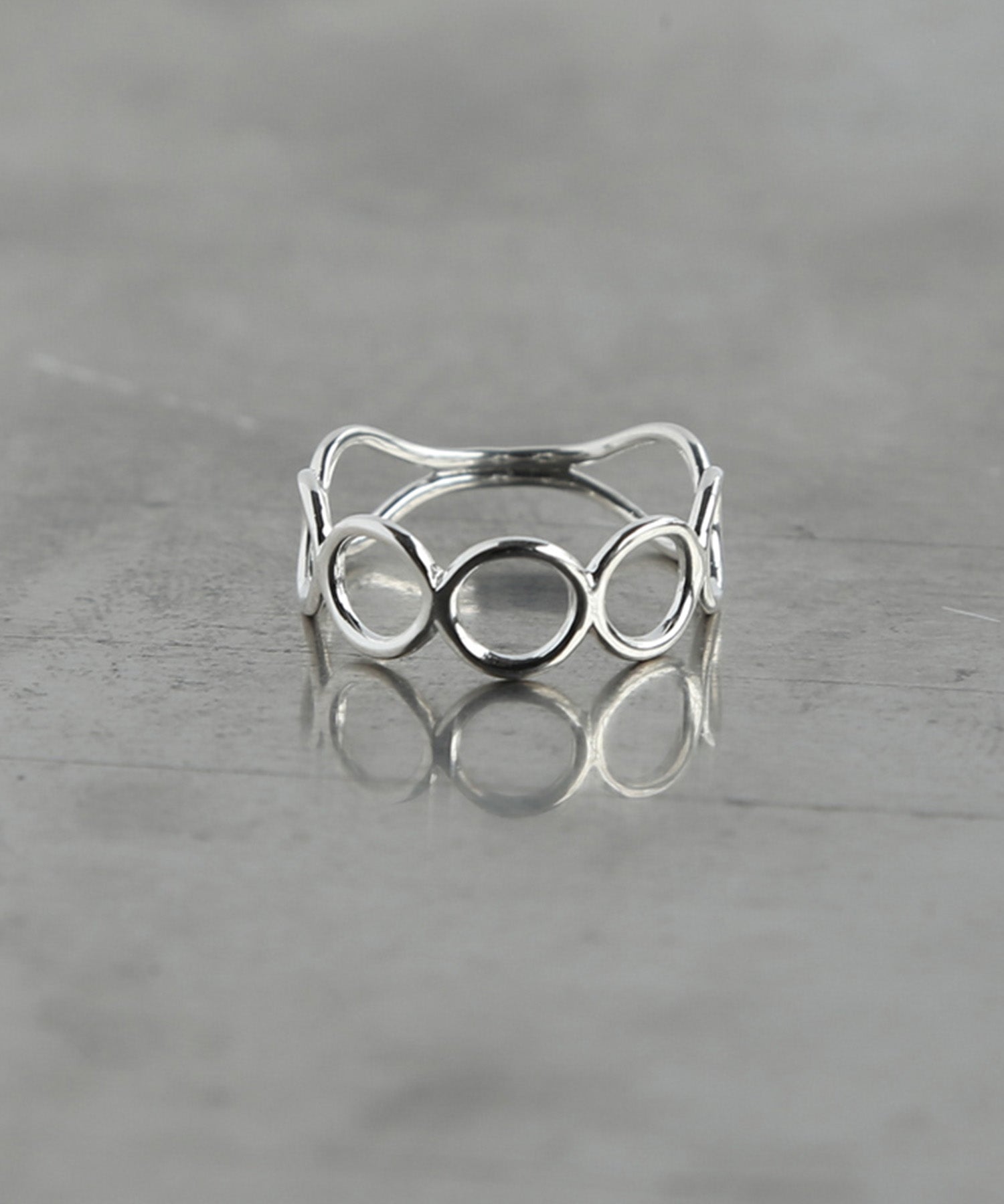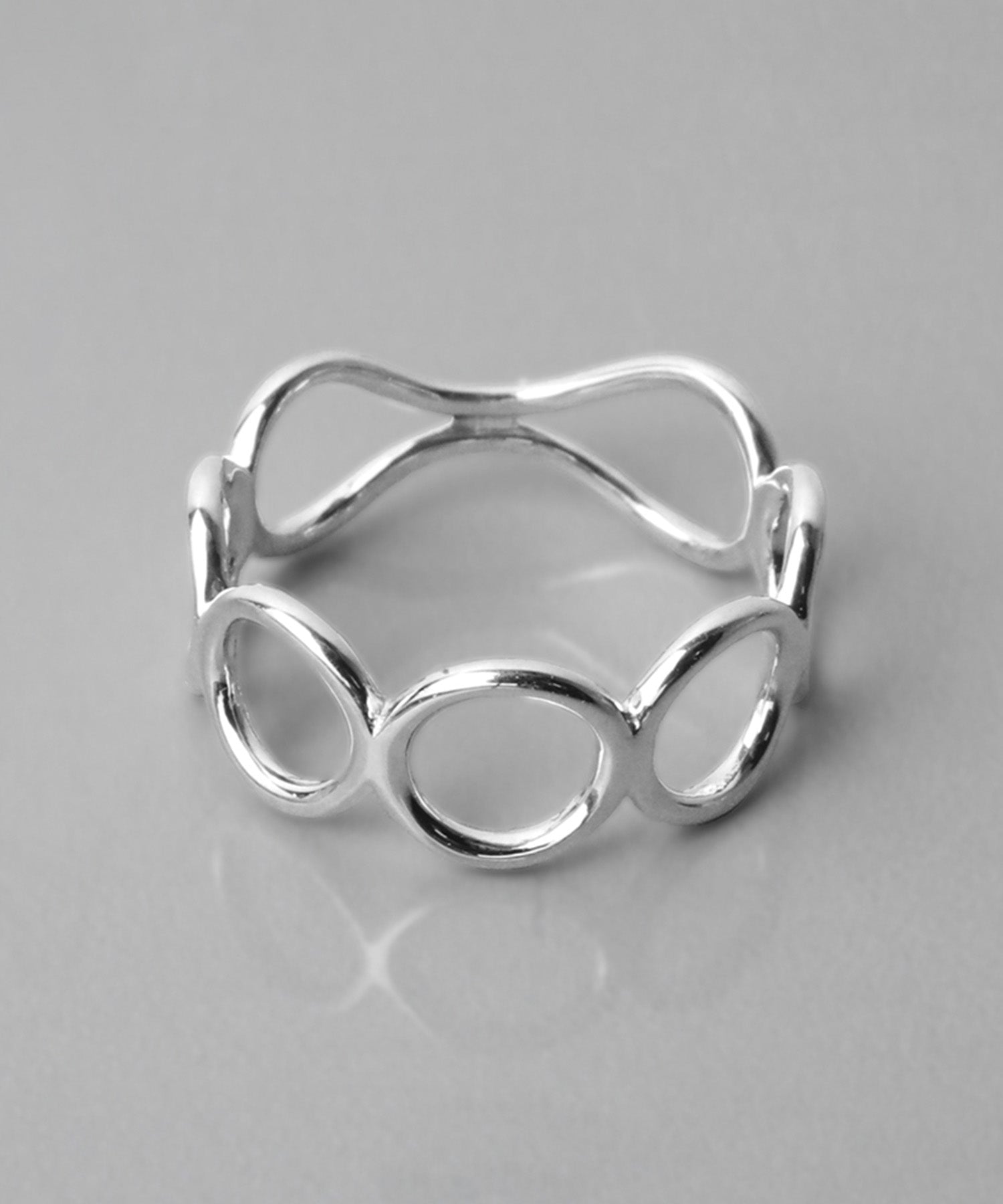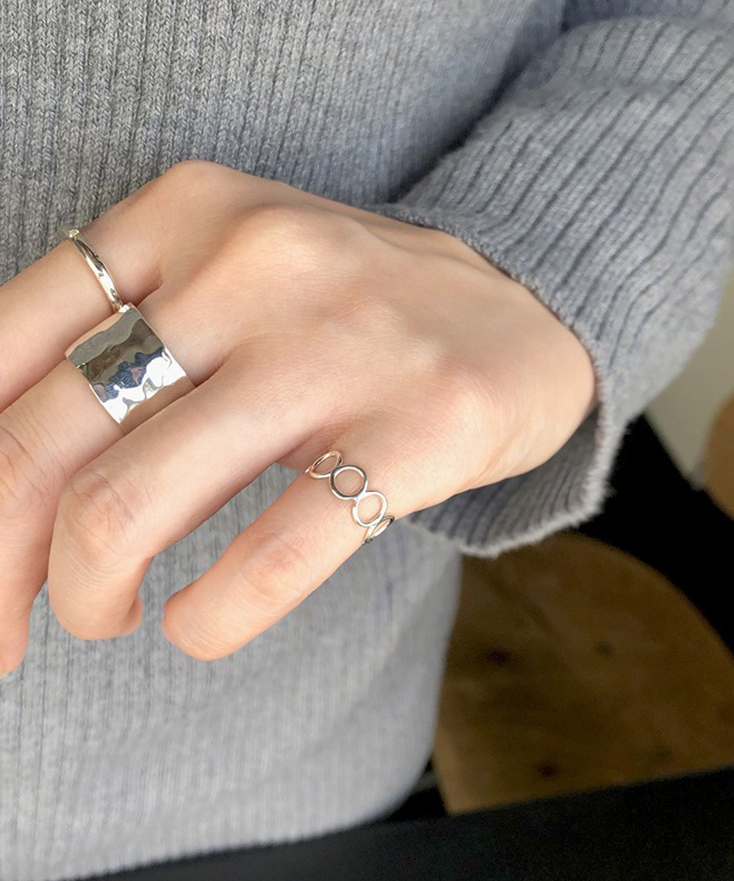 輪が連なったデザインのピンキーリング。シルバーの厚みがあるリングとのコーディネートがおすすめです。