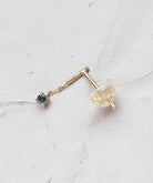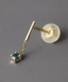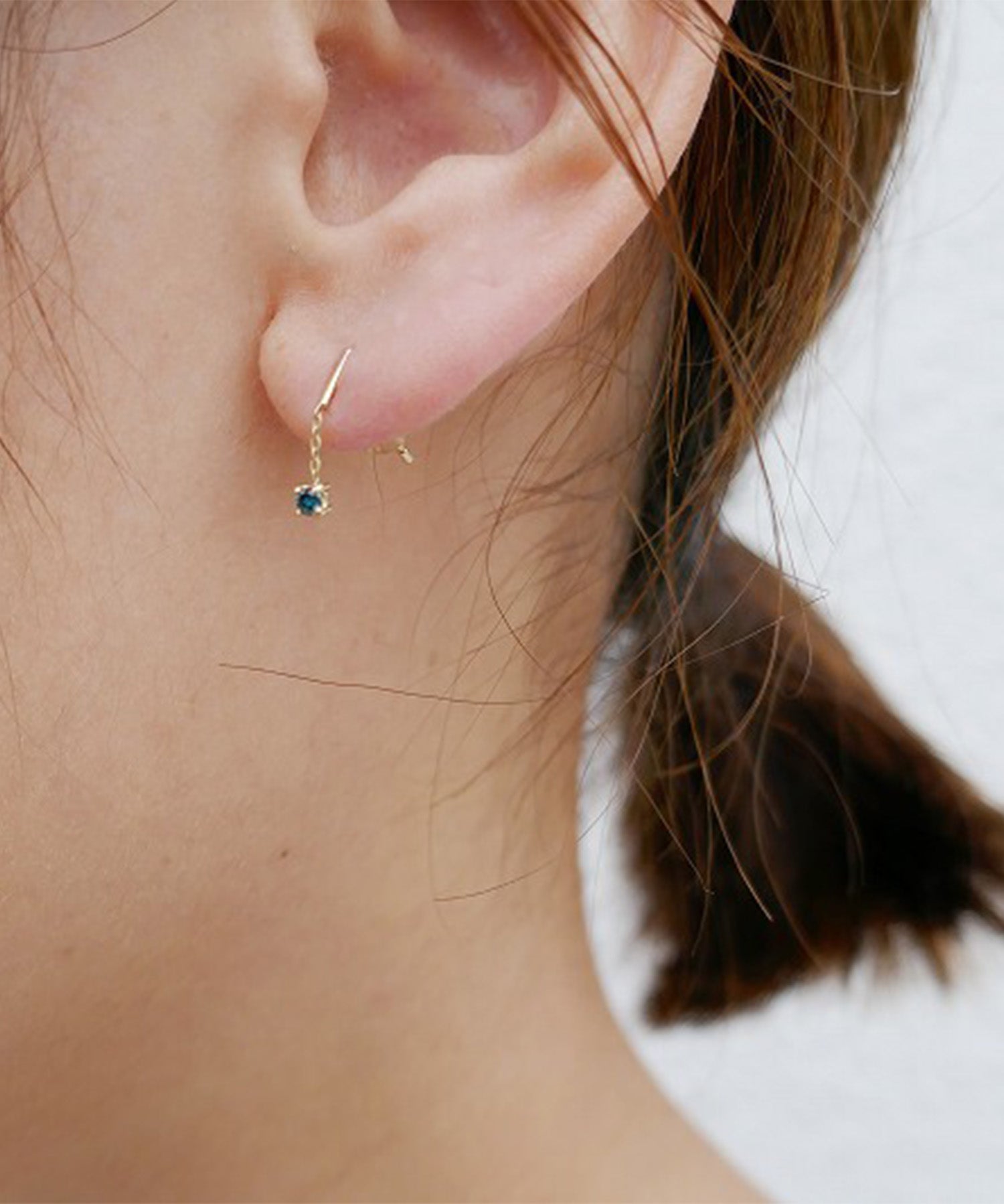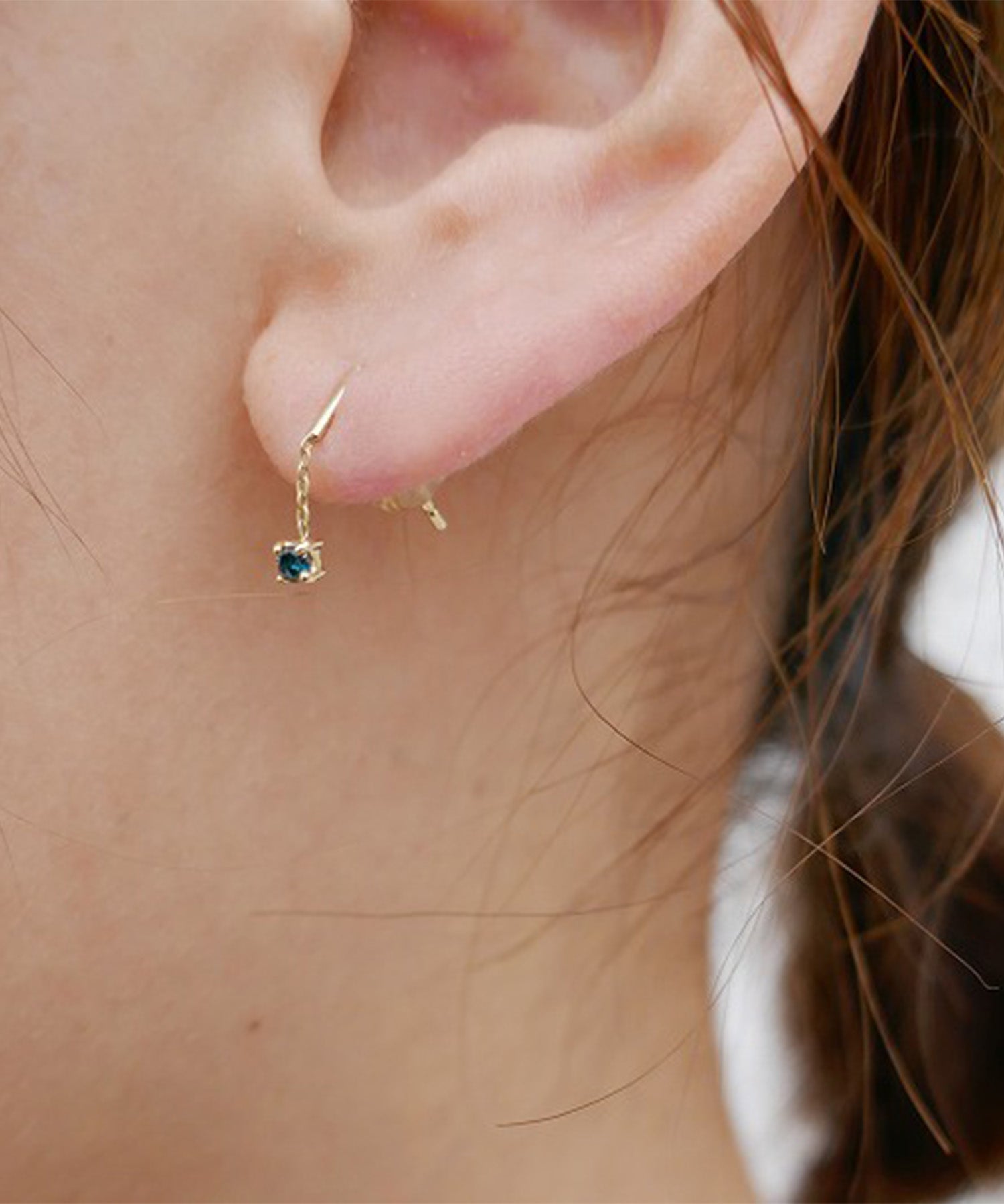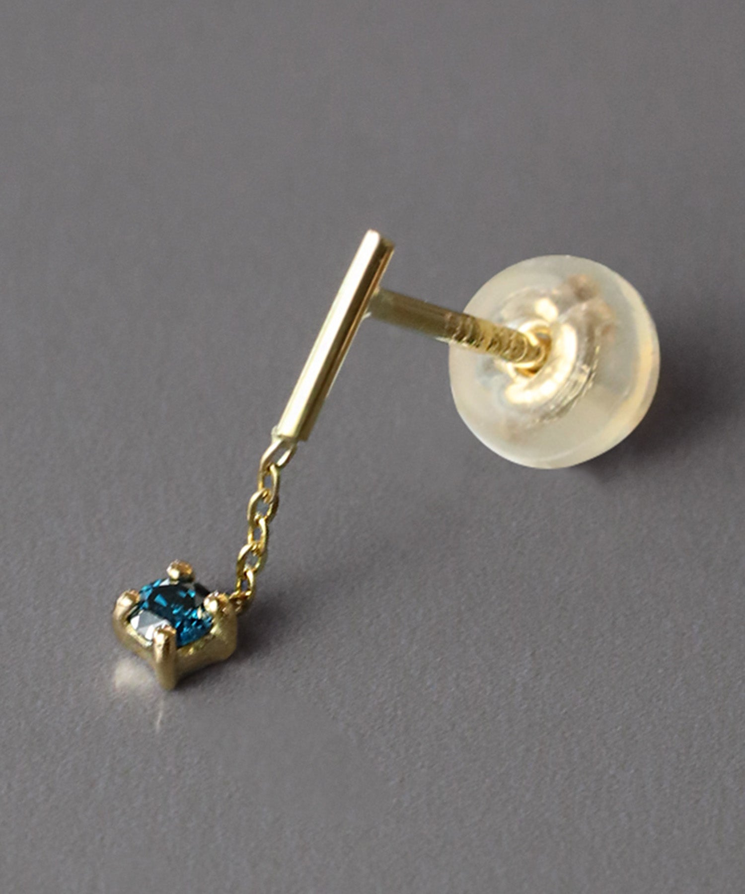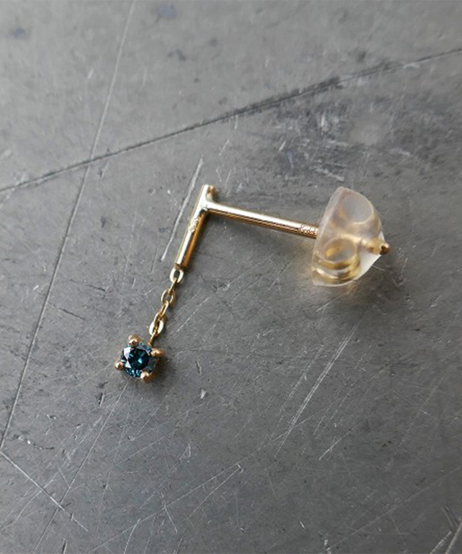 深い青味が美しいブルーダイヤモンドが揺れるピアス。ゴールドのスティックの先に
