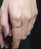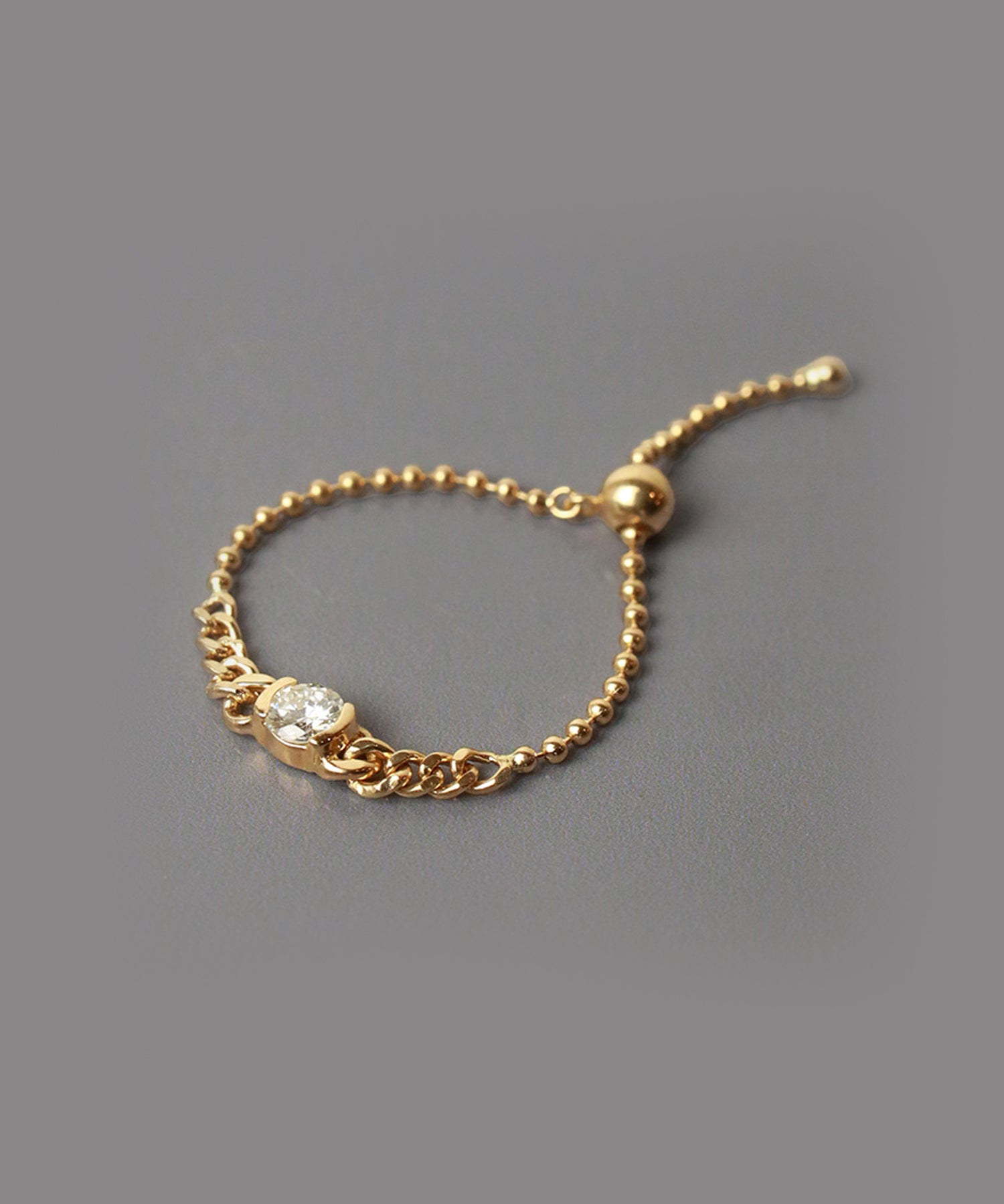 トップにダイヤモンドをセッティングしたゴールドのチェーンリング。指に通すリング部分は喜平チェーンとボールチェーンのグラデーションで、 センターのダイヤモンドを引き立てます。