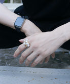キュービックジルコニア、パール、スパイクスタッズと、異なる表情を持つパーツを1つのリングに集めた大胆なデザイン。