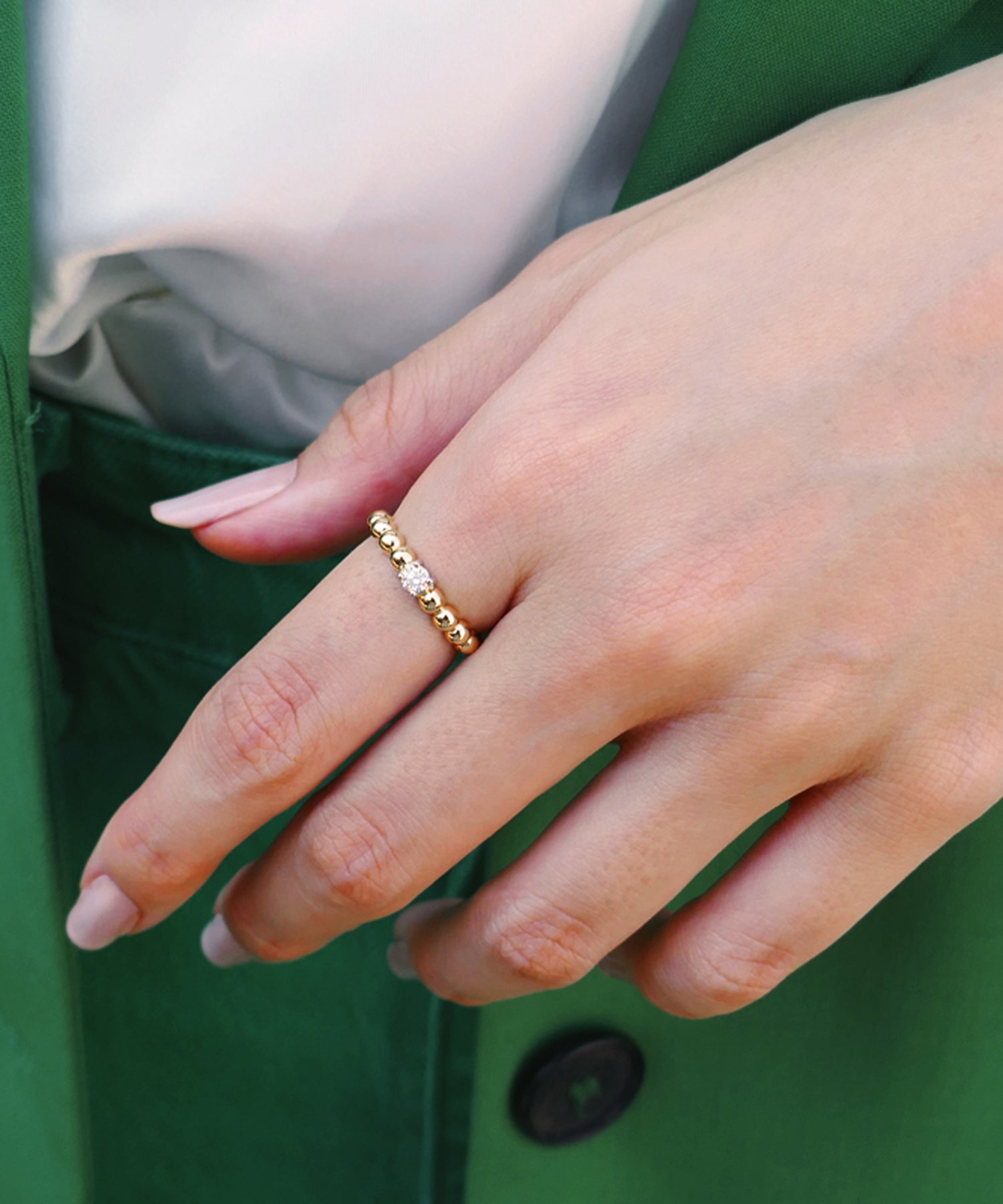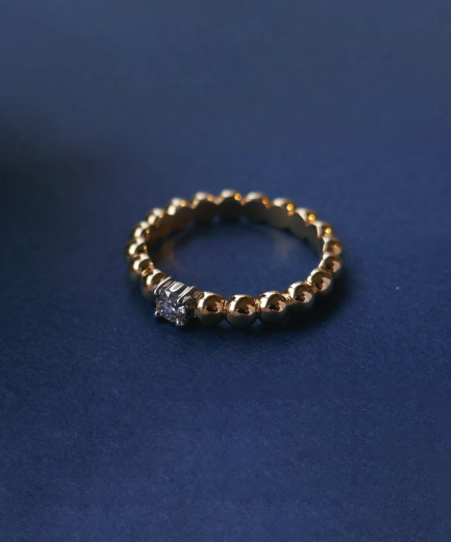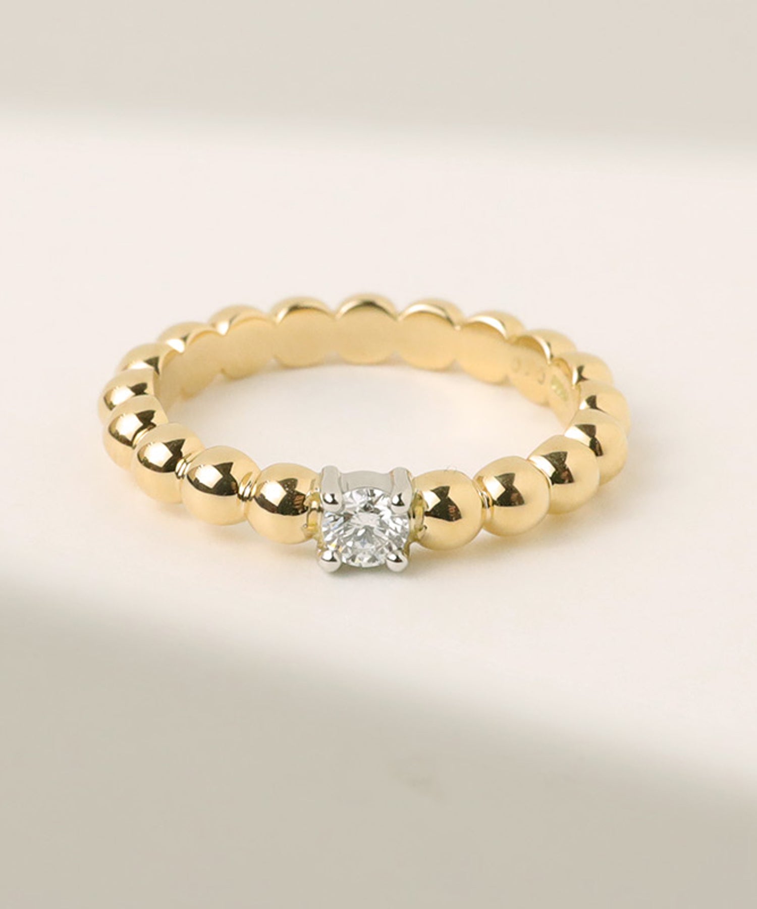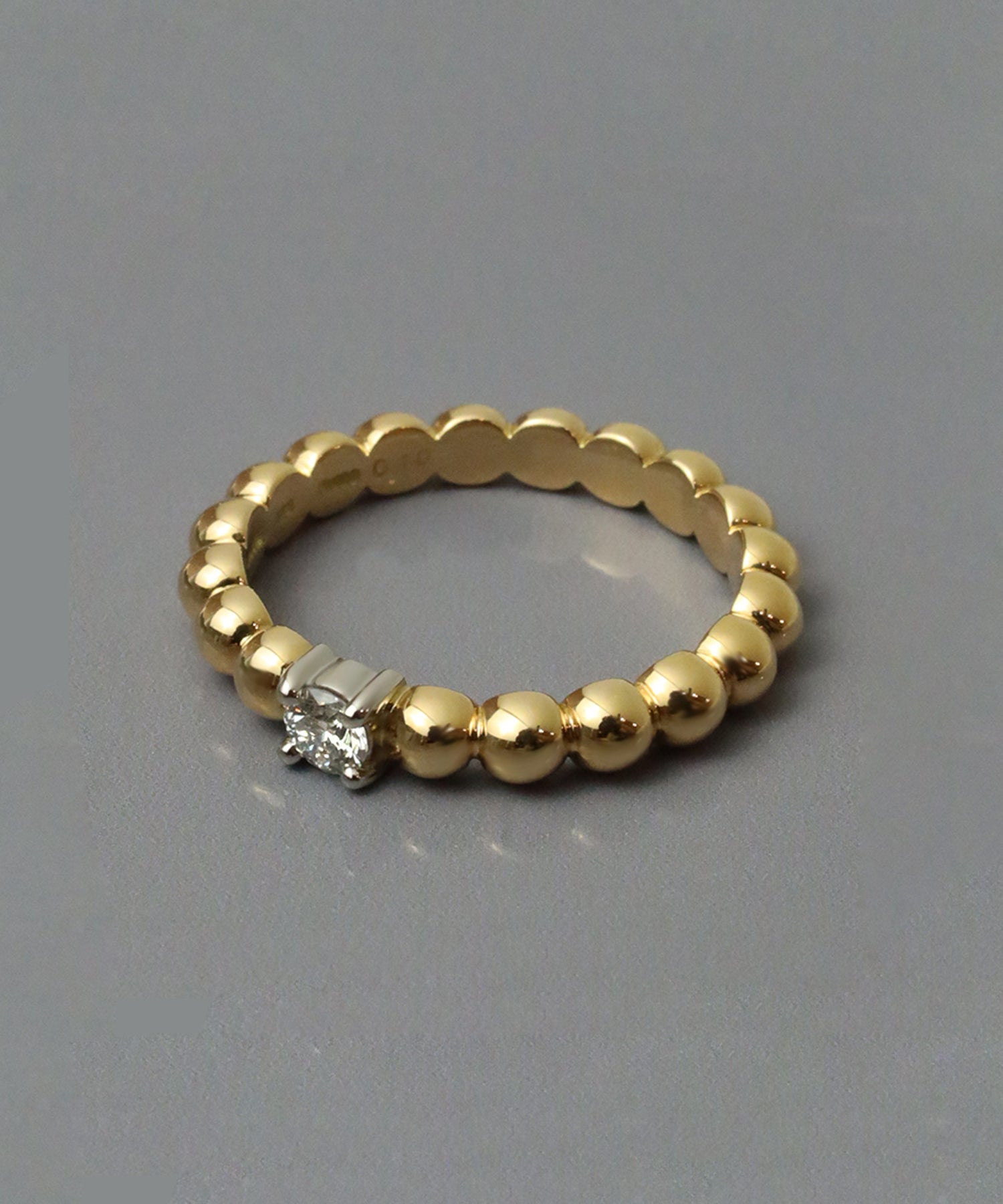 ボリュームたっぷりのイエローゴールドのアームとセンターには3mmのダイヤモンド。