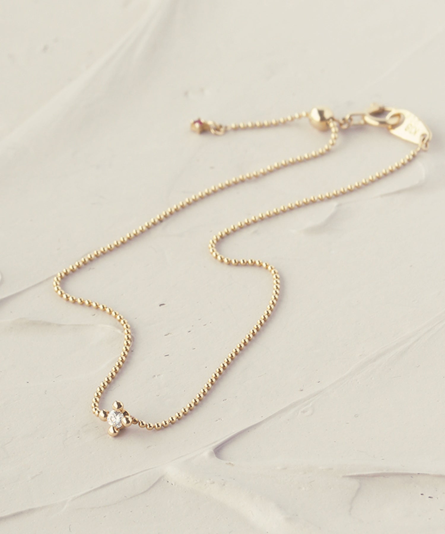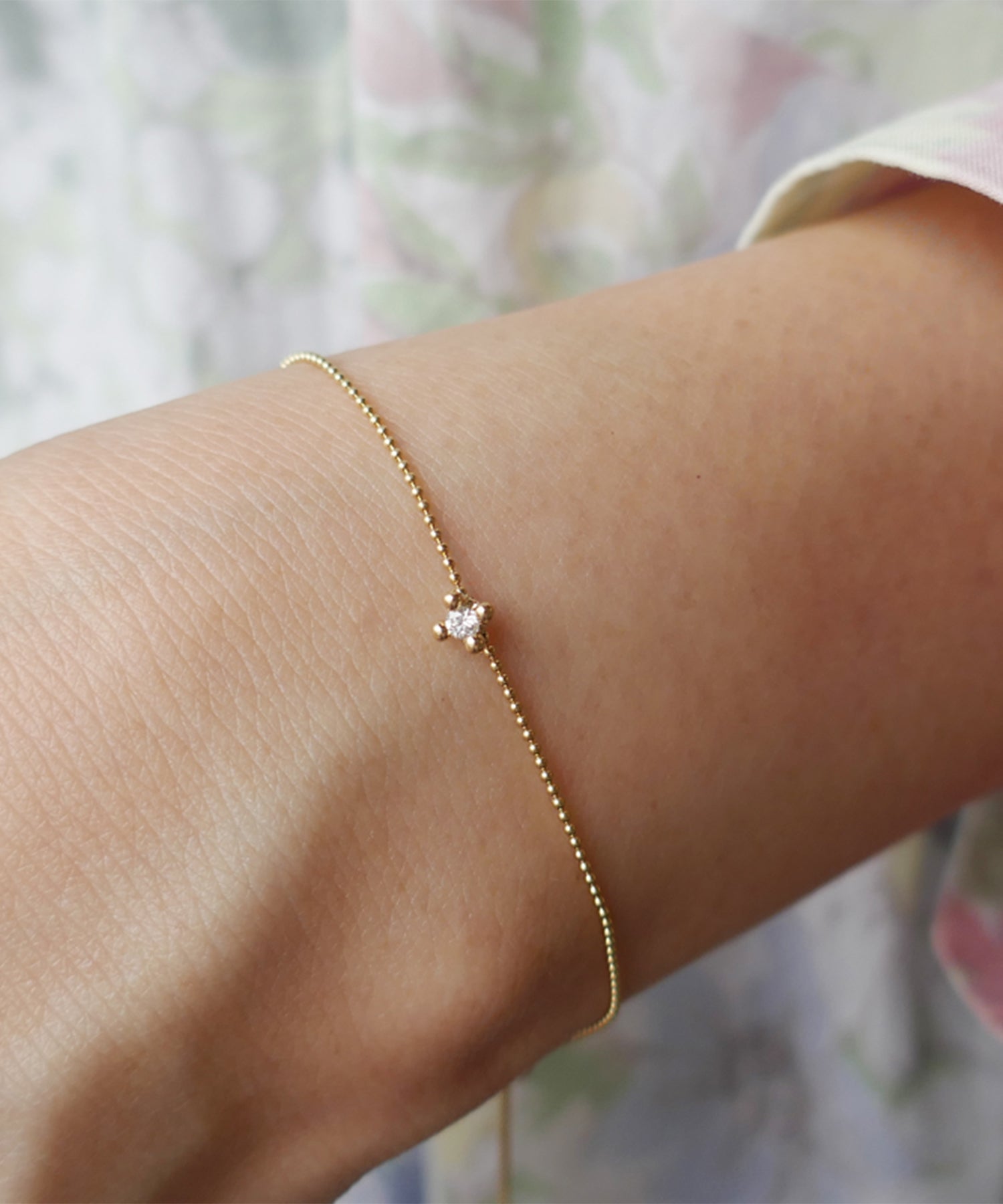 ほんの少しの存在感はその絶対の輝きのダイヤモンドと最近また注目されているボールチェーンのコンビネーションの中に感じるもの。春夏だけでなく、秋と冬にも袖の中に大切に着けておきたくなるデザイン。センターにダイヤモンドをセットしたゴールドのブレスレット。