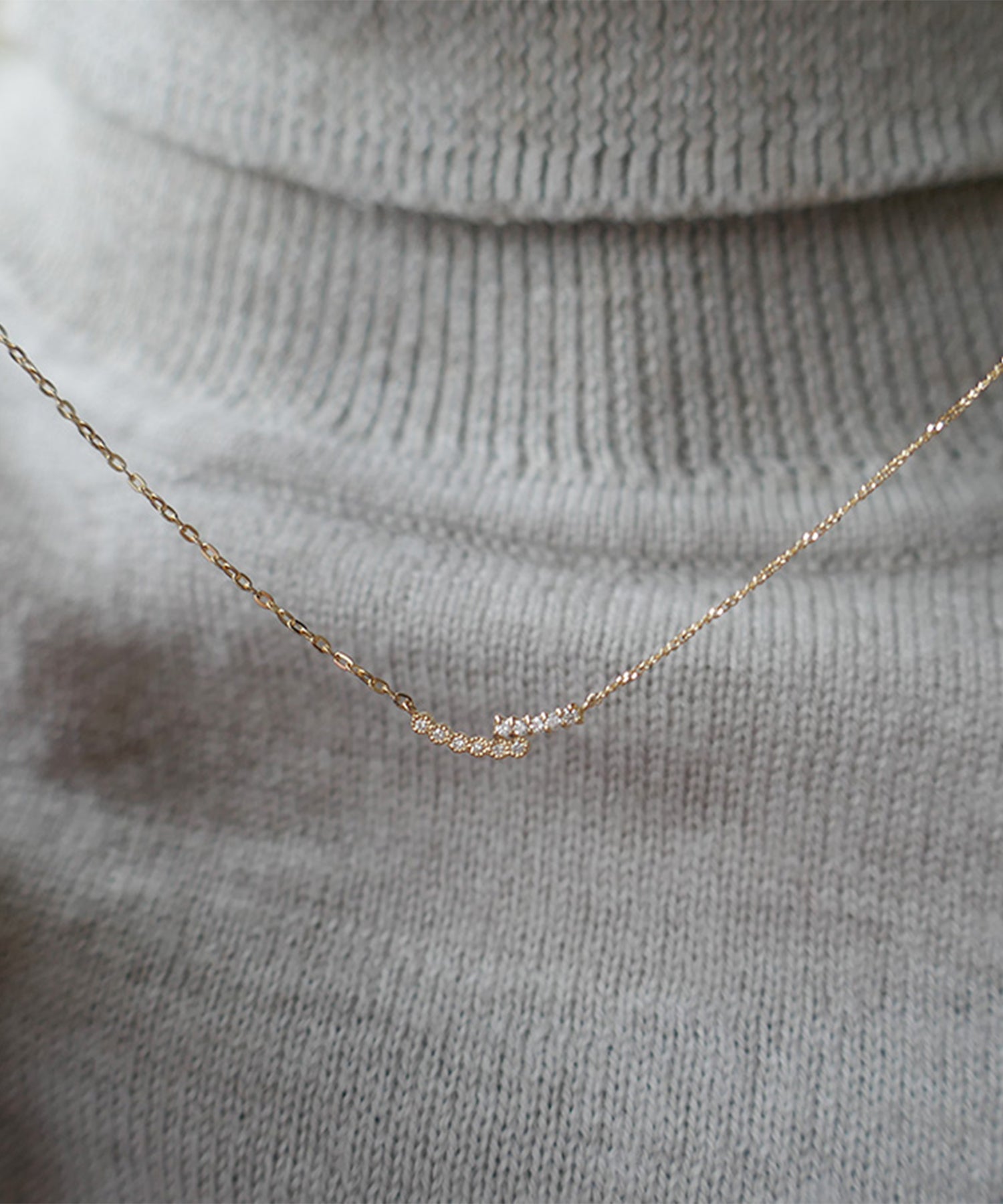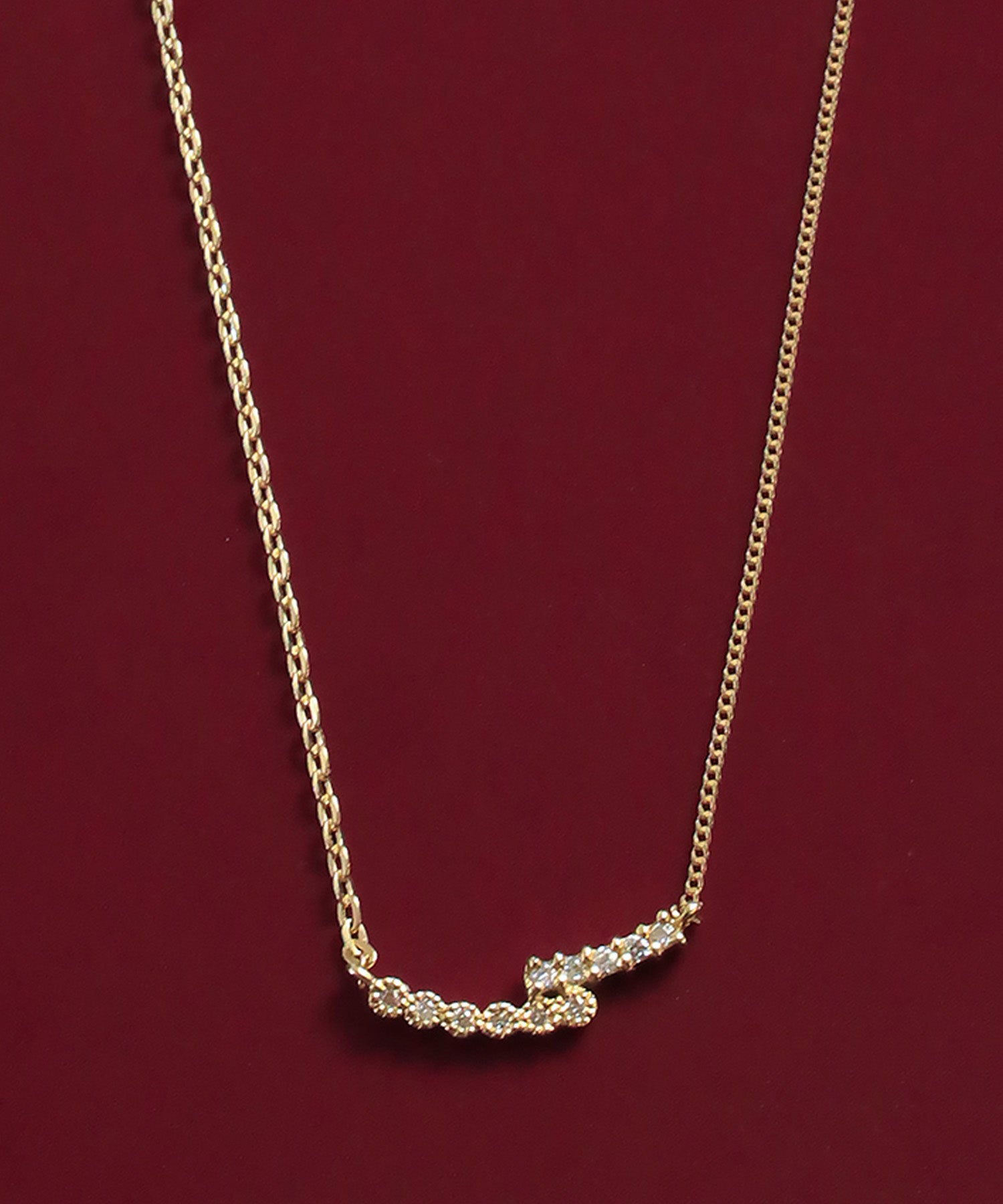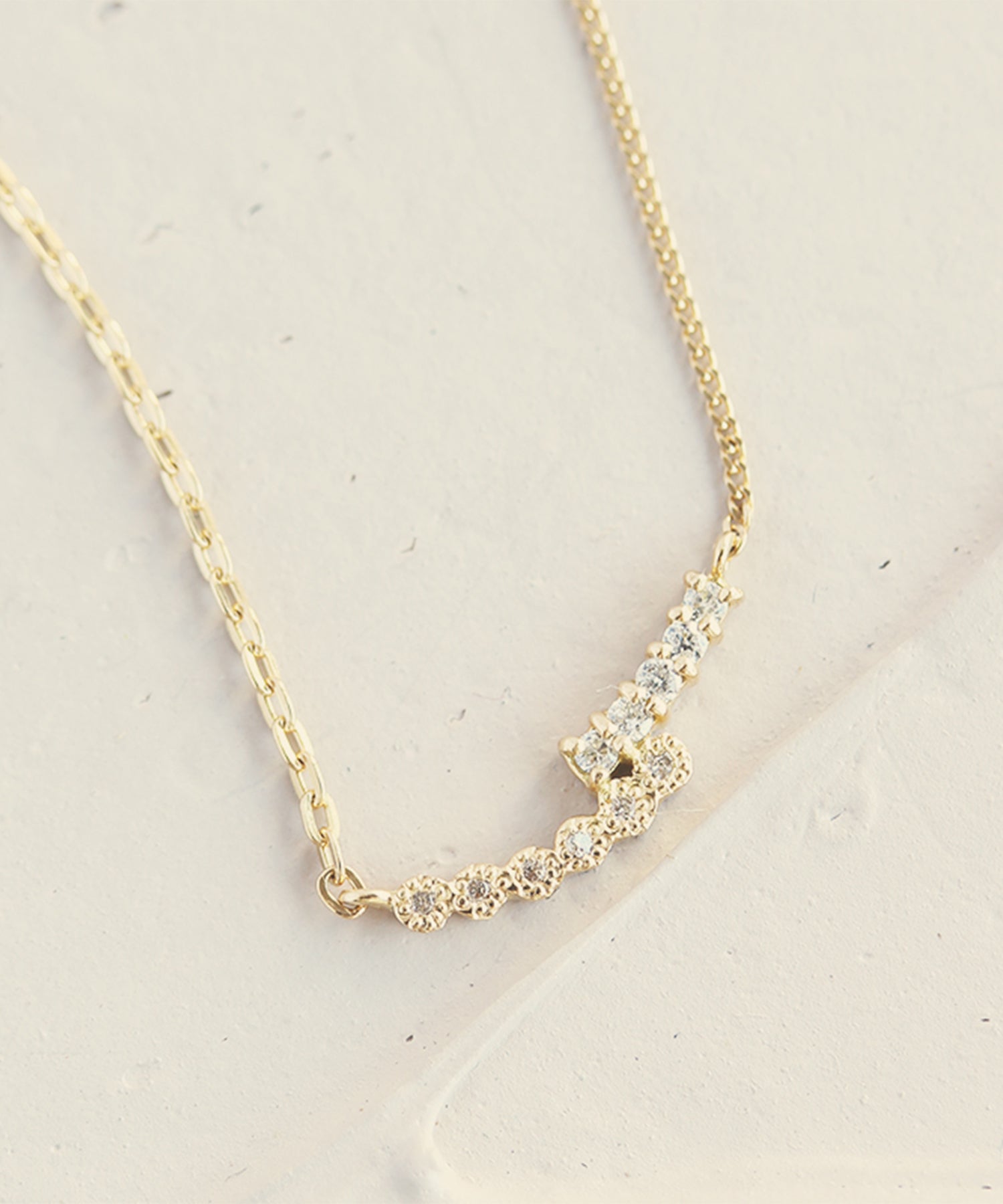 一粒のネックレスはもう持っているという方にもおすすめ。すっきりとしたスタイリッシュな印象のネックレスはじめました。留め方の違うダイヤモンドが重なり、さらに左右で異なるデザインのチェーンを繋げたネックレス。どんなお洋服にも合わせやすくお手持ちのネックレスとの重ね着けにもつかえる優秀なシルエットです。