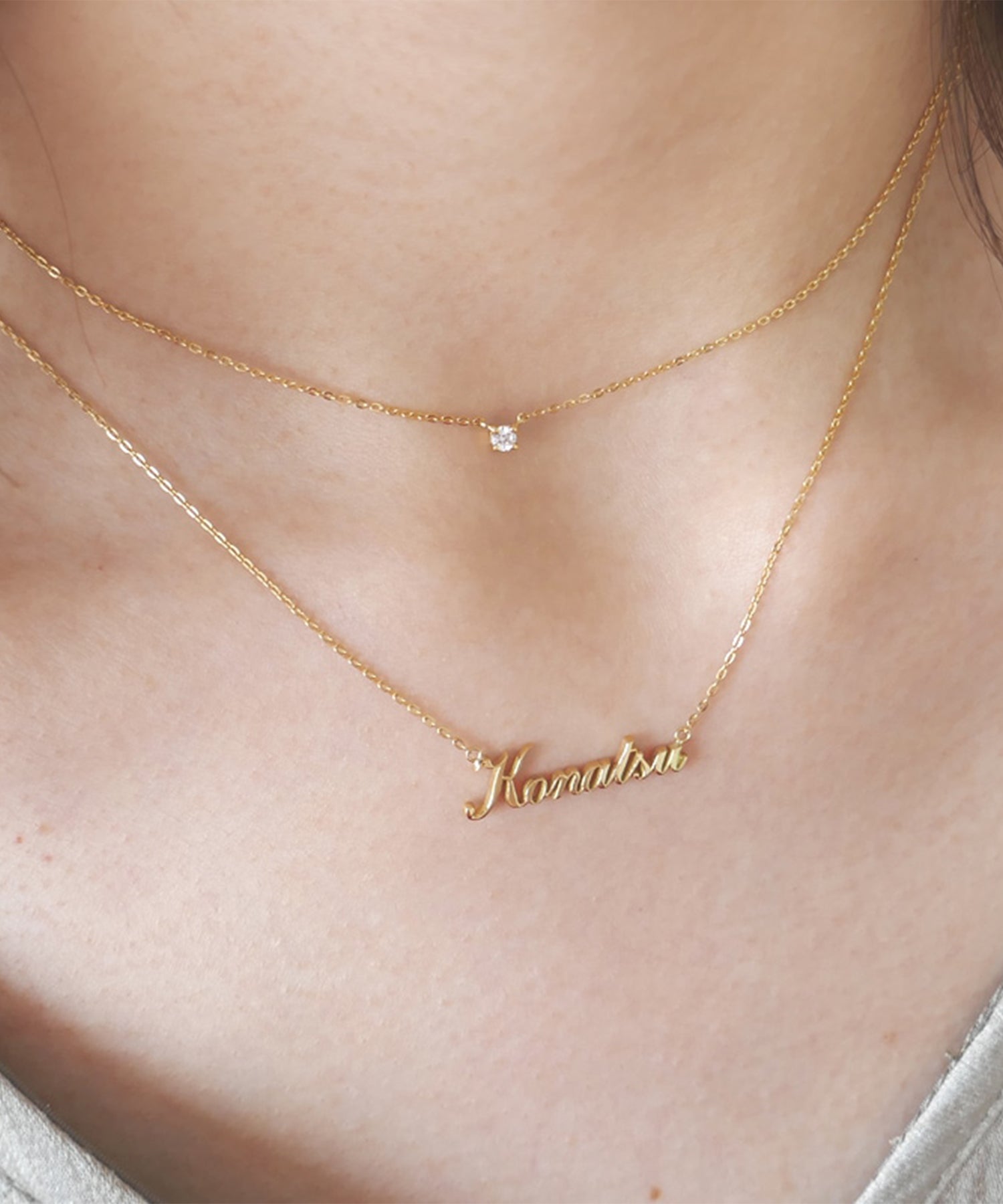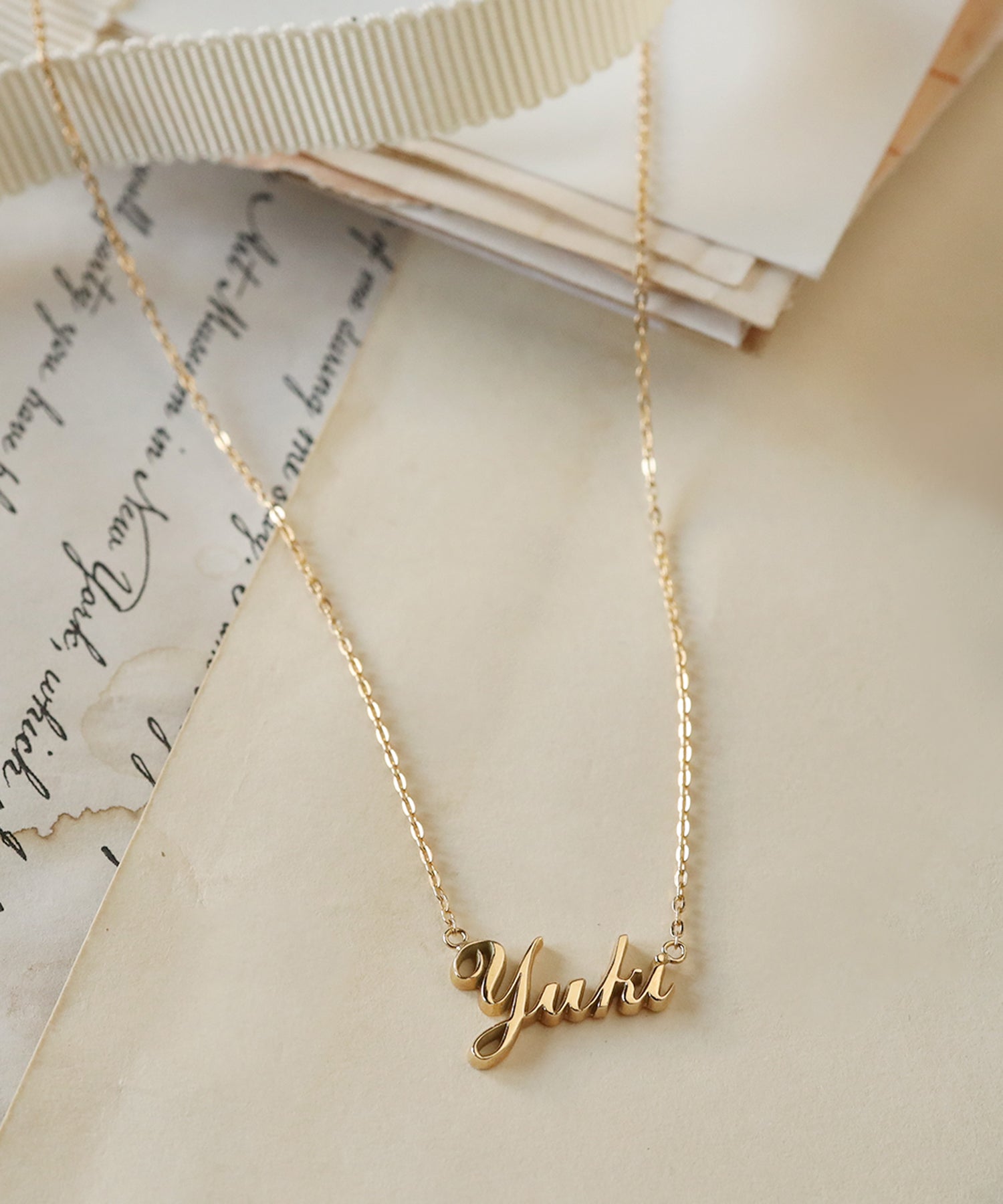 存在感たっぷりのネックレスは文字がはっきりとわかるのでより特別感が感じられるアイテムに。
