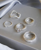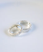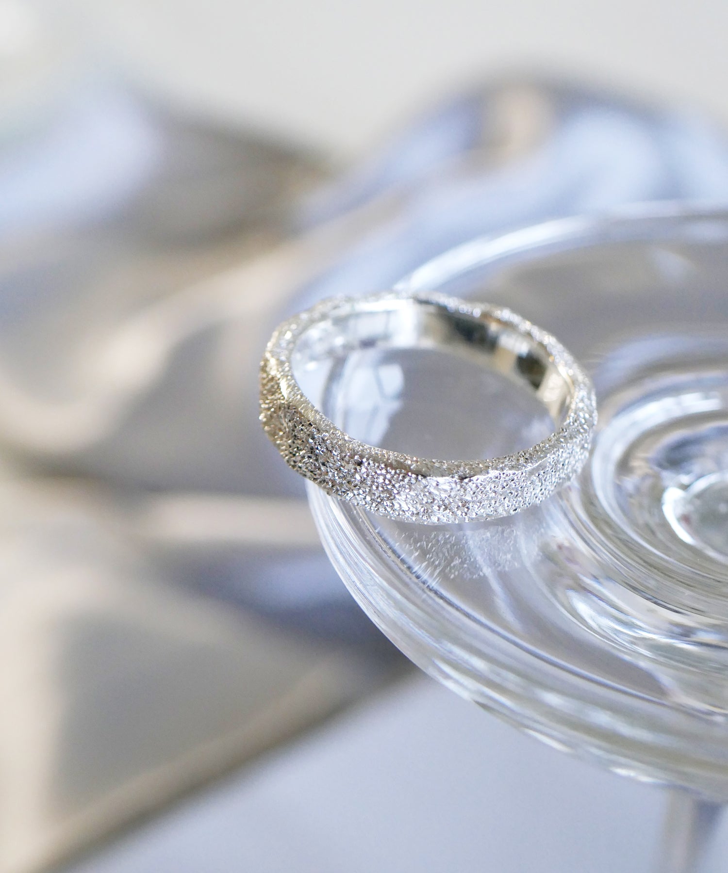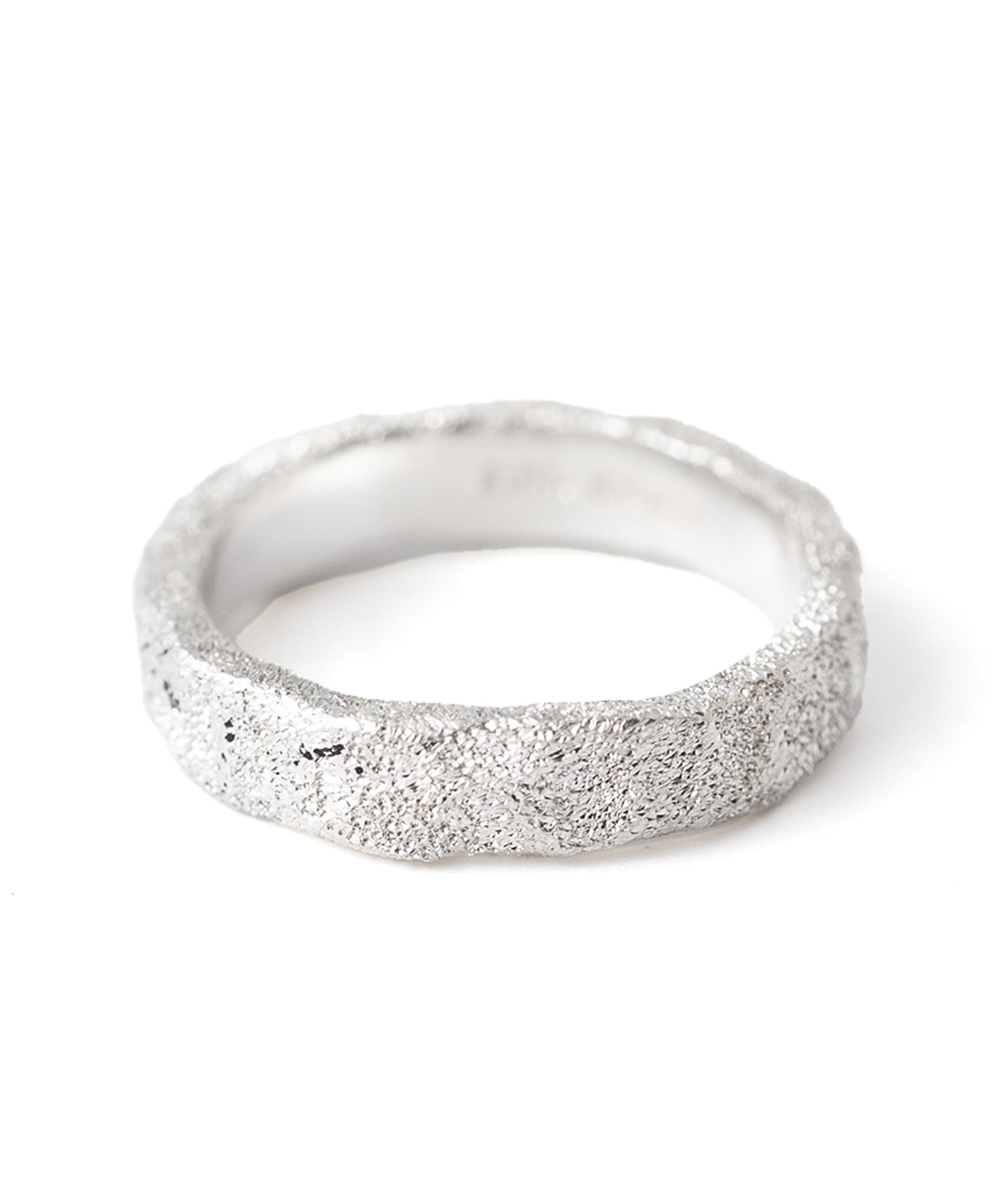 たたき加工でニュアンスを加えたシルバーのアームに、 スターダストのテクスチャーを施したシルバーリング。 内甲丸、またリングの内側は鏡面仕上げにすることで指触りもなめらかです。 シンプルだからこそテクスチャーの風合いが際立ち、コーディネートを華やげます。
