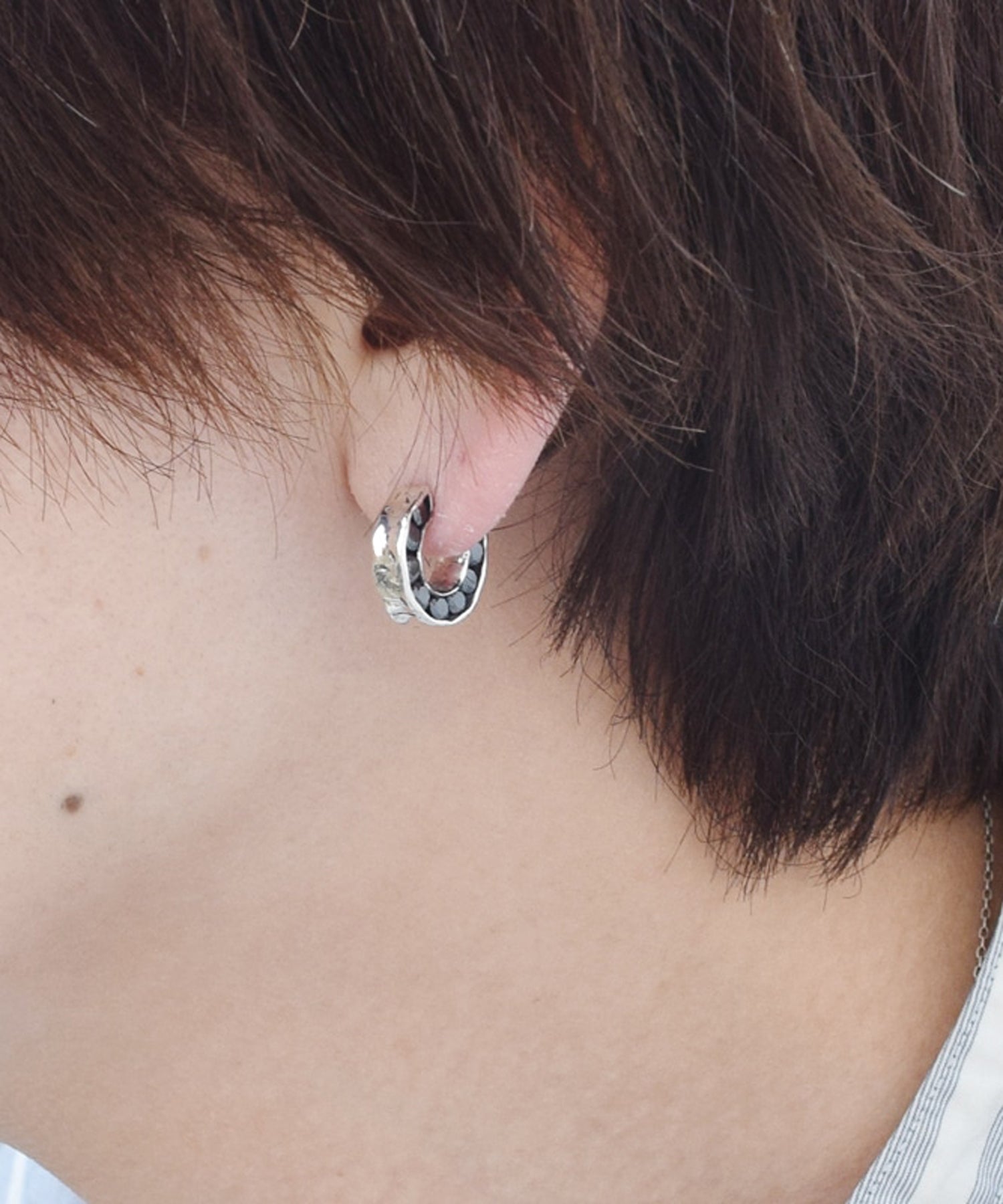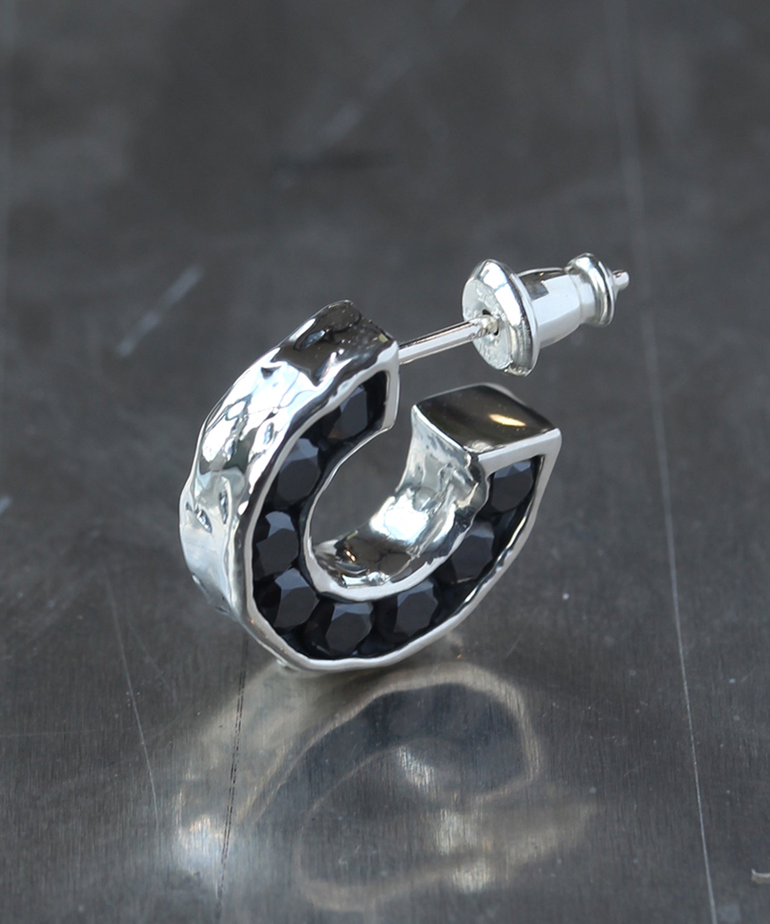 フープのピアスの両側面にキュービックジルコニアを敷き詰めたインパクトフルなデザイン。