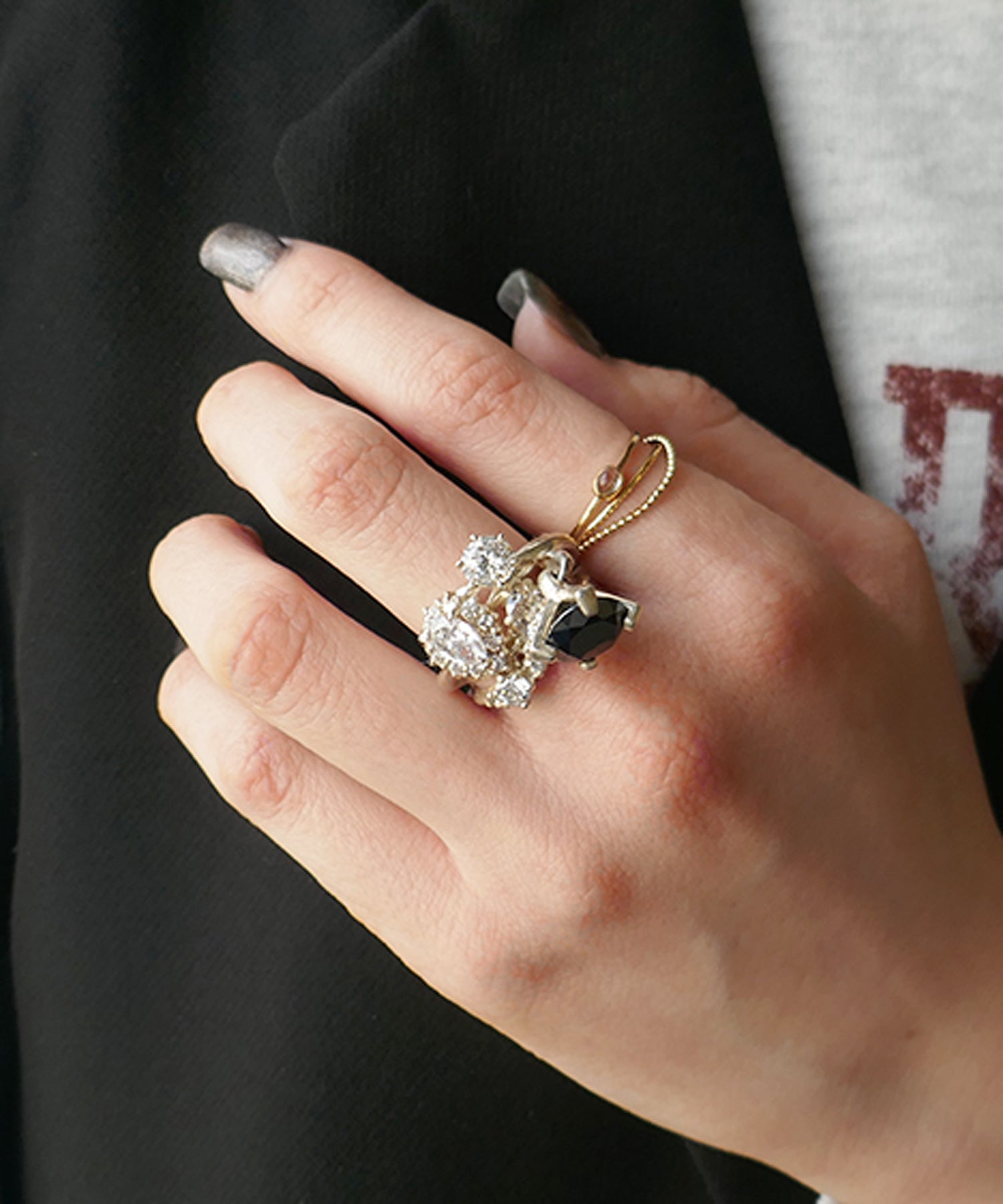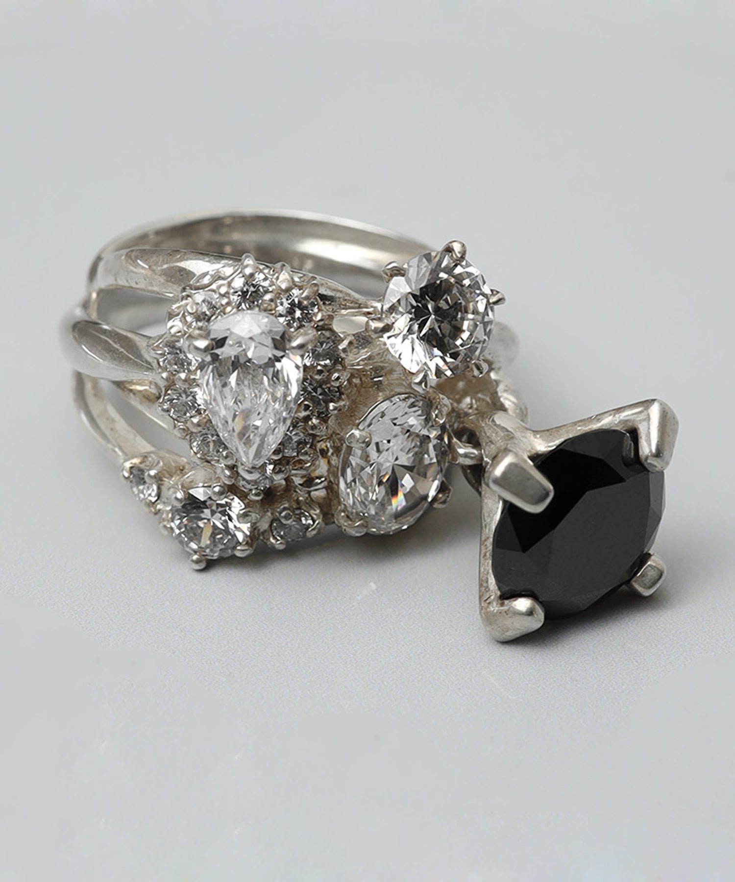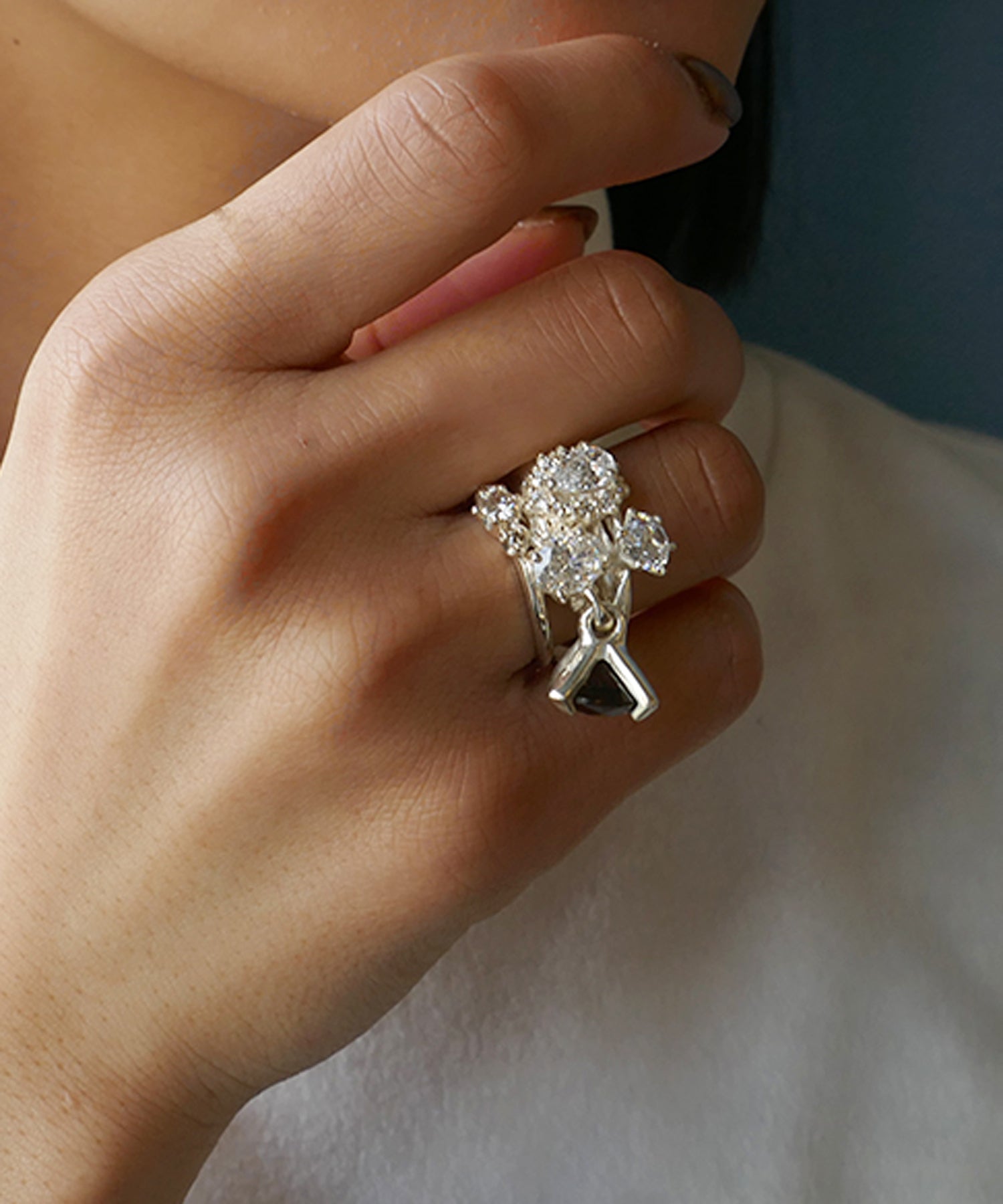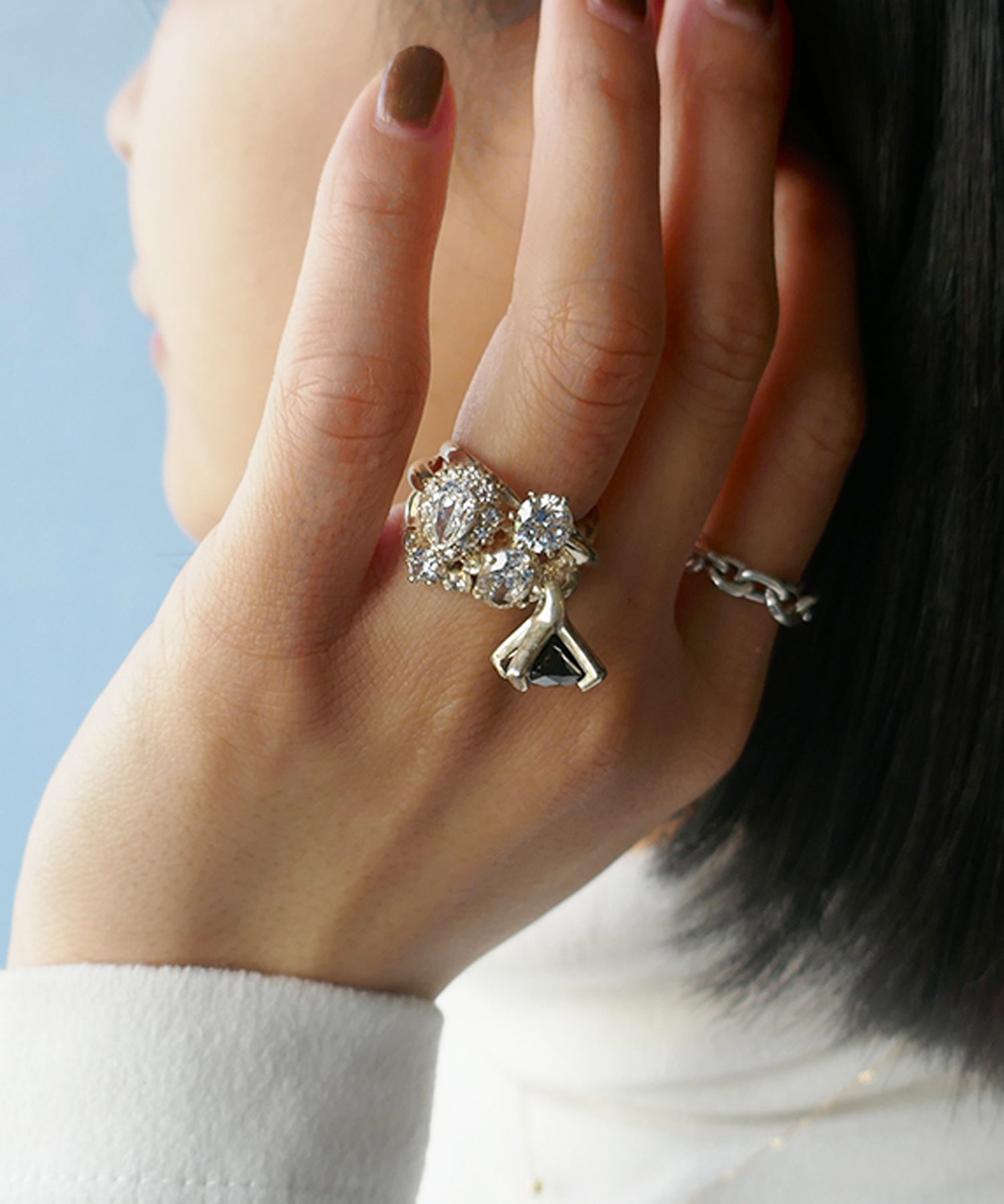 何本ものリングを重ねたような存在感。 手を動かすと揺れる1石と 異なるシェイプのジルコニアが作る煌めきを楽しんで。