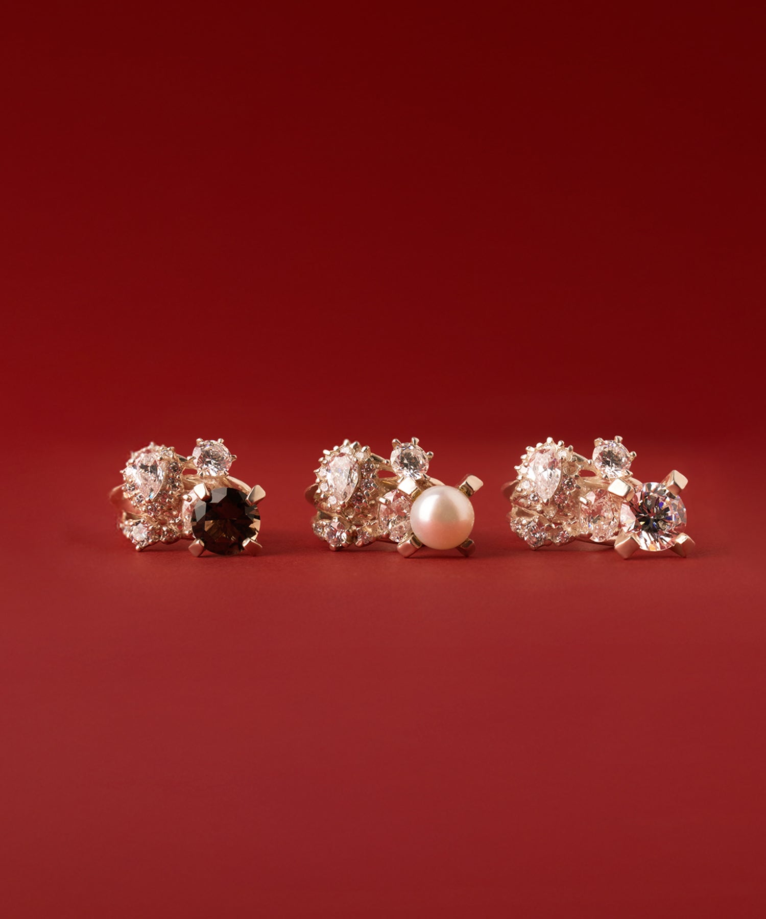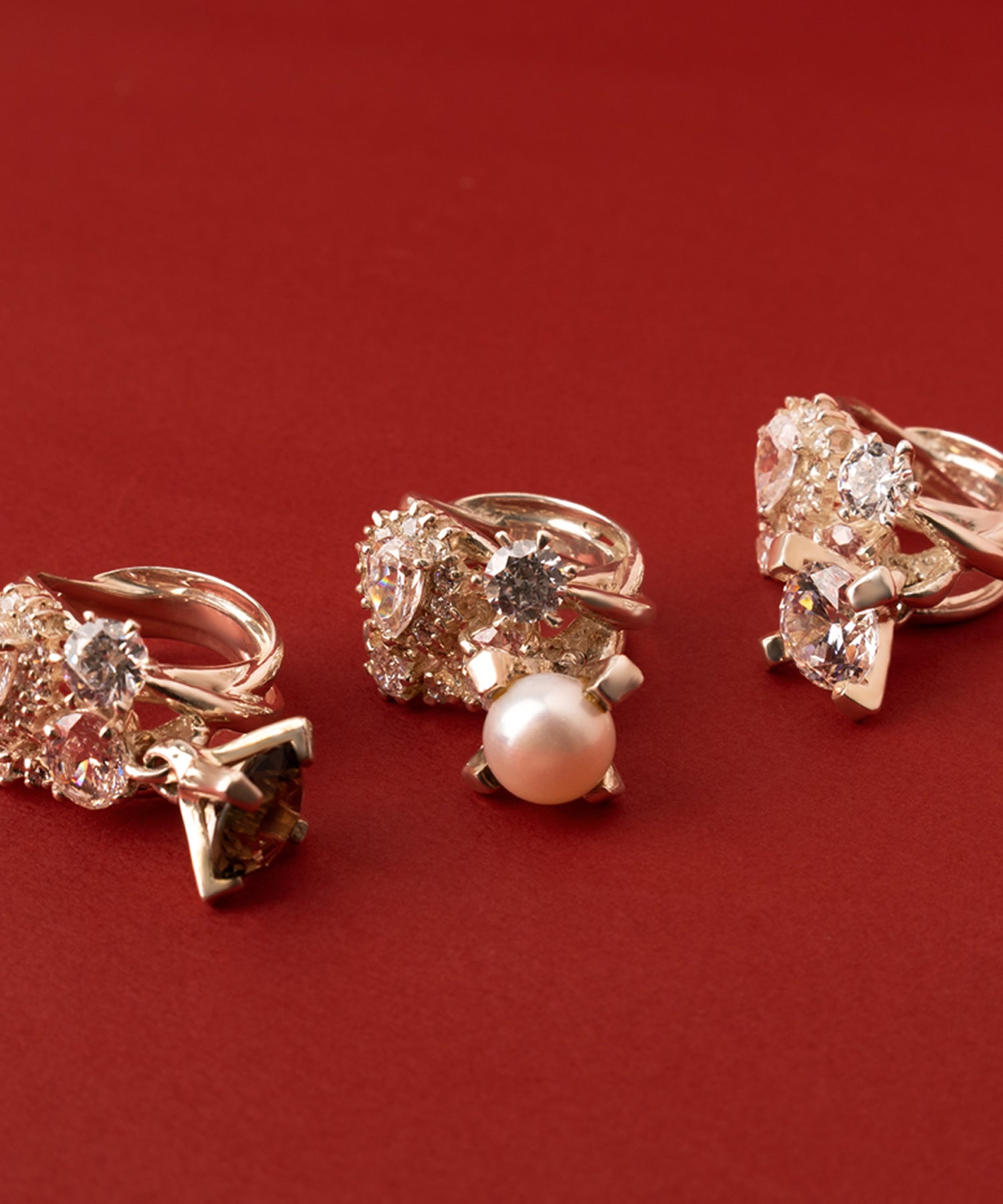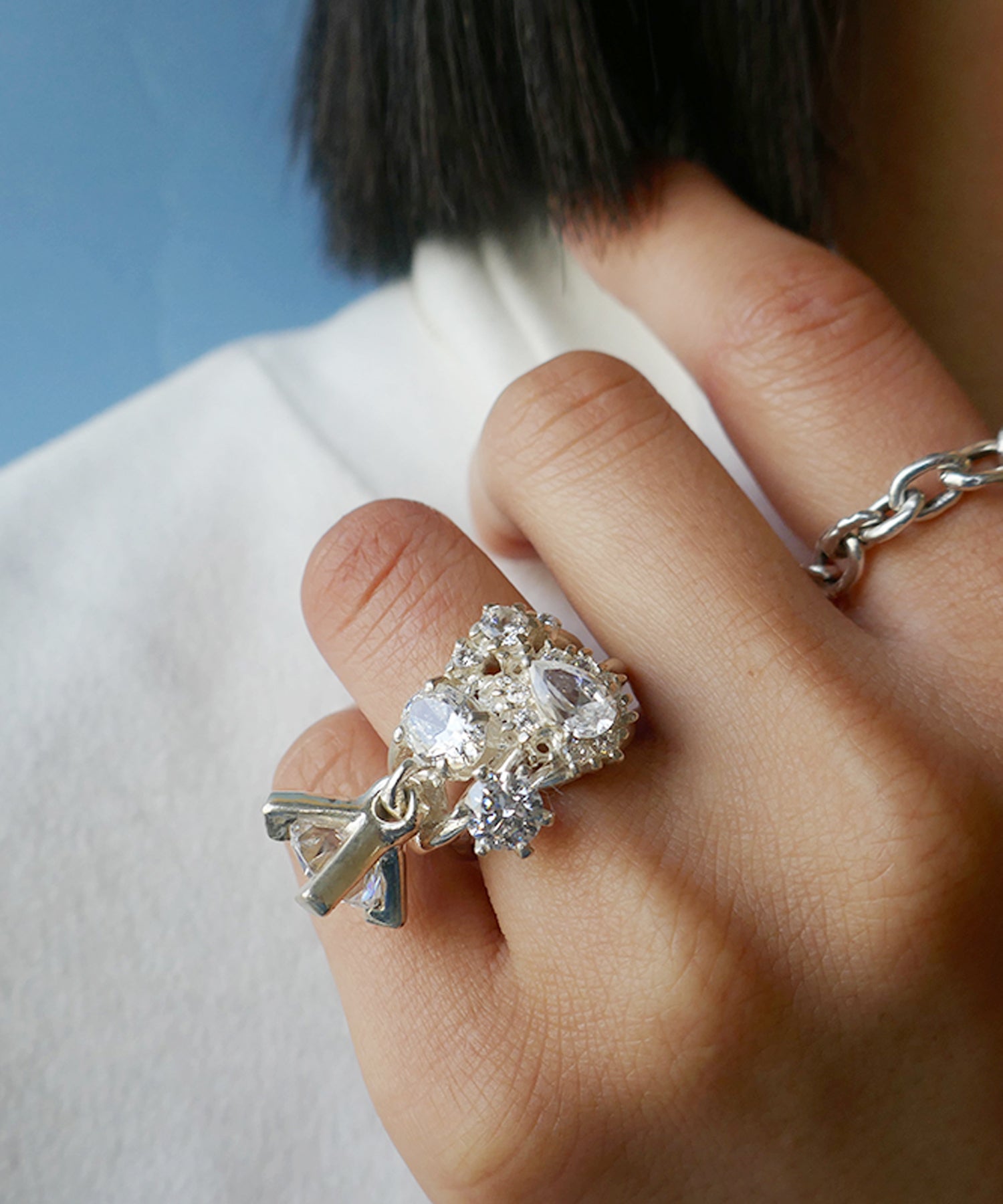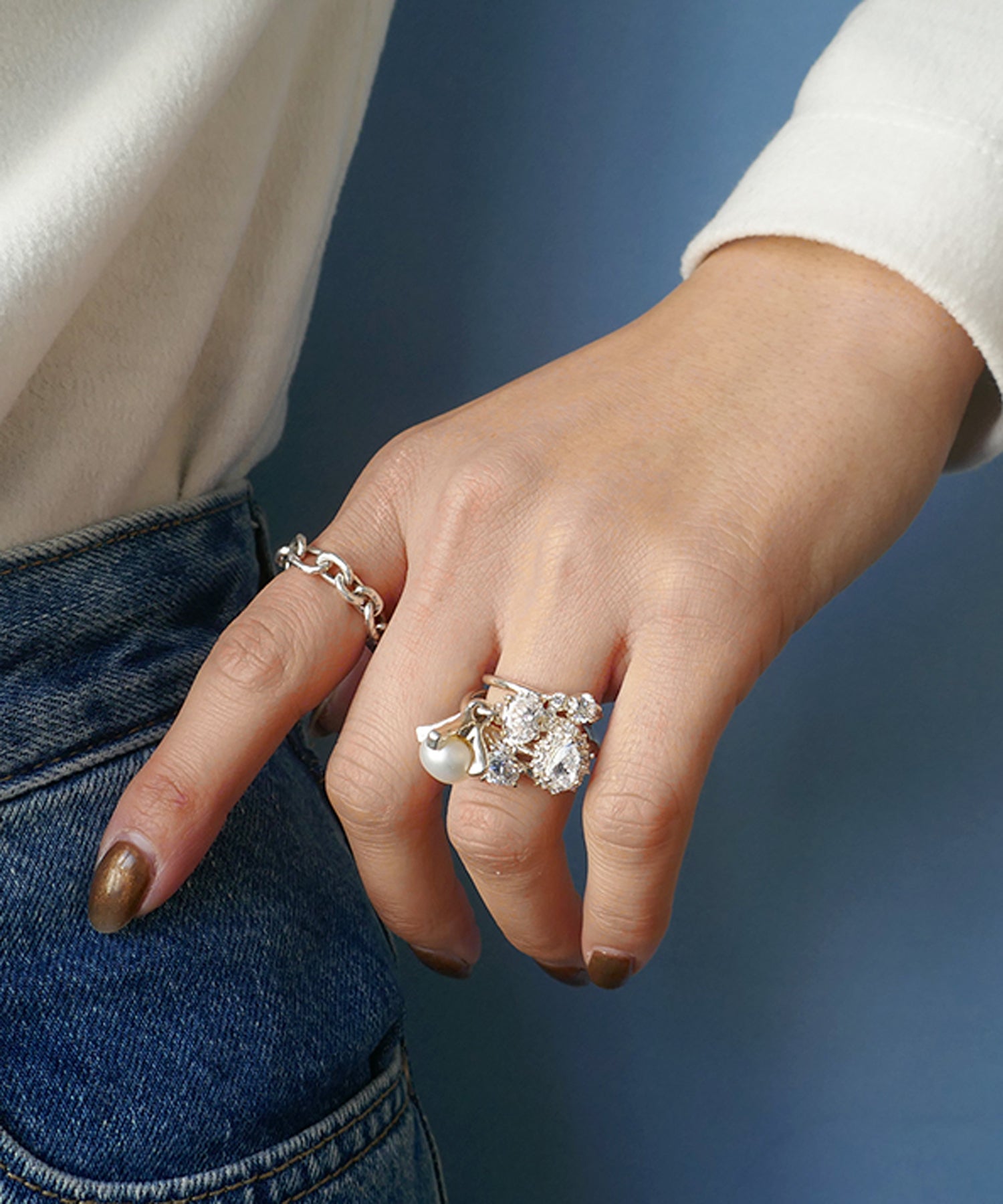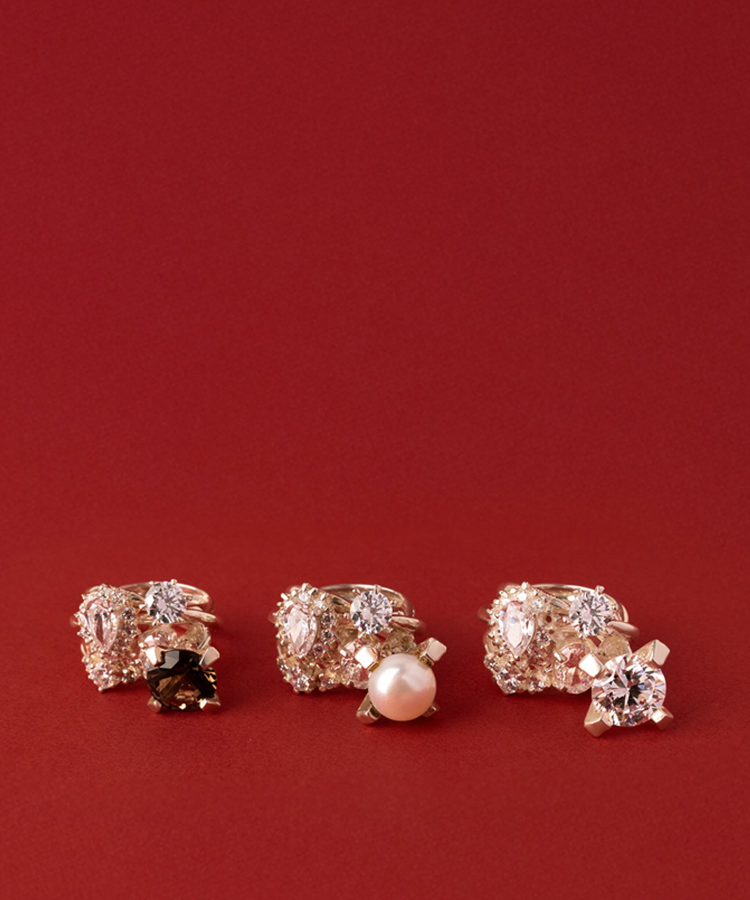 何本ものリングを重ねたような存在感。 手を動かすと揺れる1石と 異なるシェイプのジルコニアが作る煌めきを楽しんで。