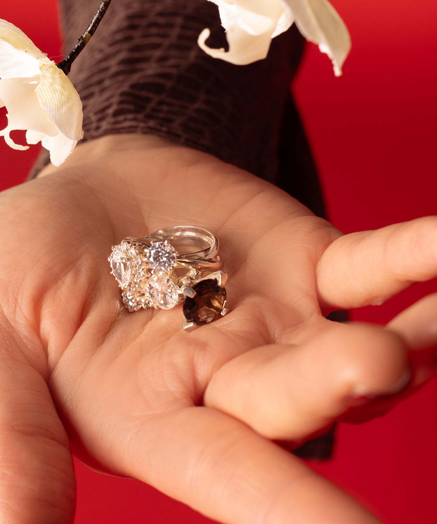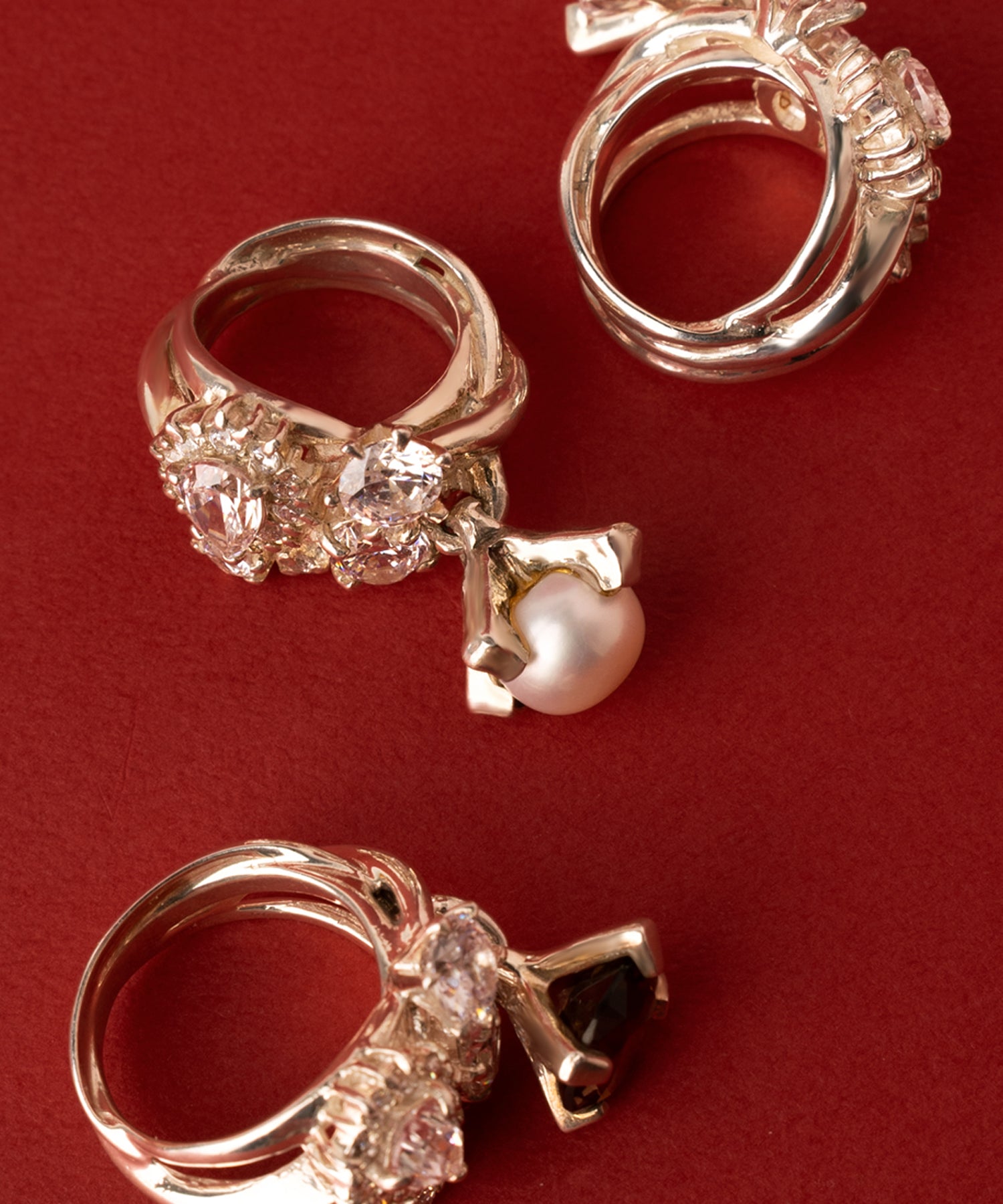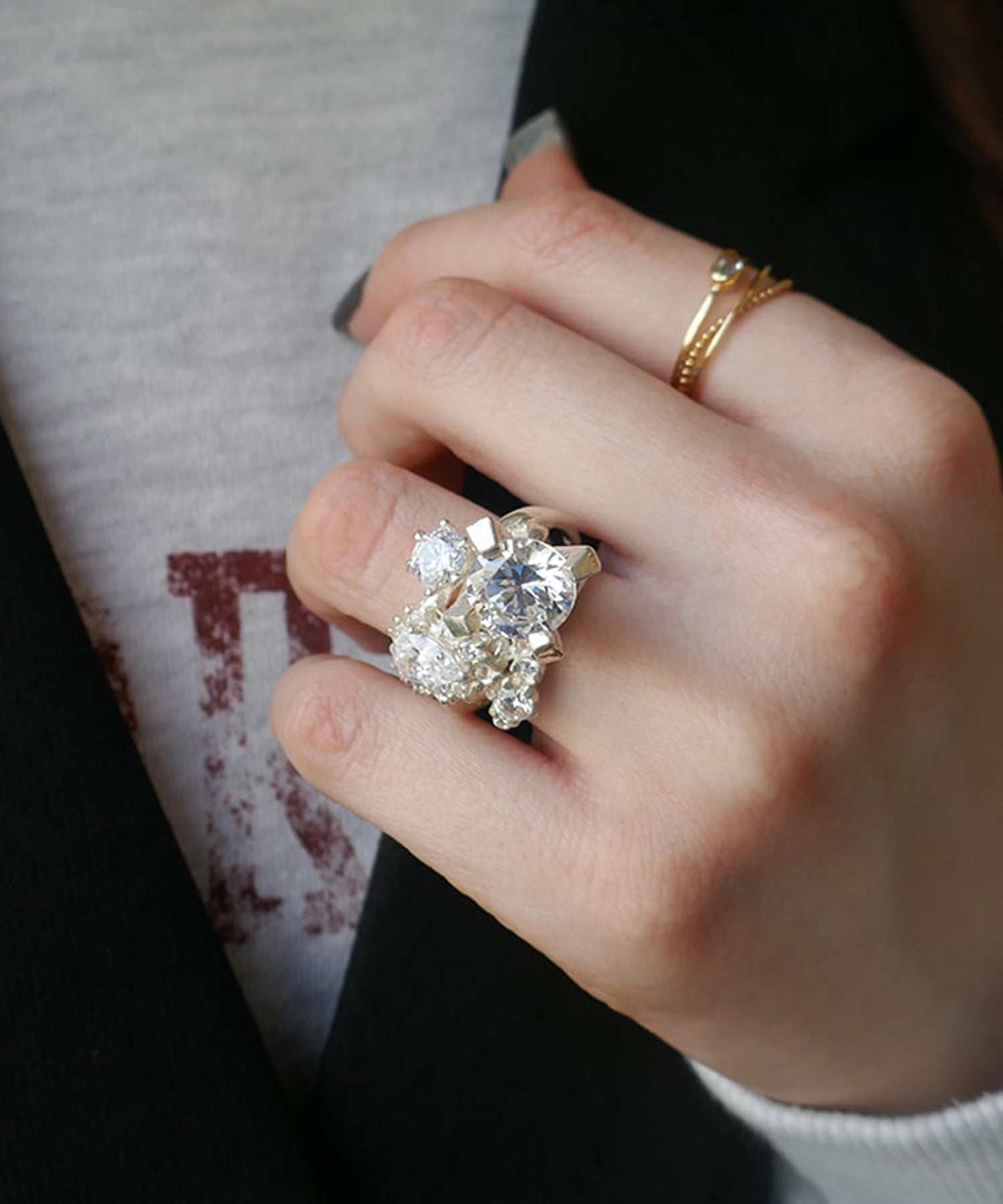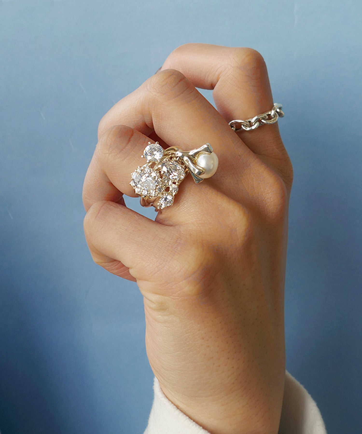 何本ものリングを重ねたような存在感。 手を動かすと揺れる1石と 異なるシェイプのジルコニアが作る煌めきを楽しんで。