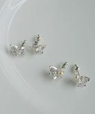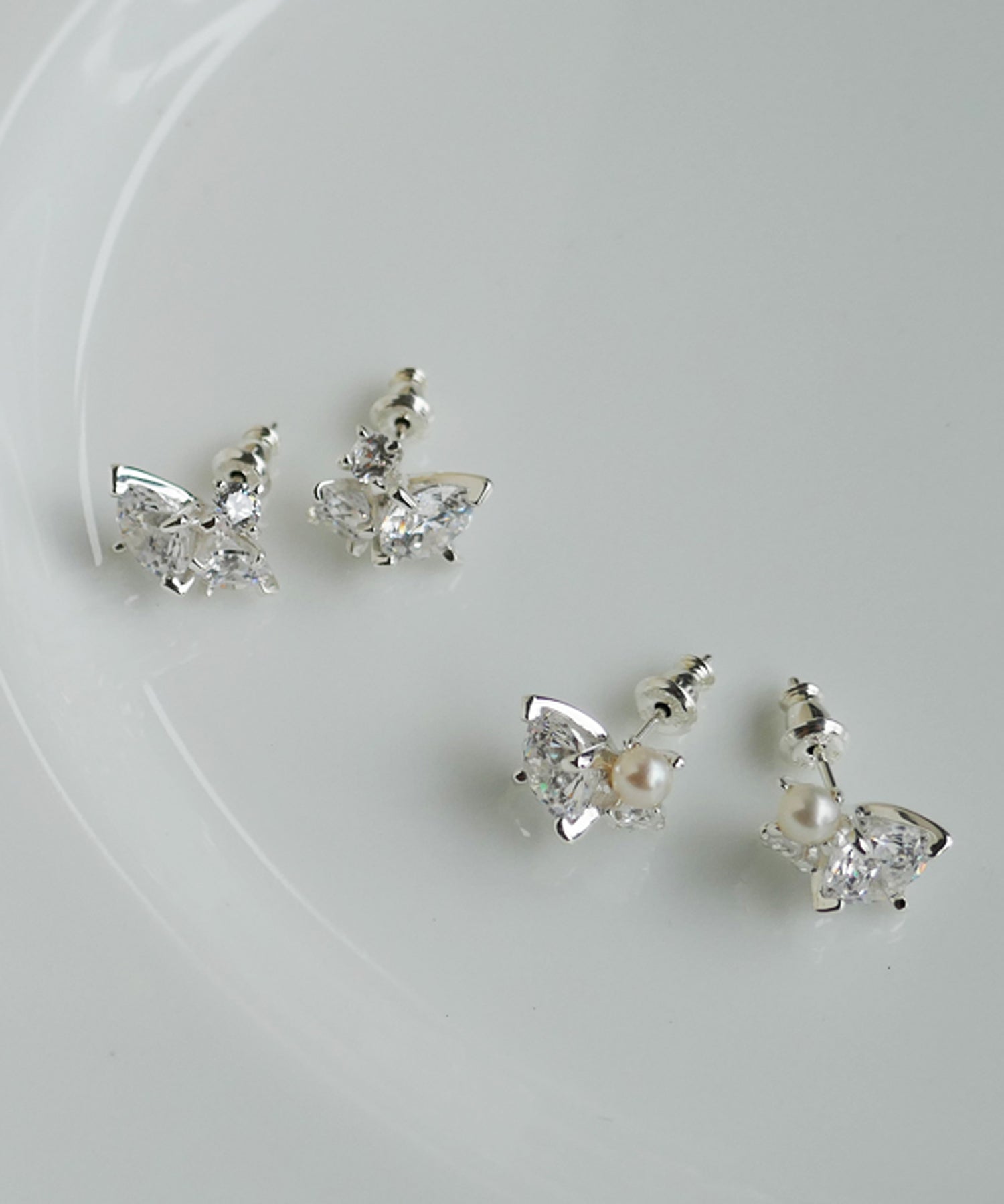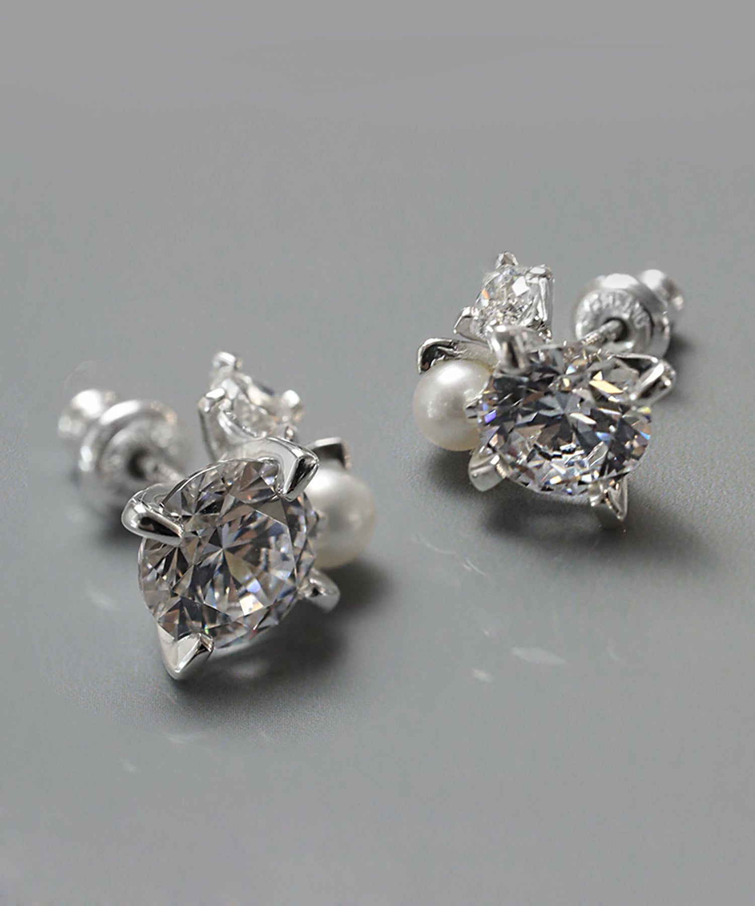サイズの異なるキュービックジルコニアと、ナチュラルカラーのパールの3石を寄せ合わせてセッティングしたシルバーピアス。(両耳セット)
