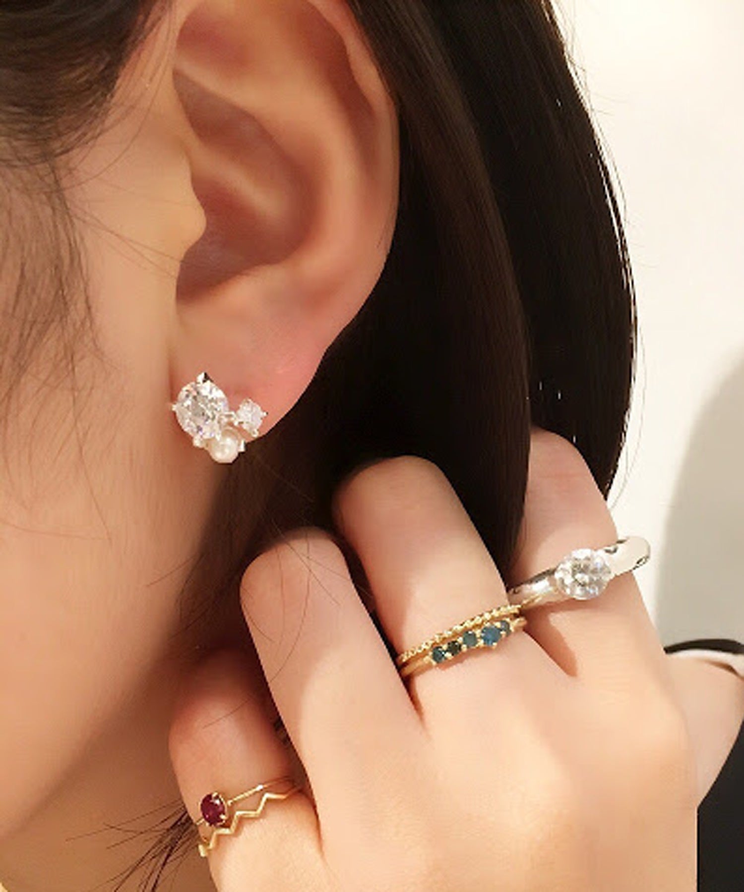 キュービックジルコニアの美しい輝きと、e.m.の特徴的な存在感のある石座の組み合わせは、普段のカジュアルなコーディーネートからパーティーシーンまで幅広いスタイリングにマッチします。