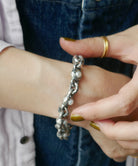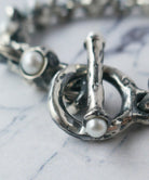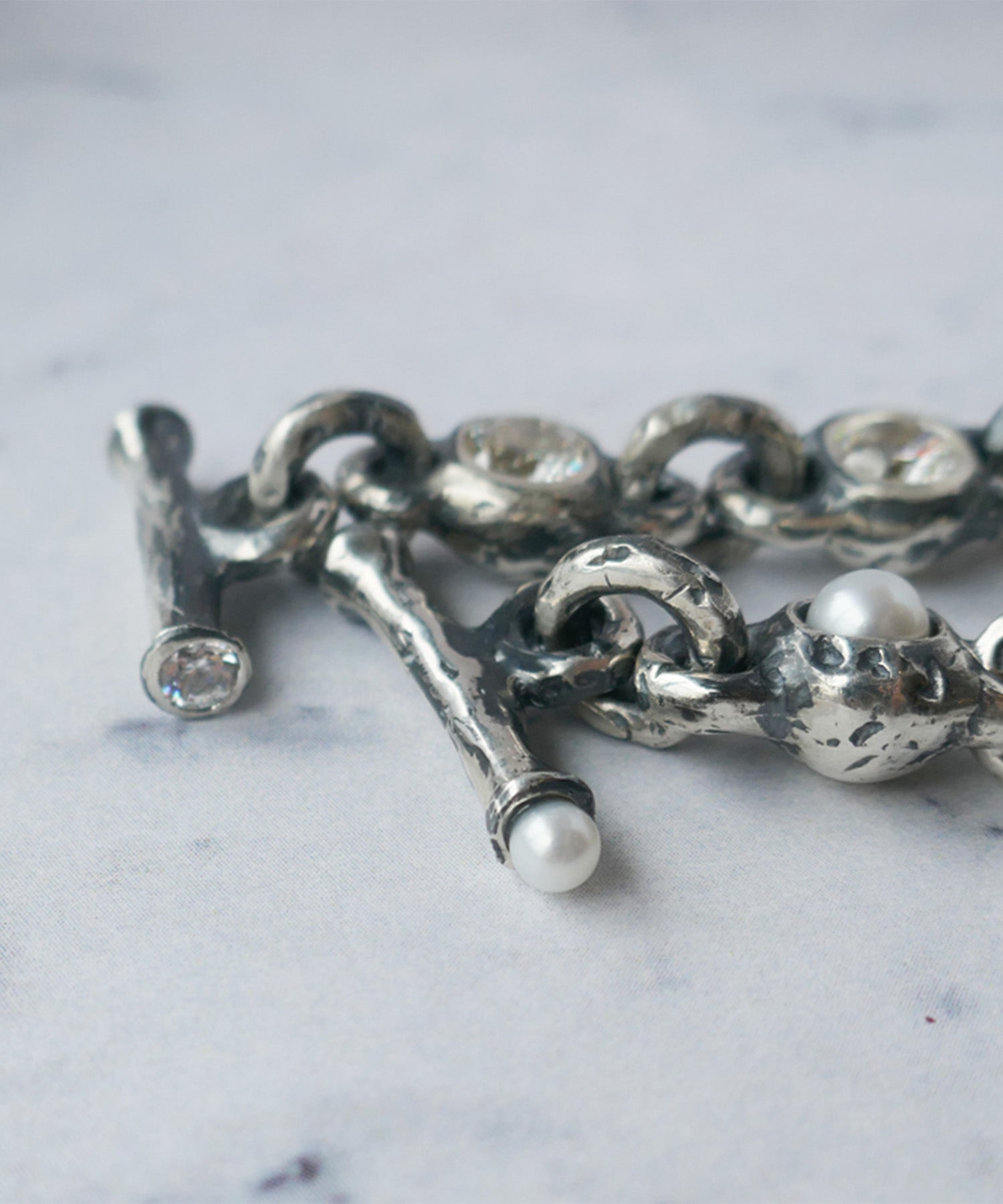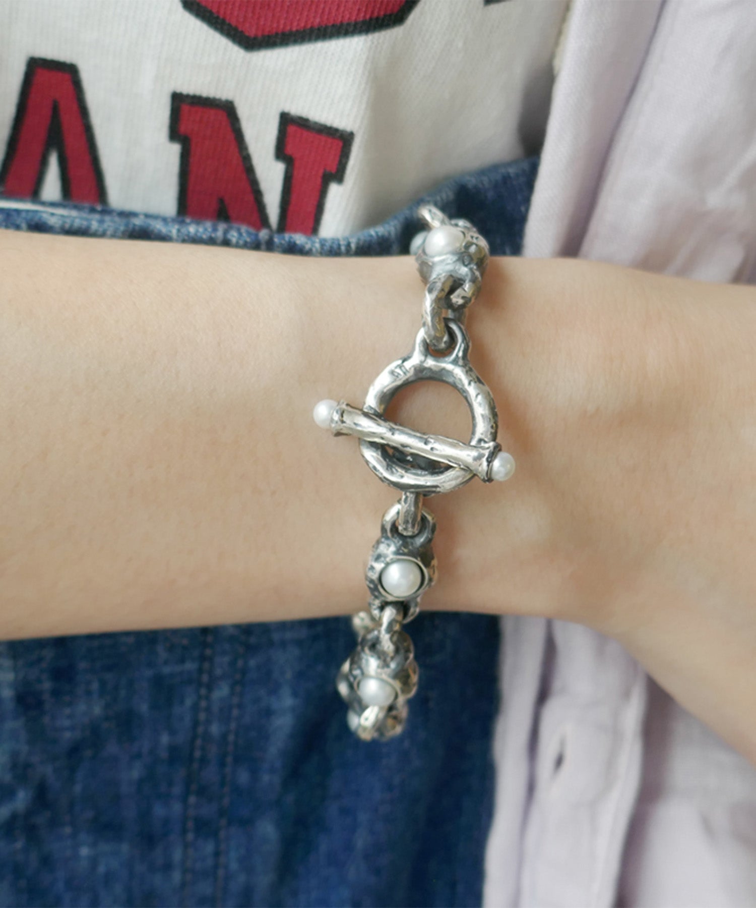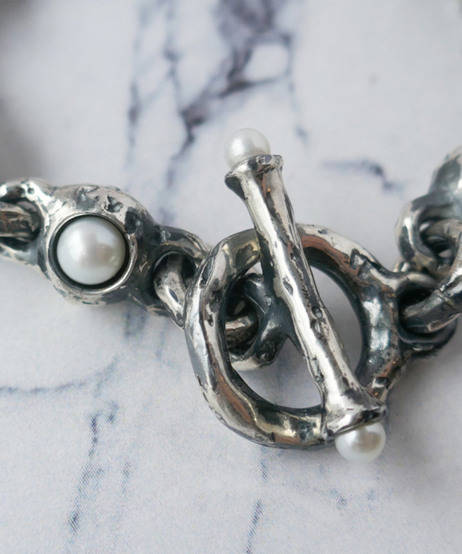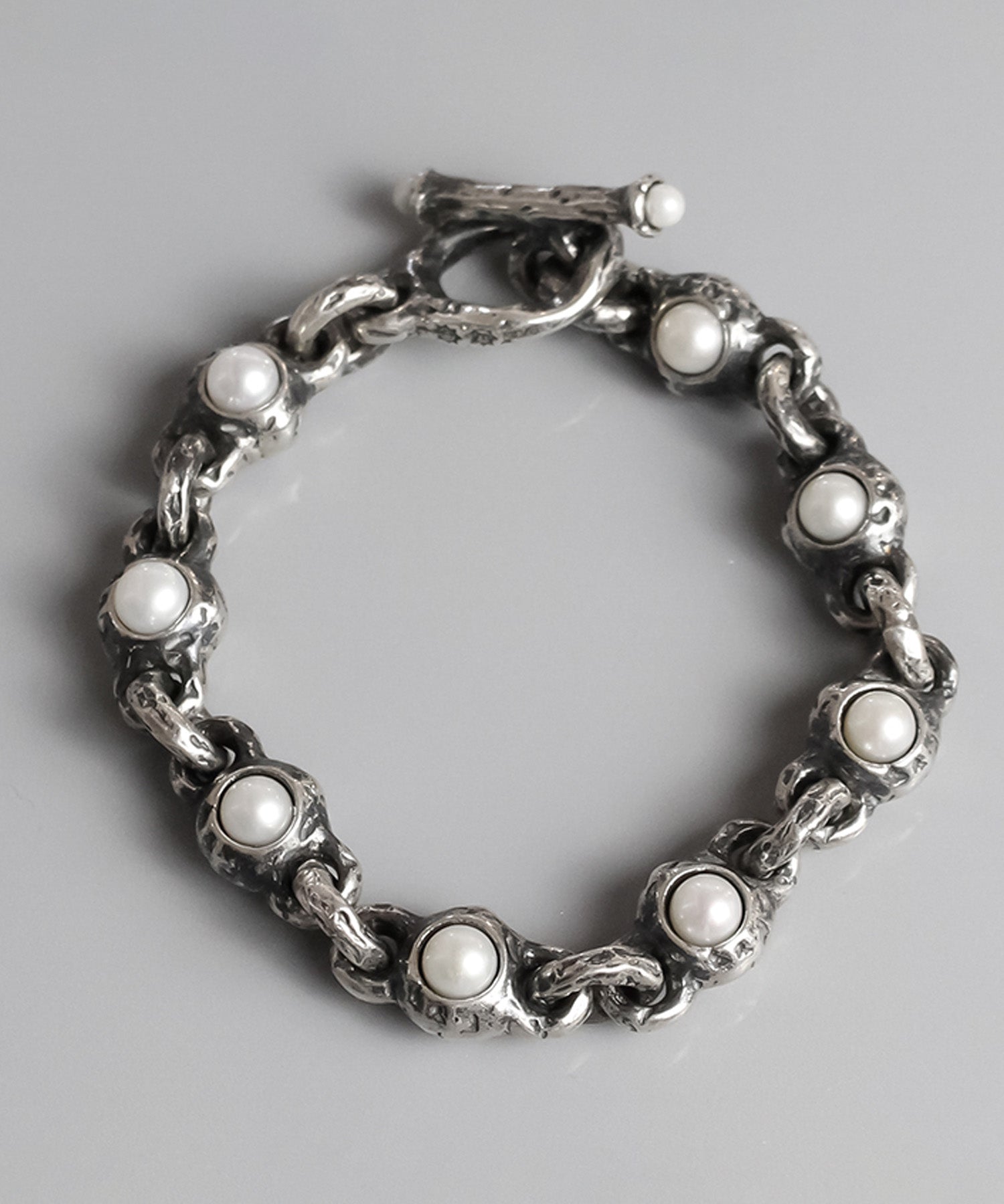 シルバーのハードなデザインにパールをあしらったブレスレット。