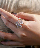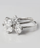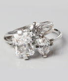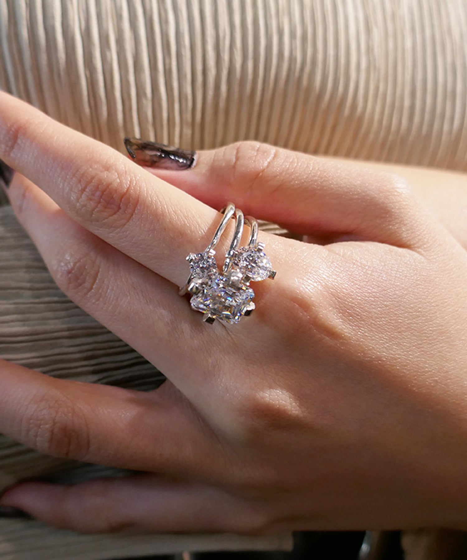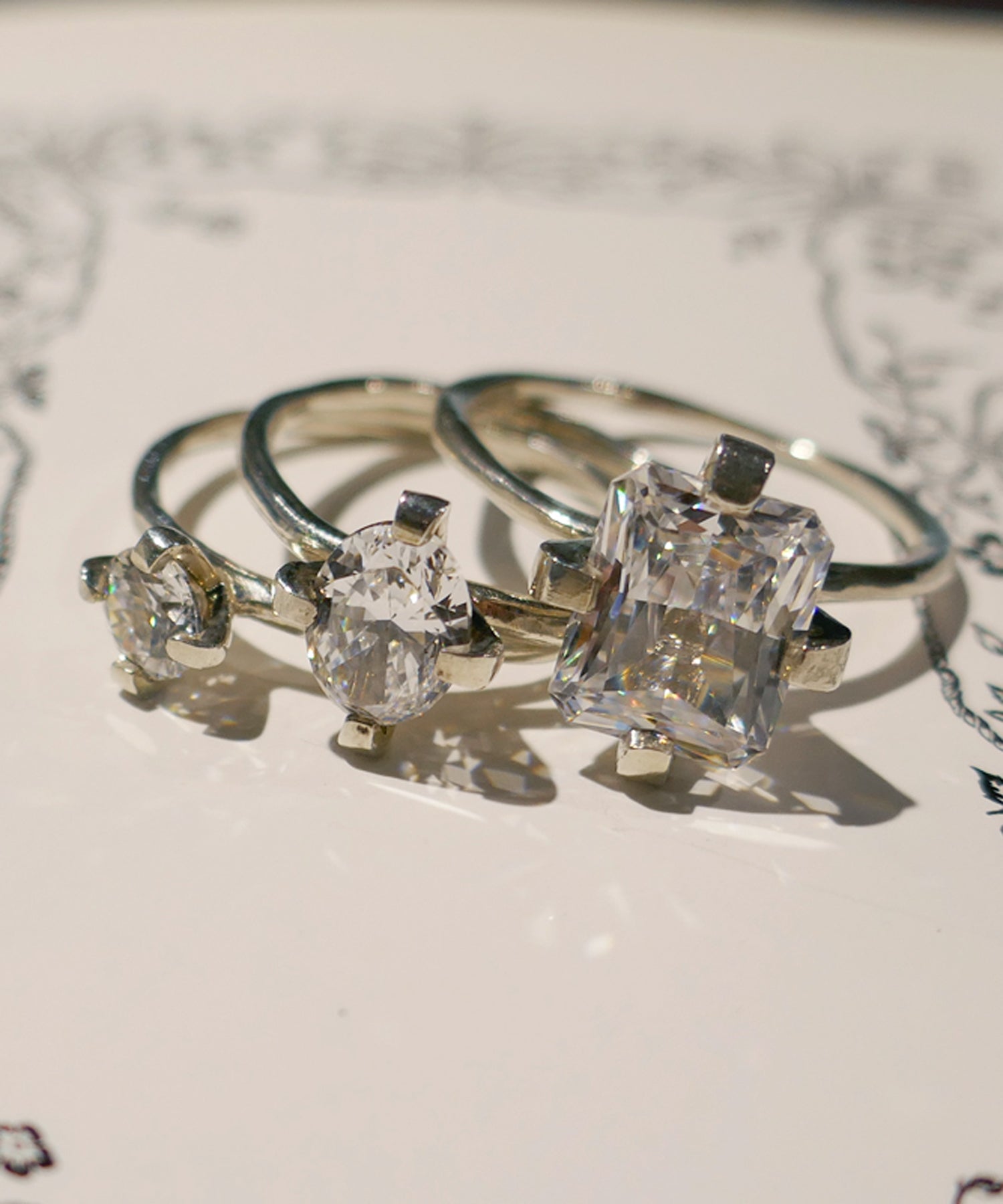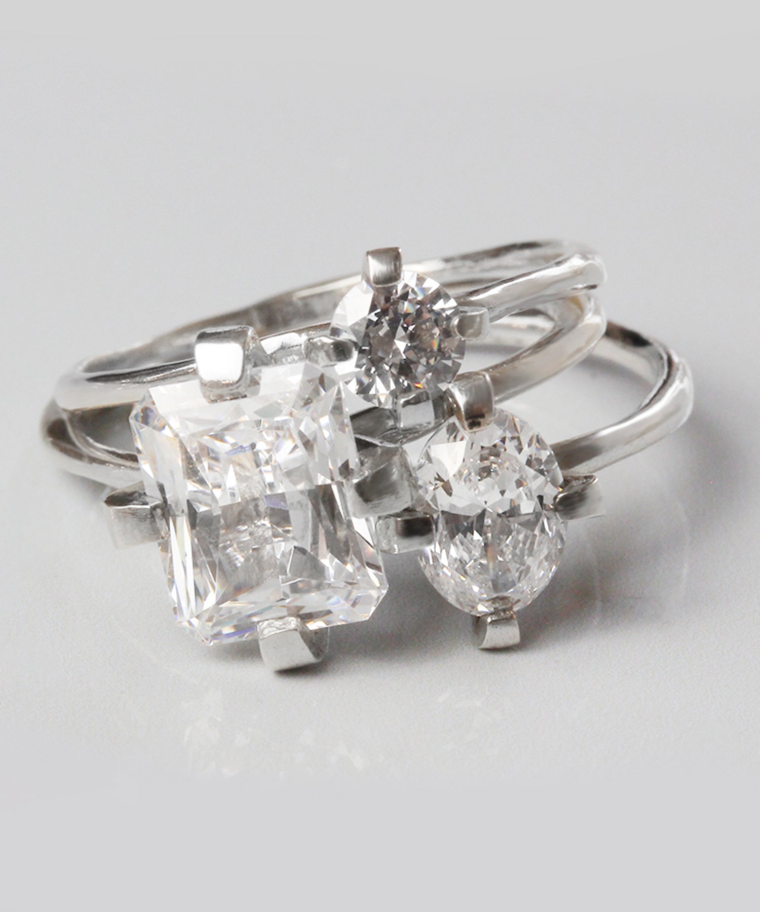 ぞれぞれ形の違うキュービックジルコニアがセッティングされた3連リング。キュービックジルコニアを左右にずらし