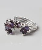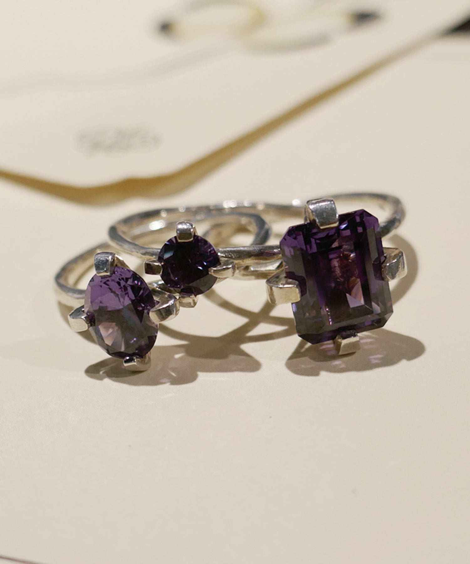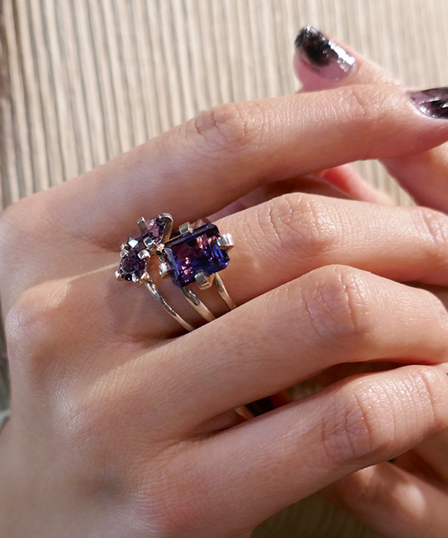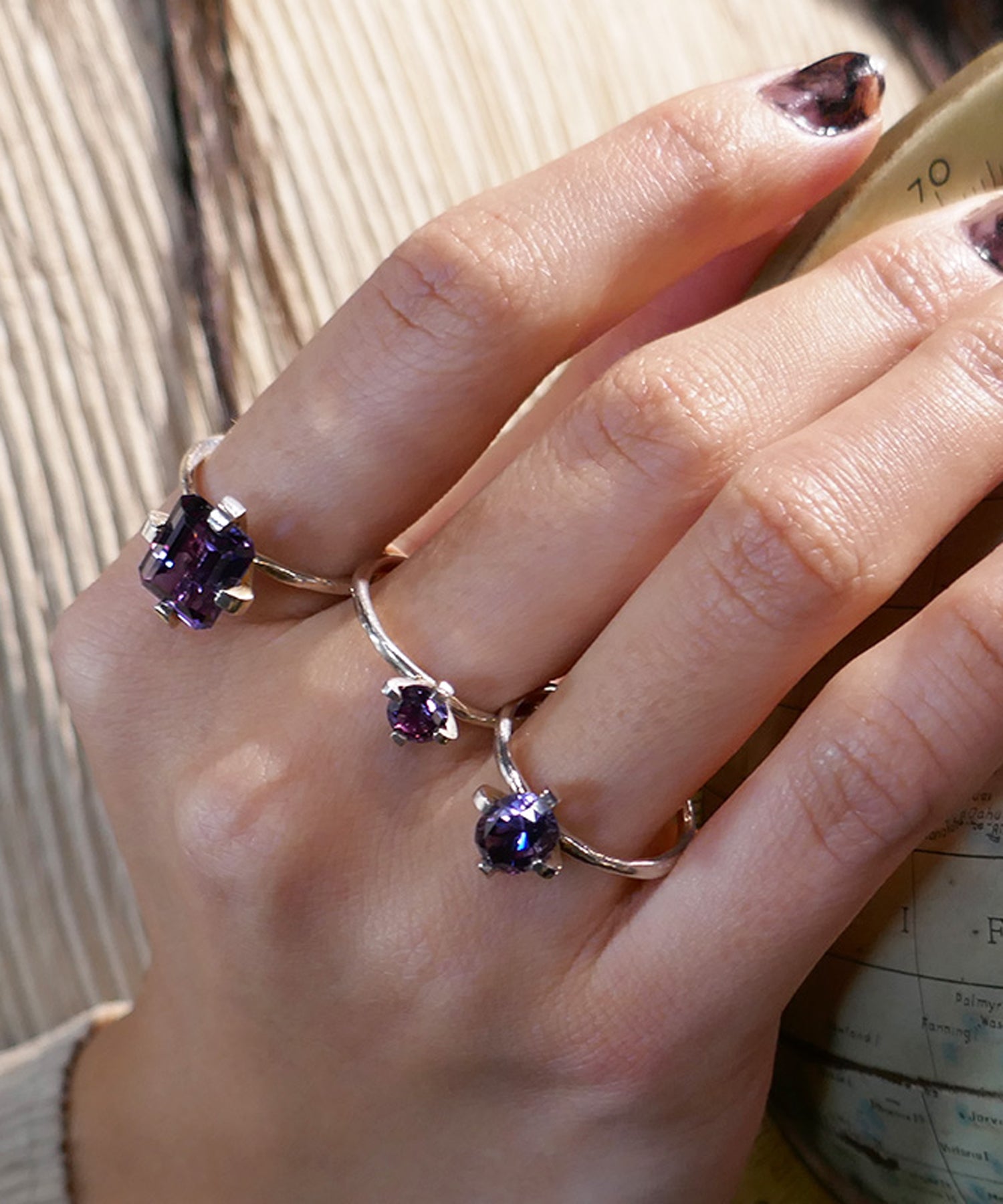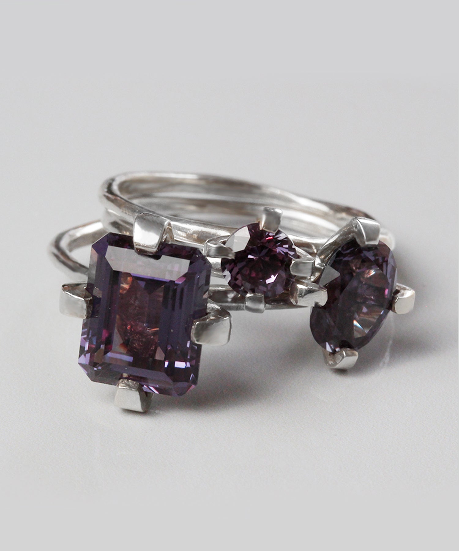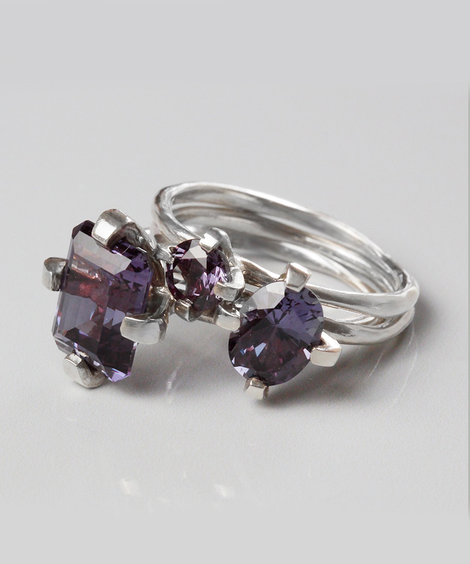 ぞれぞれ形の違うジルコニアがセッティングさた3連リング。