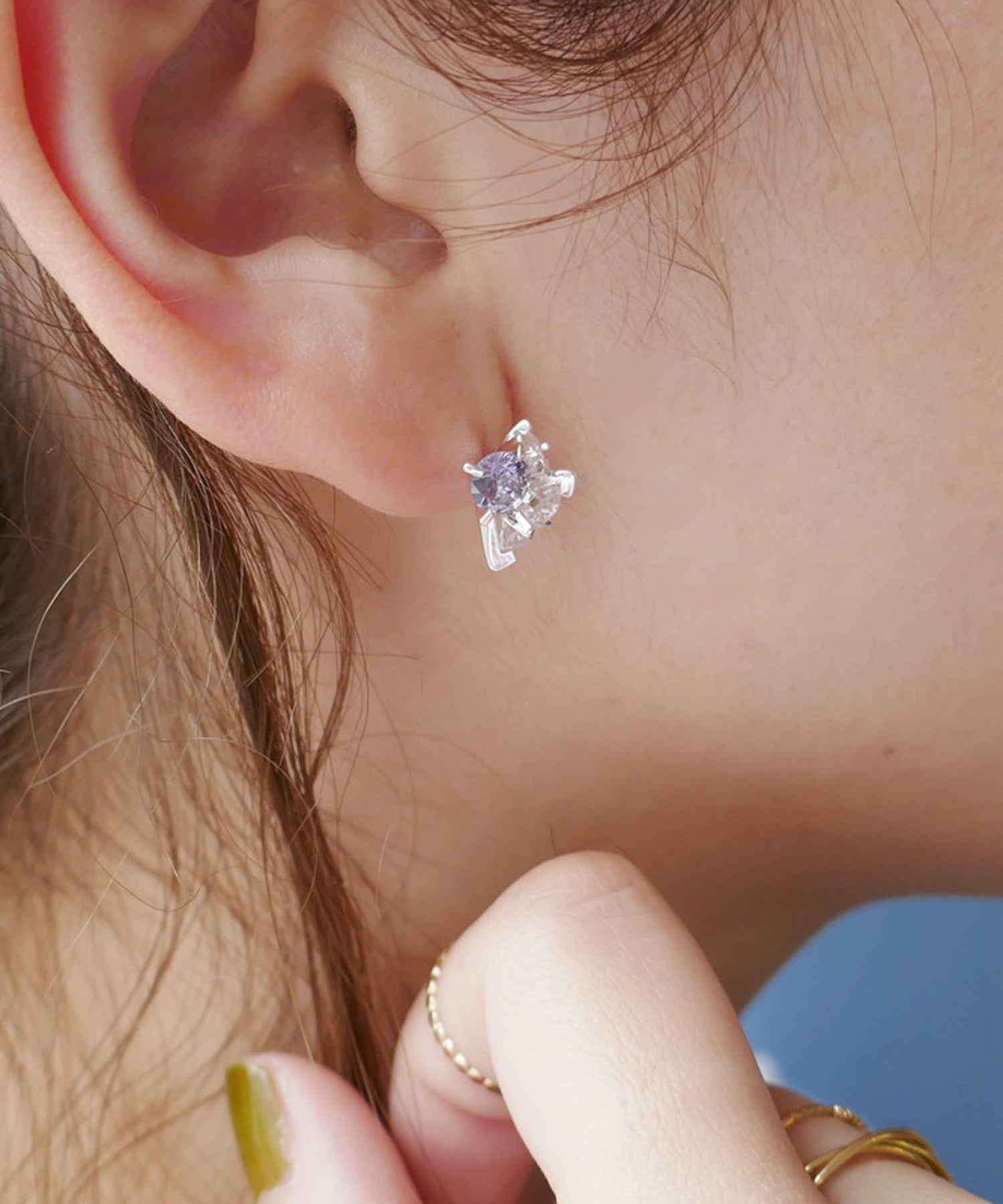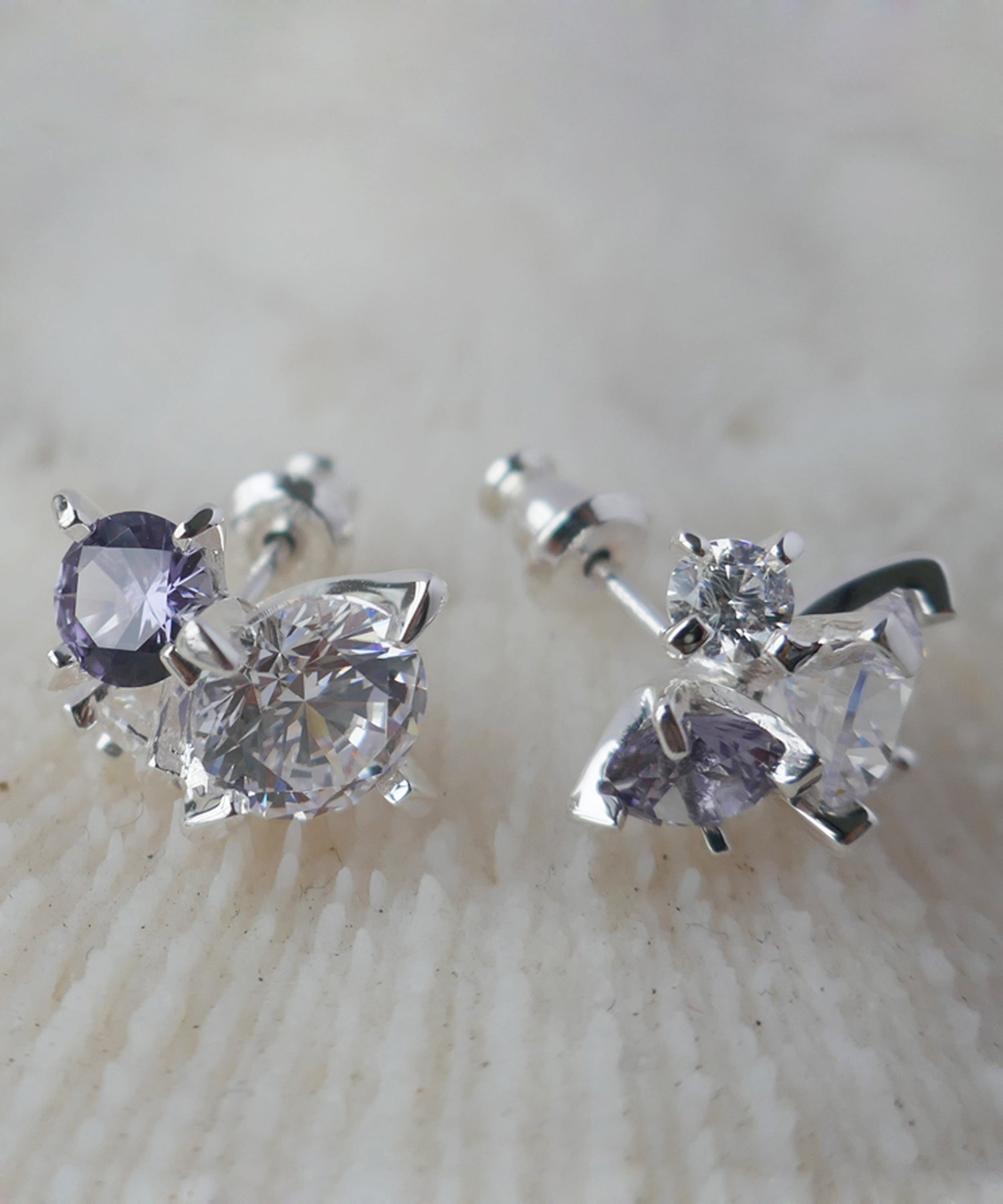 サイズの異なるキュービックジルコニアと、パープルの合成アレキサンドライトの3石を寄せ合わせてセッティングしたシルバーピアス。(両耳セット)