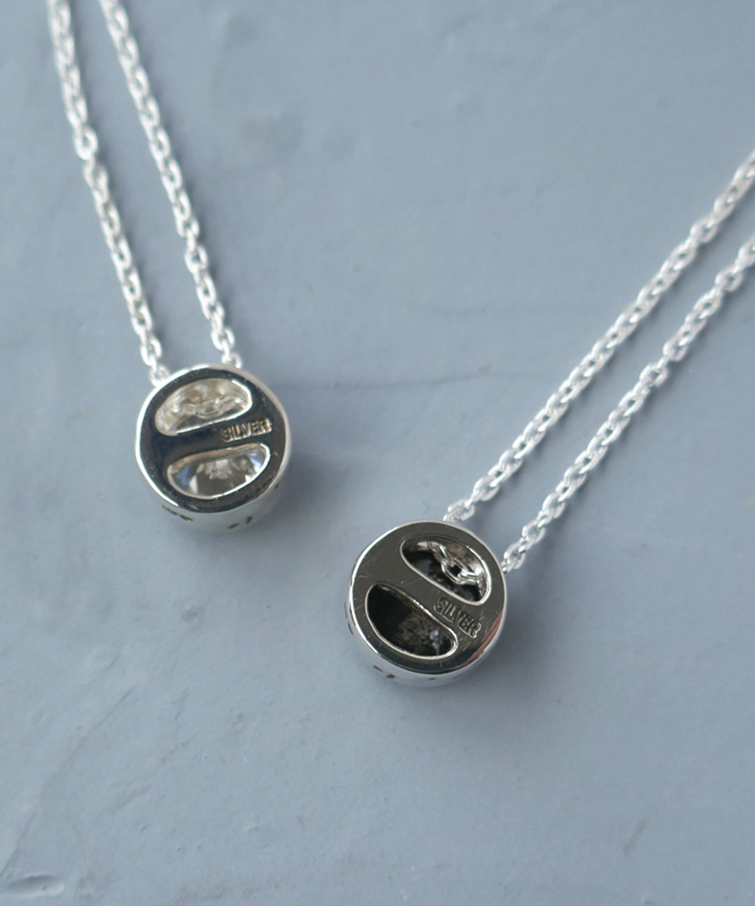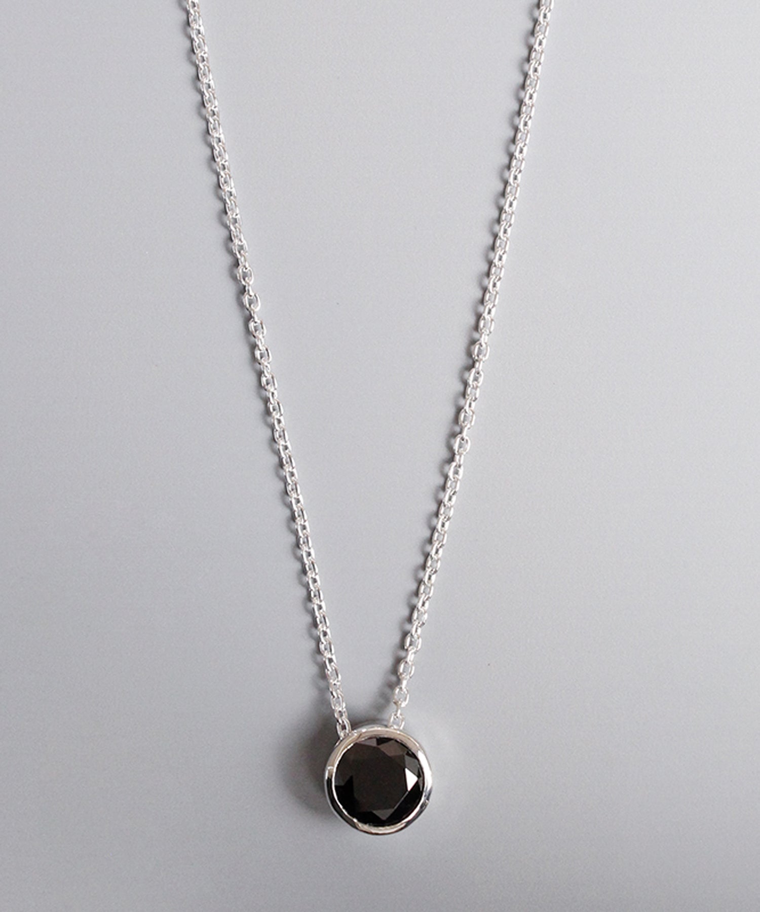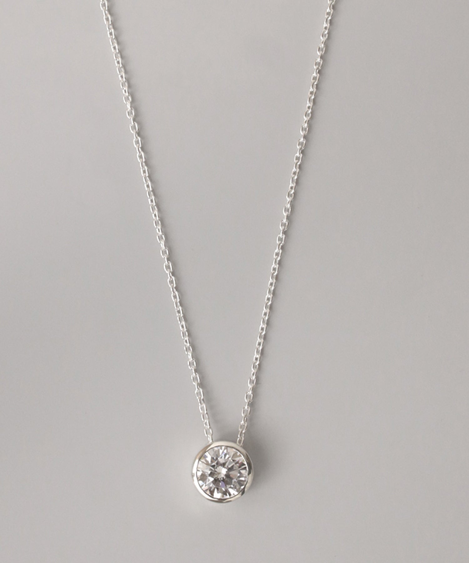 覆輪留めされたジルコニアと少し短めのチェーンがカジュアルな印象に。