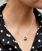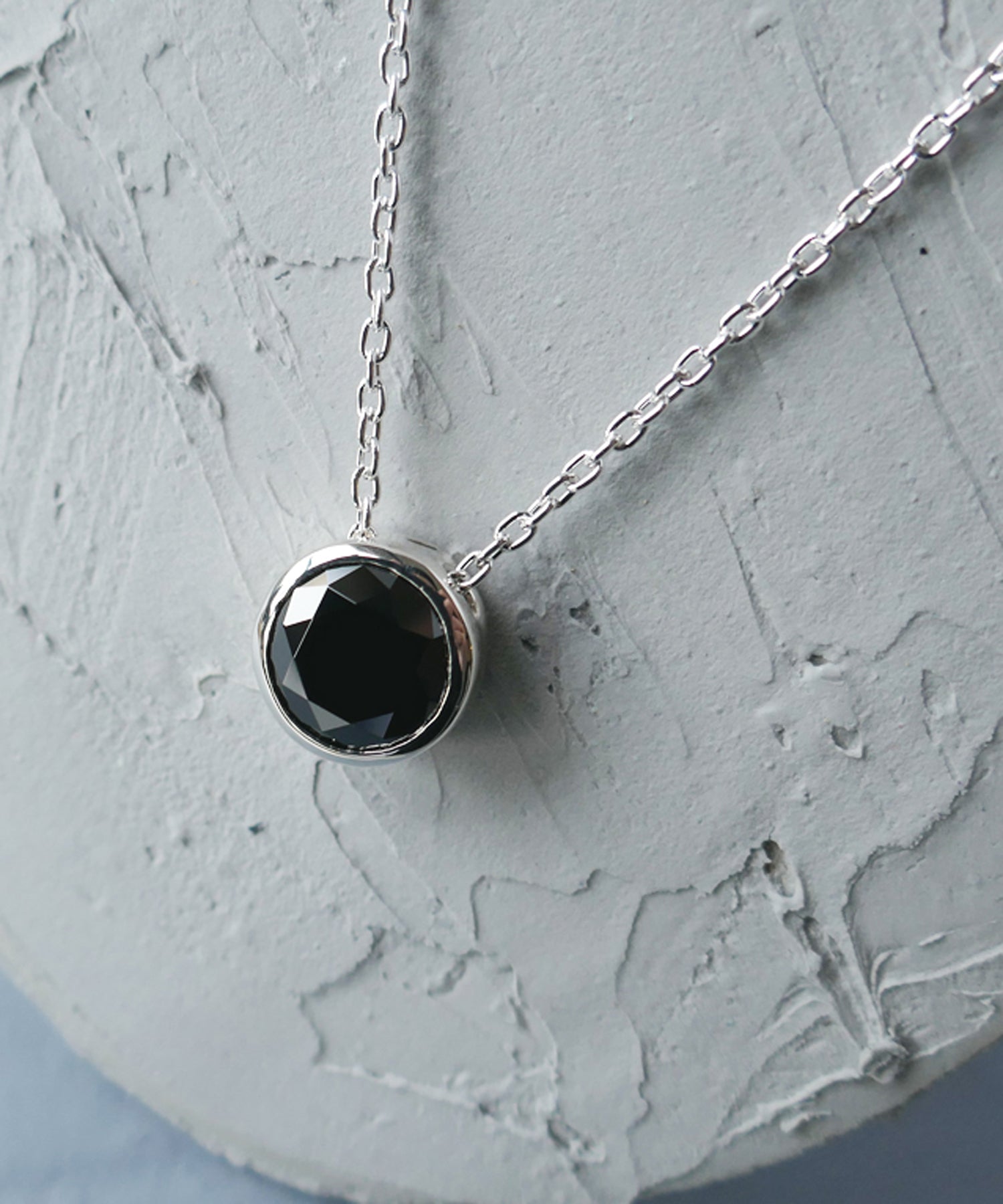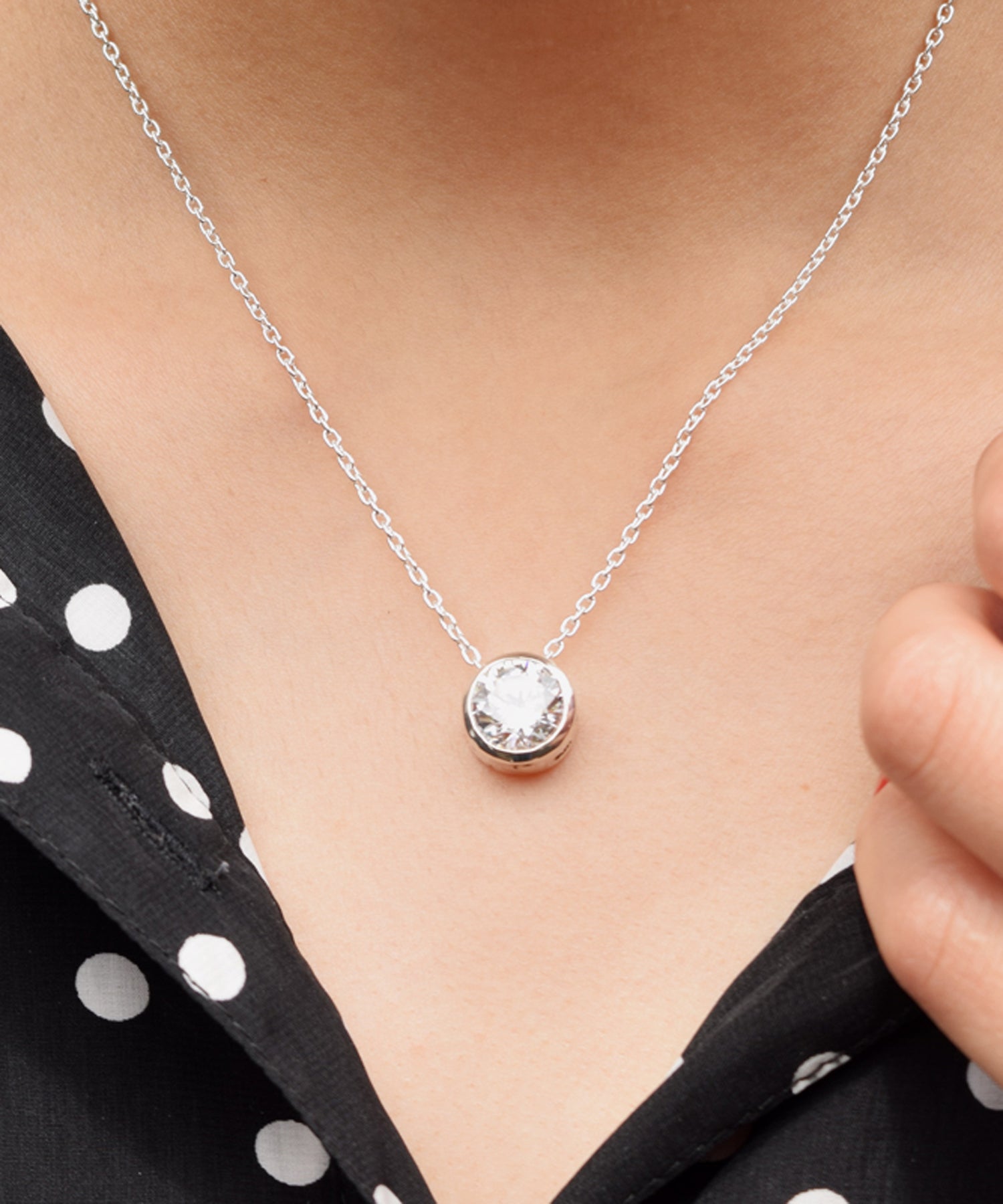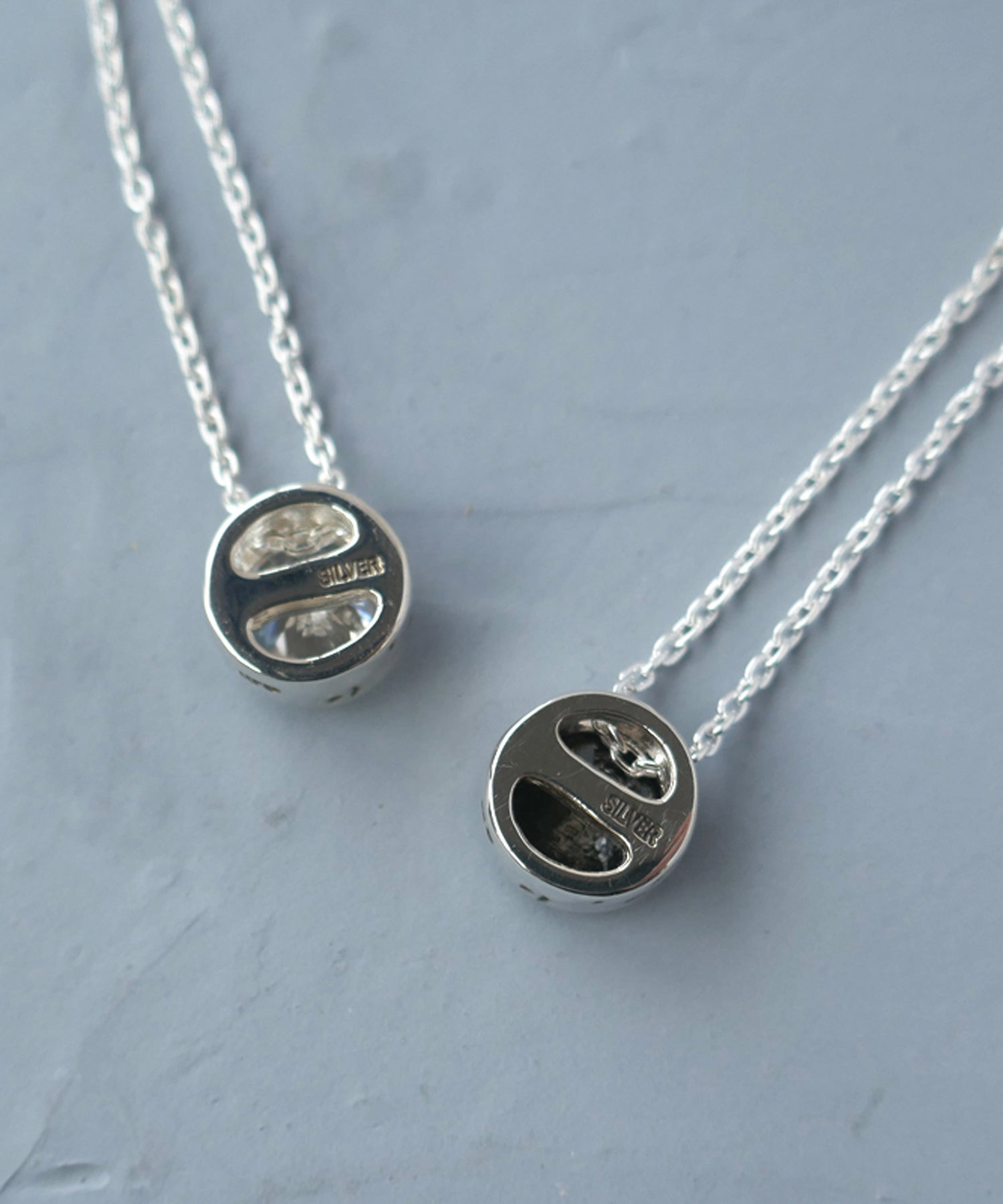 覆輪留めされたジルコニアと少し短めのチェーンがカジュアルな印象に。