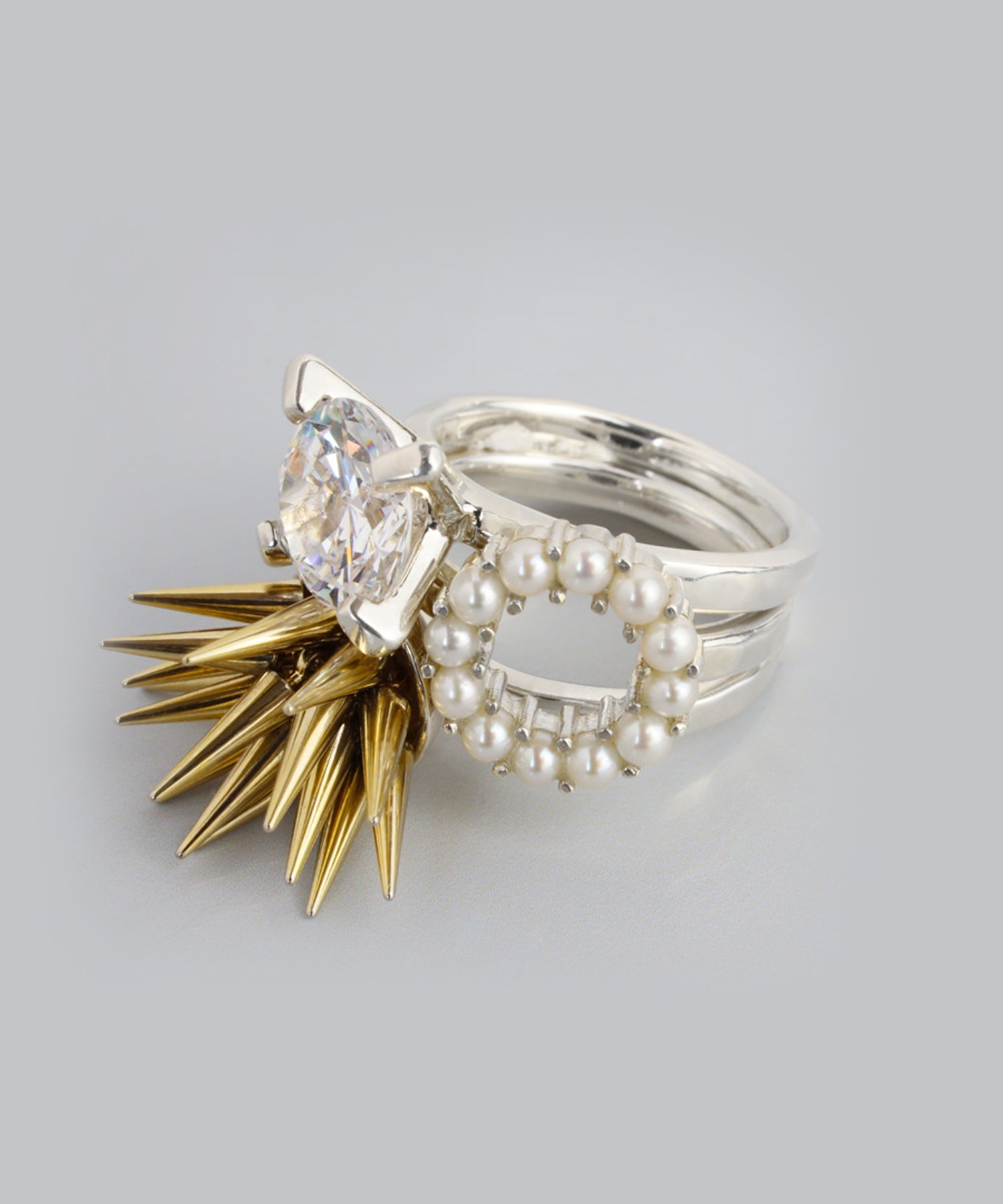 ジルコニアの立て爪リングとパールのラウンドリングと