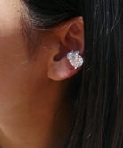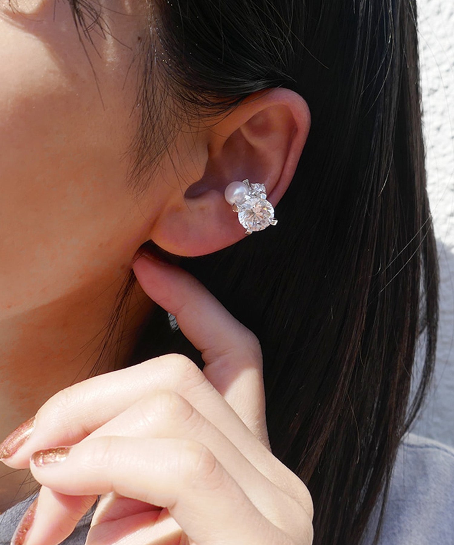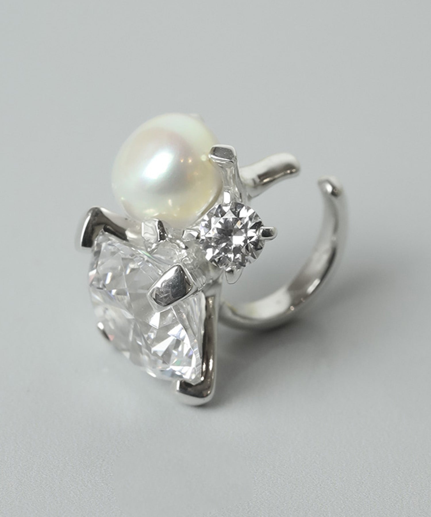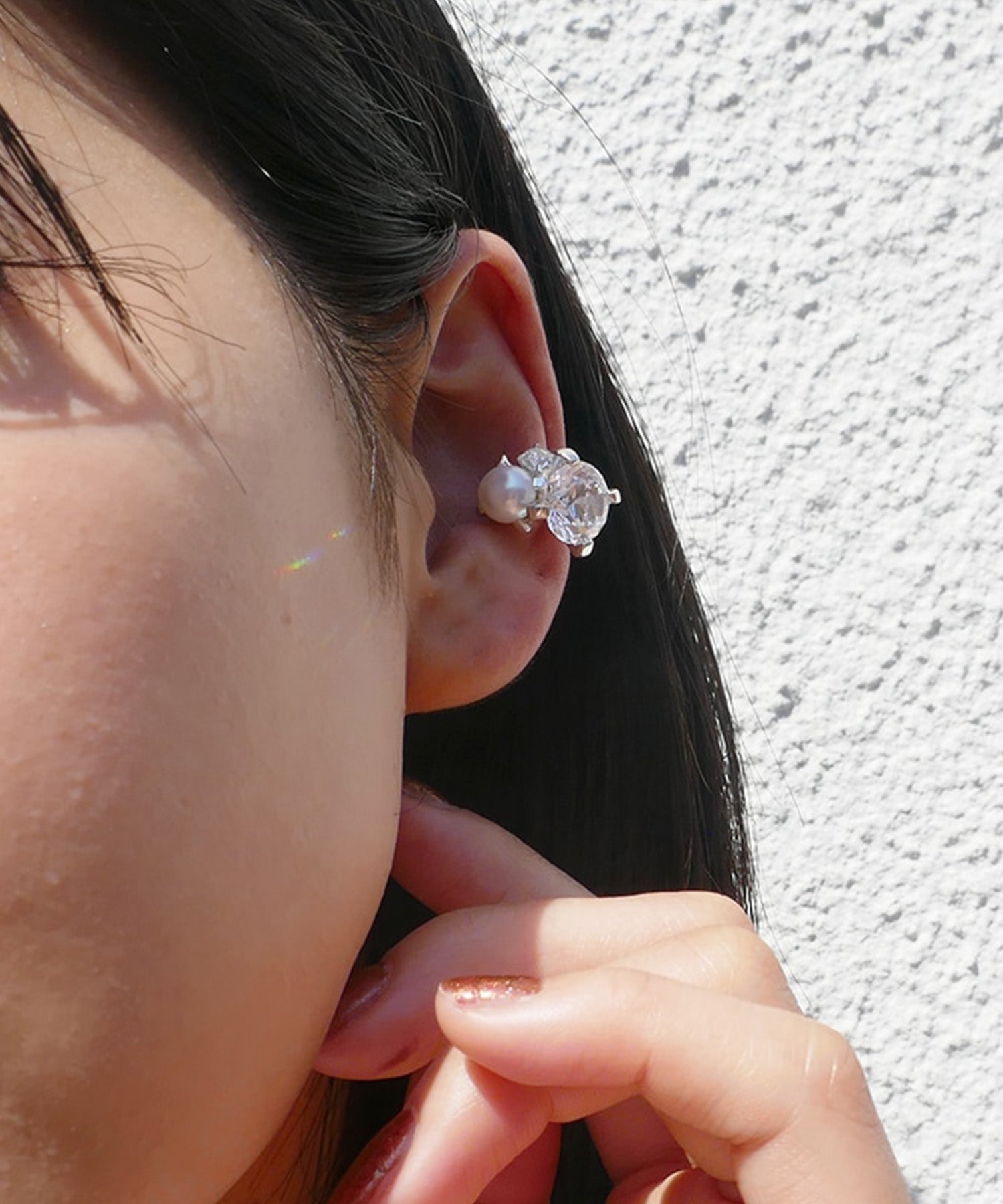 サイズの異なるキュービックジルコニアと、ナチュラルカラーのパールの3石を寄せ合わせてセッティングしたシルバーイヤーカフ。
