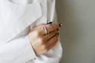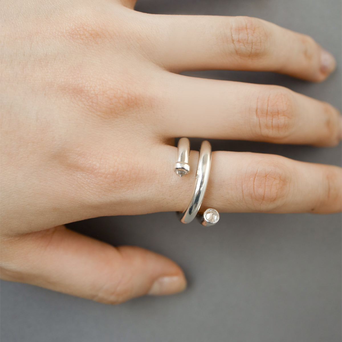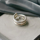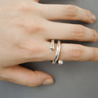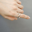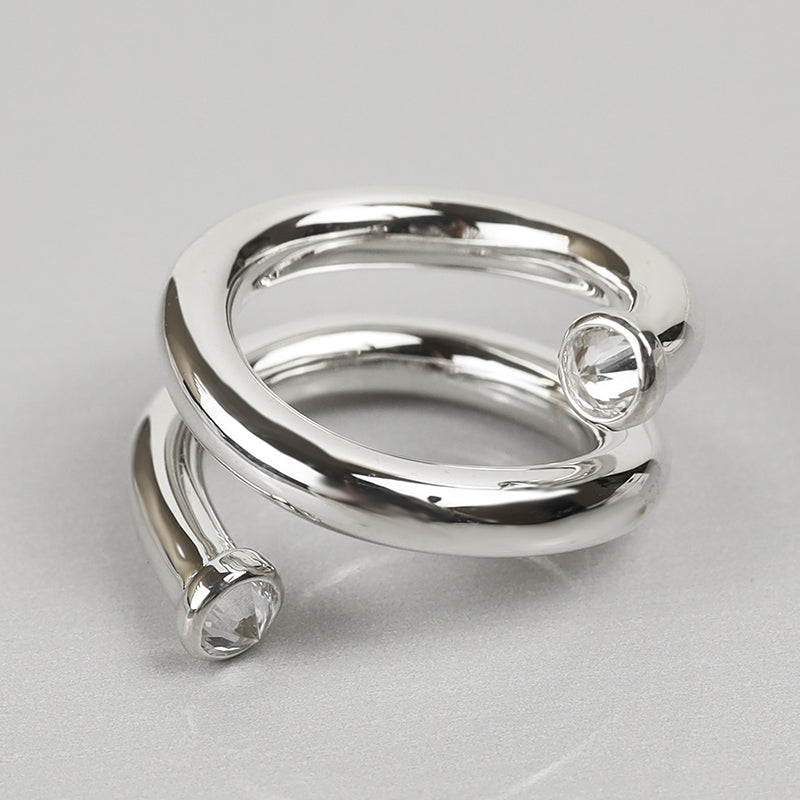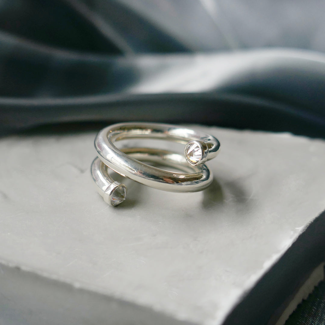 光の軌道を滑らかなアームラインで表現したリング。曲線を描くシルバーのライン上に