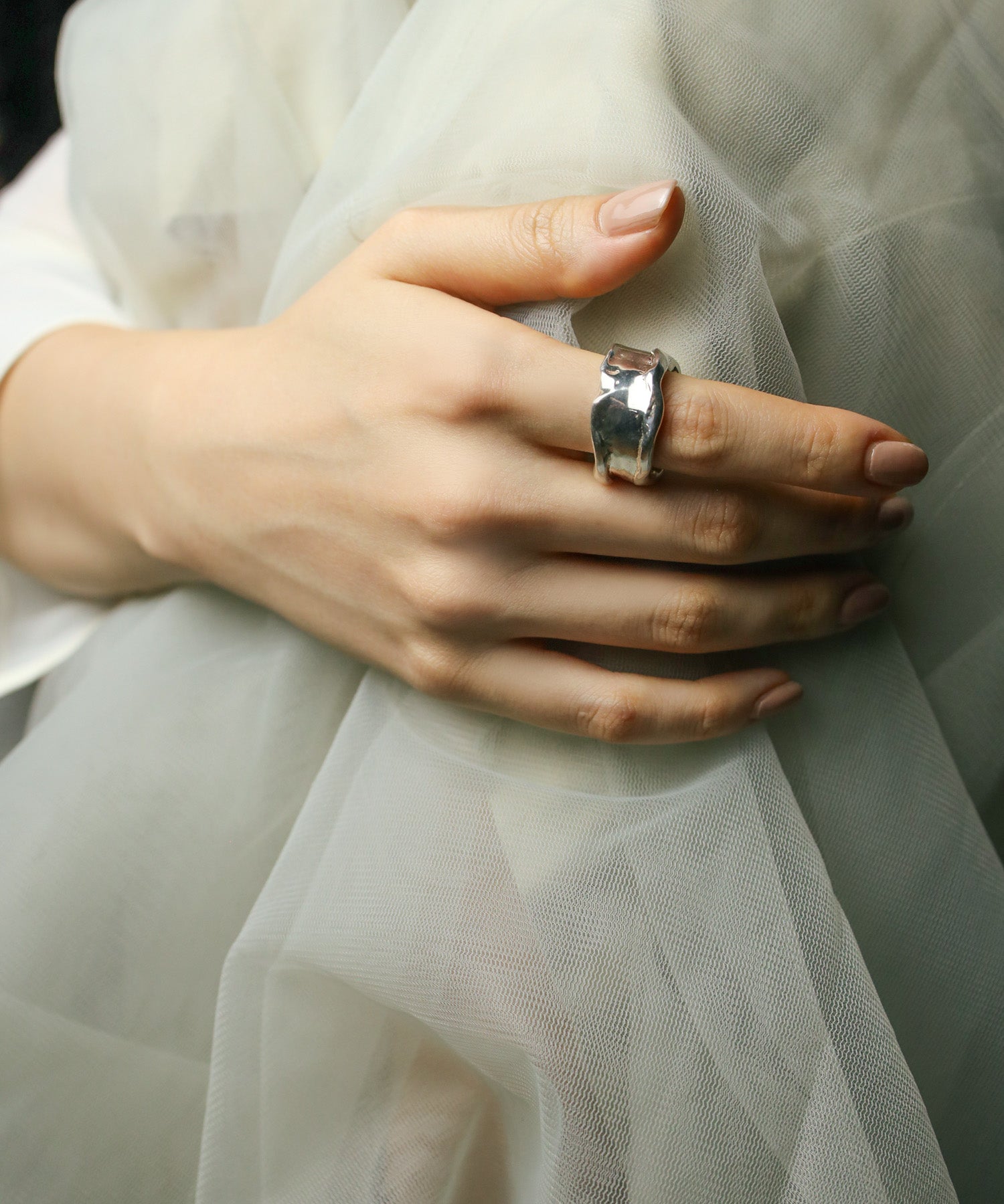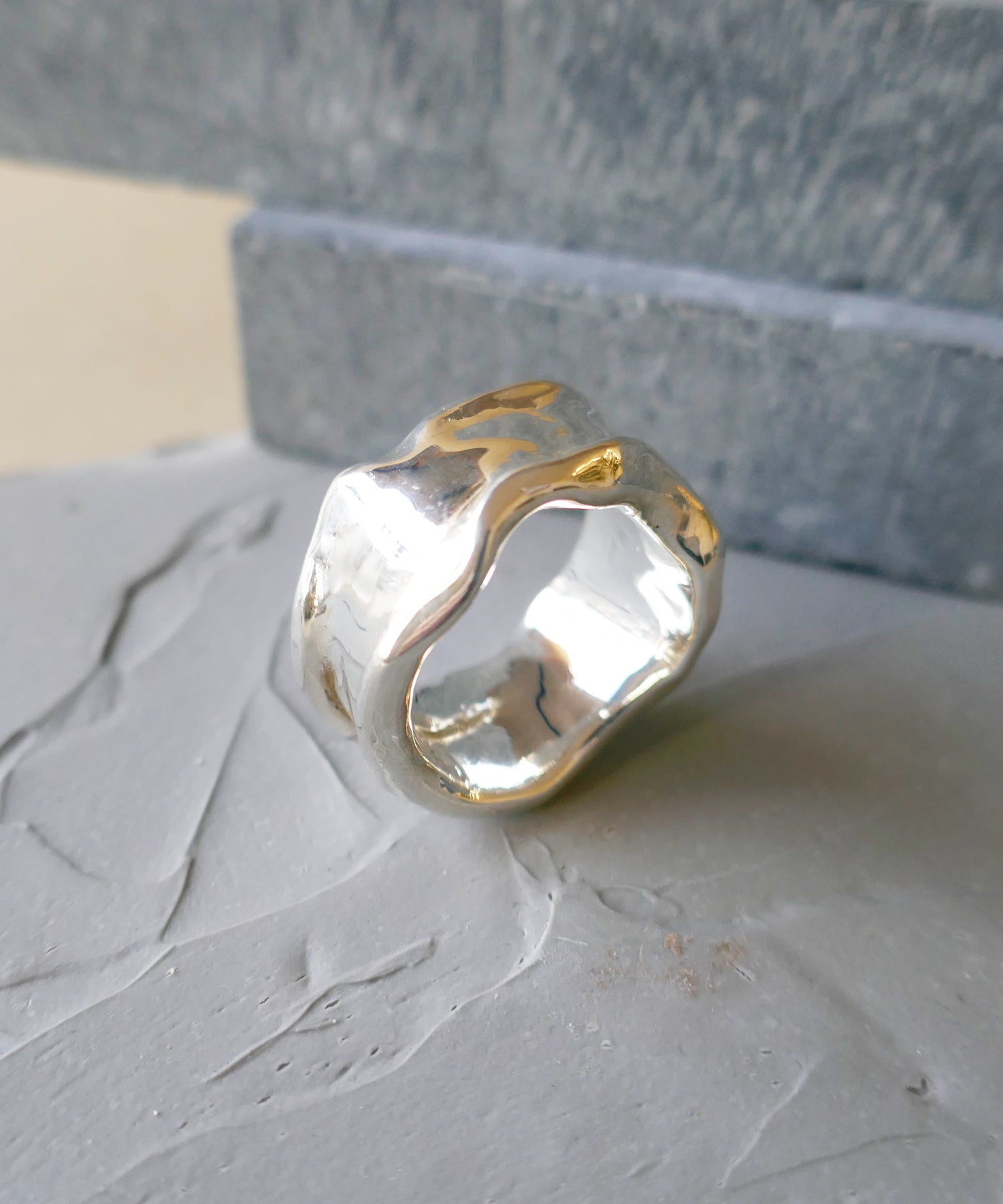 金属が溶けだしているような、大胆なデザインが印象的シルバーリング。
