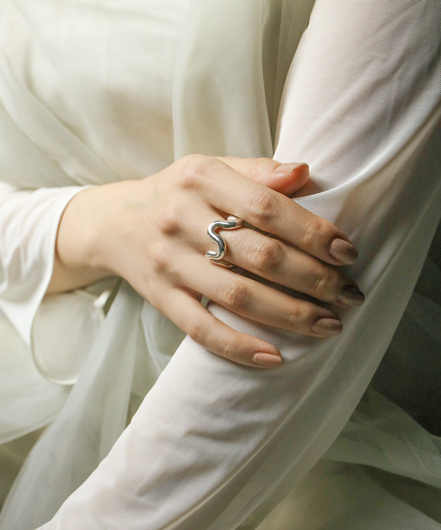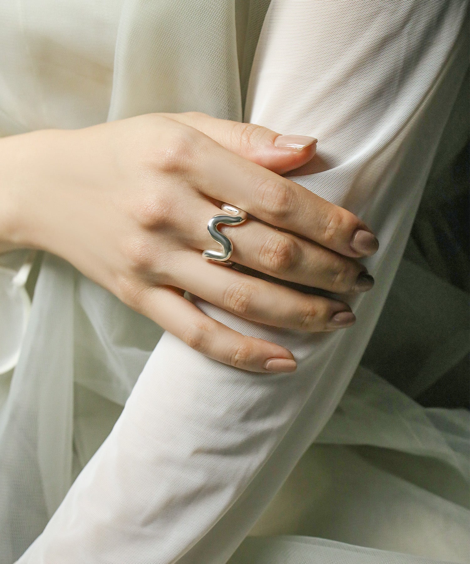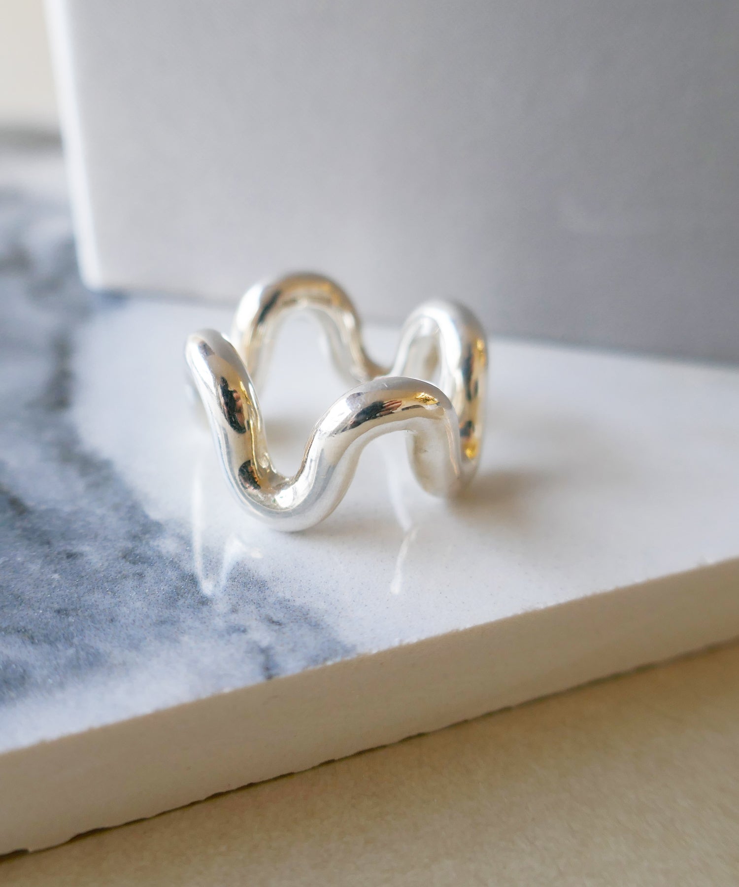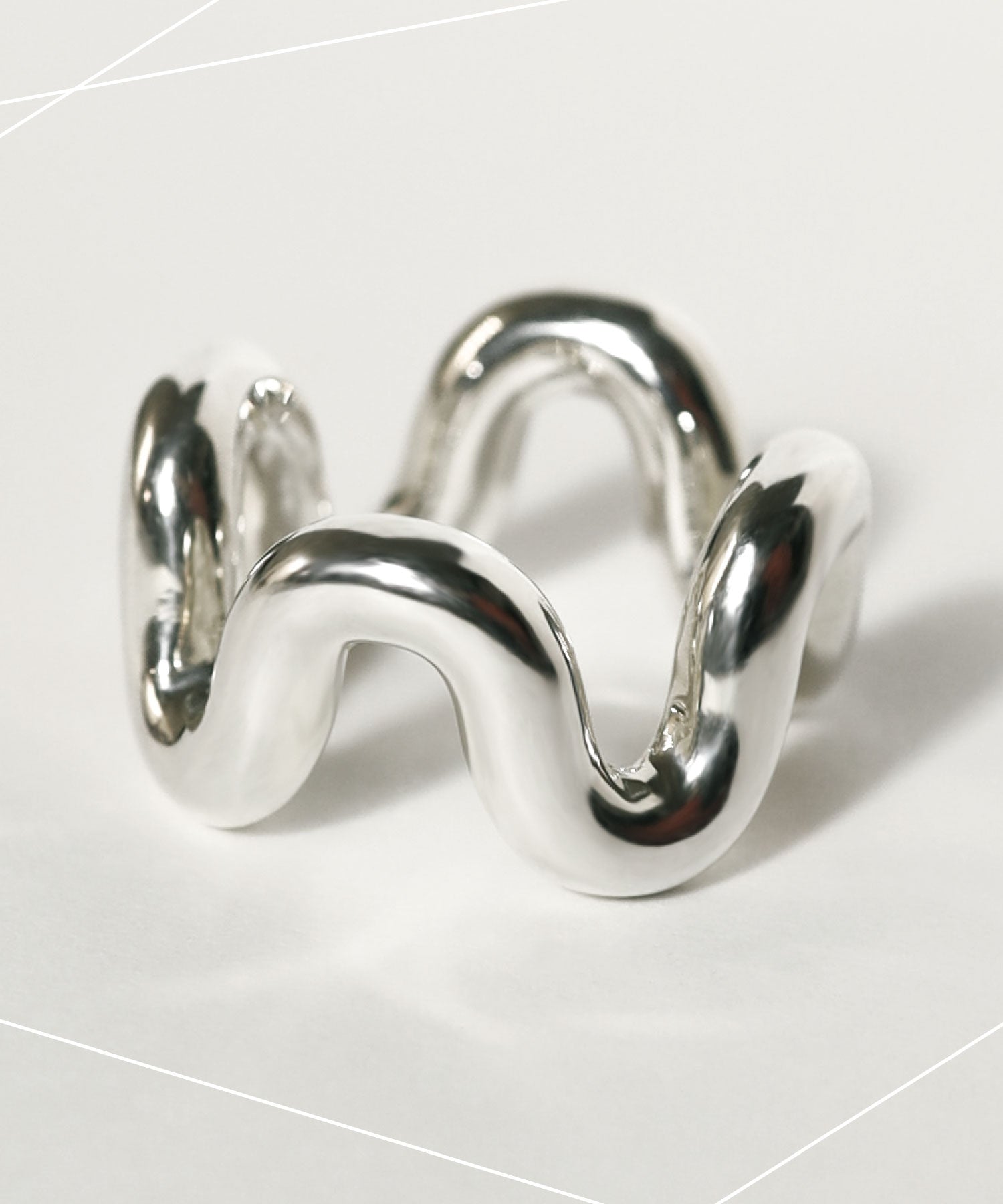 幾何学的なデザインのメタルリング。緩やかな曲線のラインは柔らかな印象を与えます。