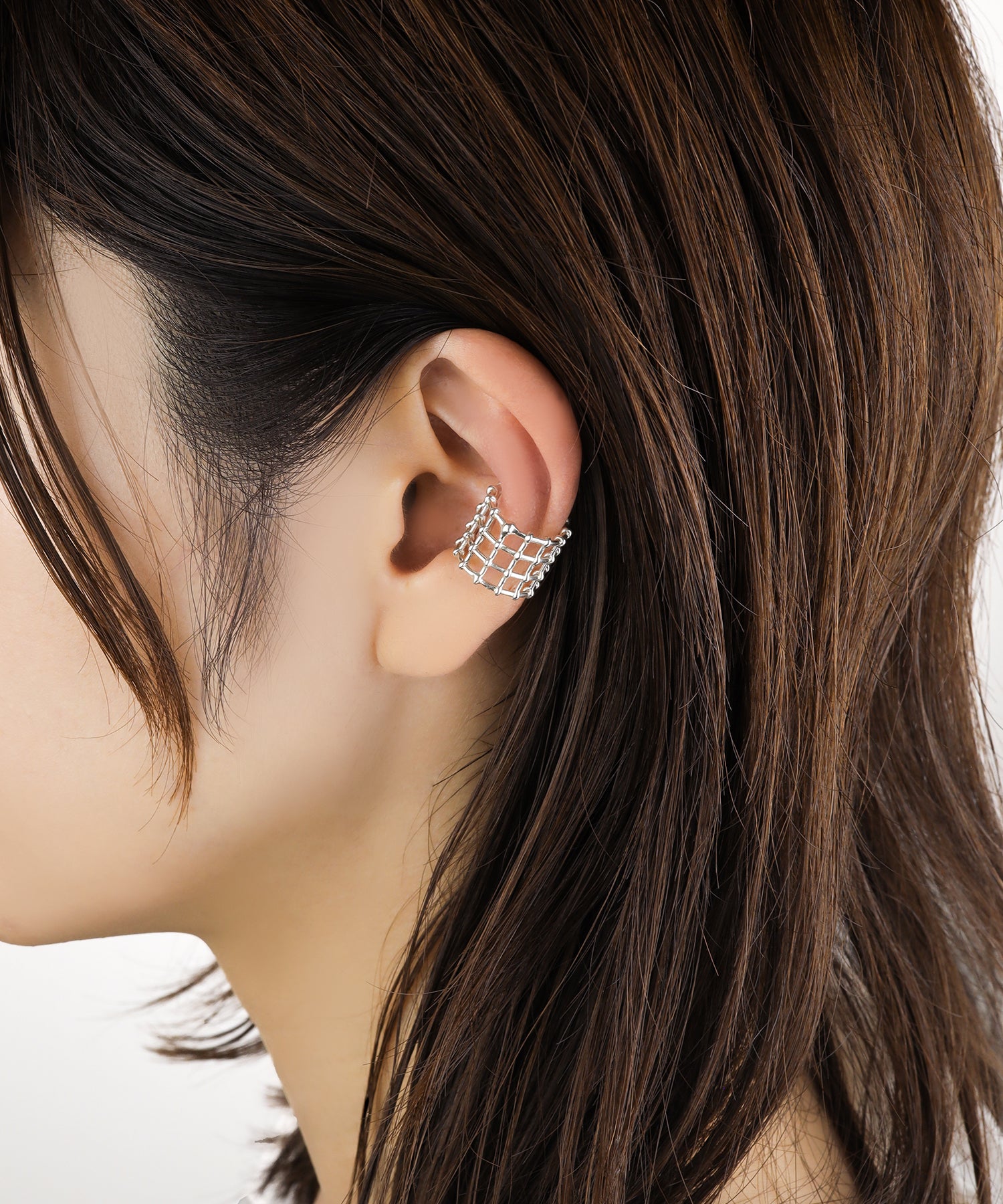 格子状にシルバーの線を組んだデザインのイヤーカフ。