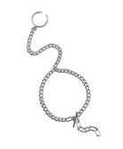 リングとブレスレットの異なるアイテムを組み合わせることで、手の甲がたゆんだチェーンで飾られます。