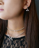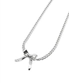 フラットなシルエットの喜平チェーンを使用したシルバーネックレス。2か所にリボンモチーフをあしらい、1つは着脱金具を兼用する首筋部分に。