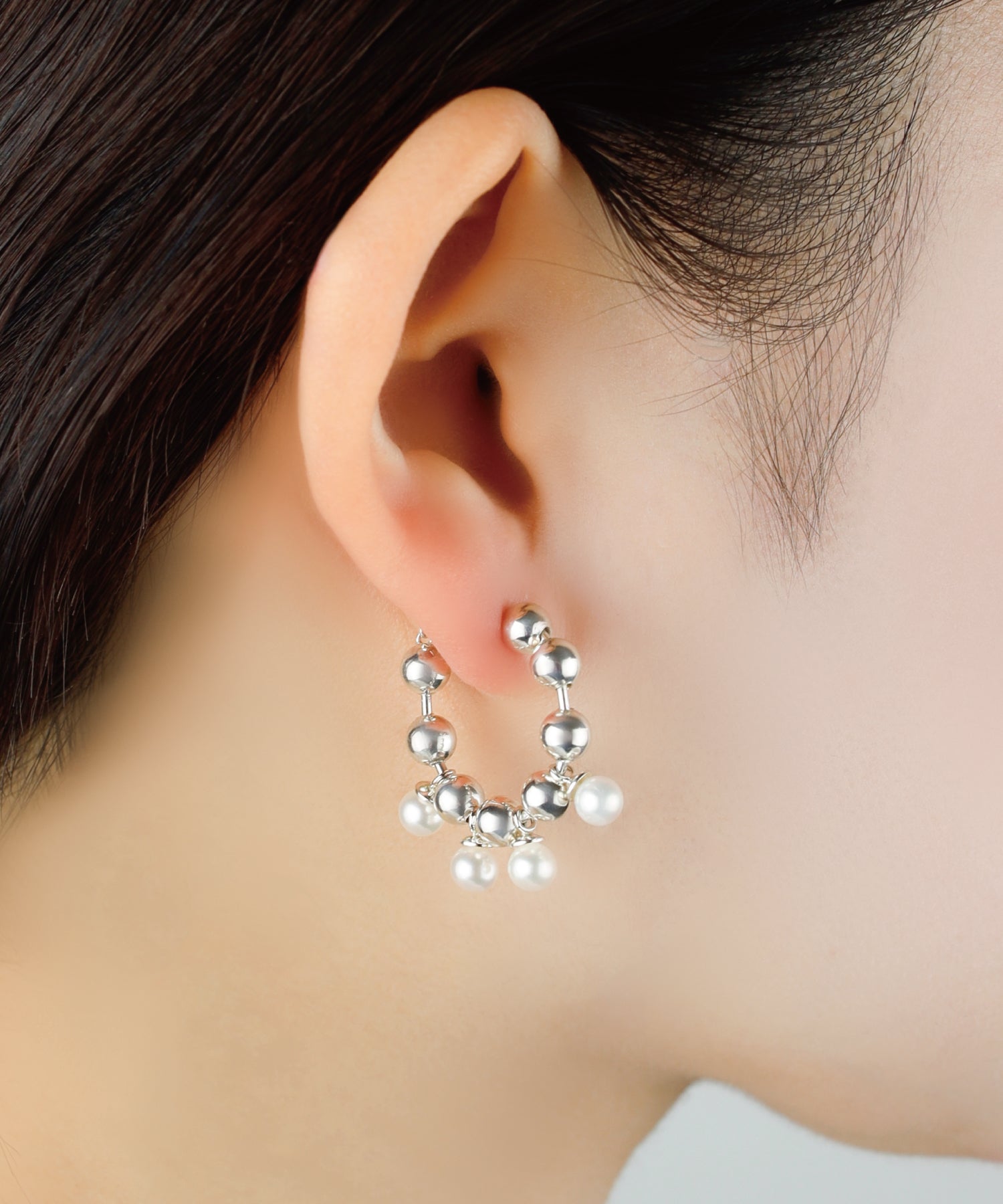 ボールチェーンで仕立てたフープに、同じサイズ感の淡水パールが等間隔に揺れるリズミカルなシルエットのピアス。
