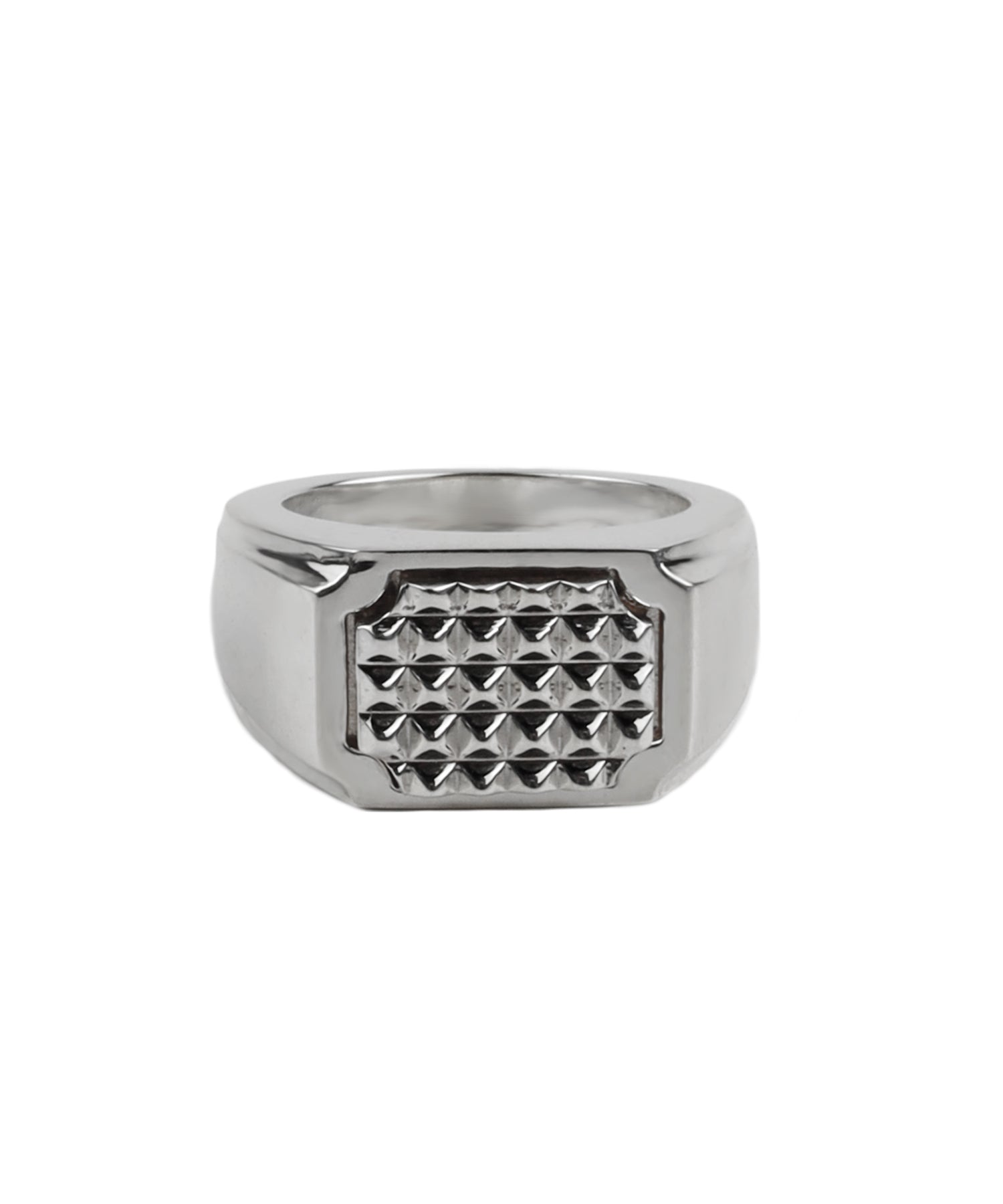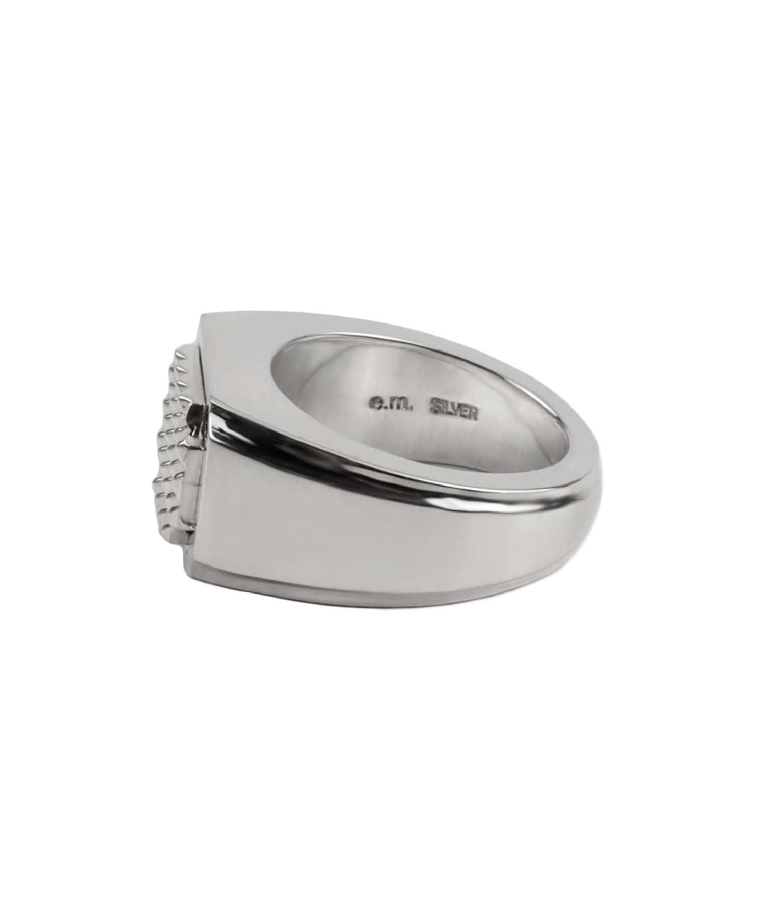 トップの印台部分は、レリーフ枠のようなシルエットの装飾とピラミッドスタッズを整列させたシルバーパーツを取り付けています。