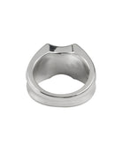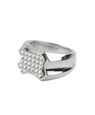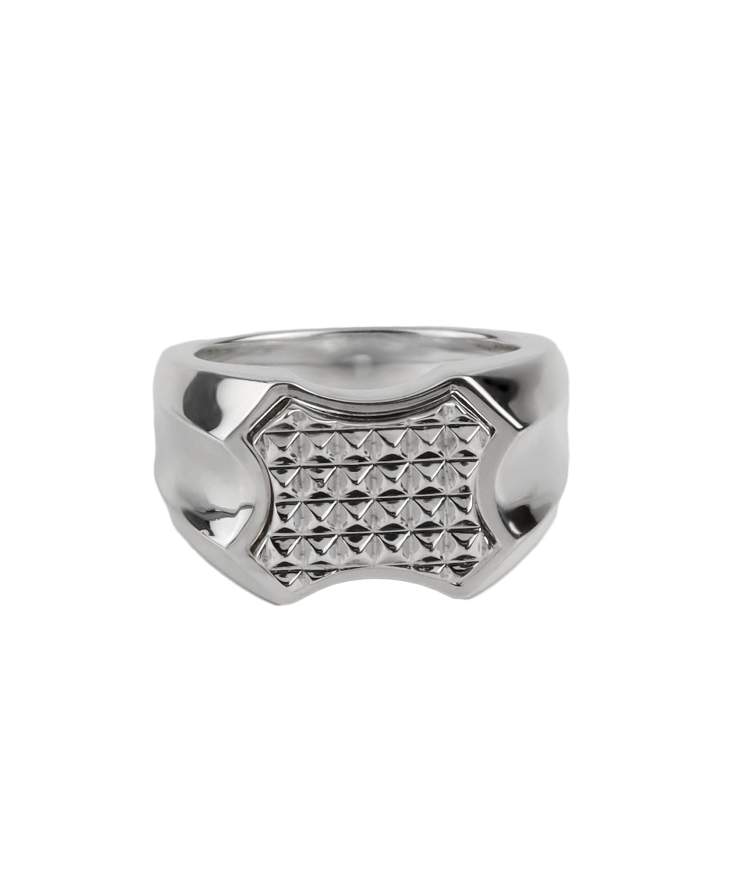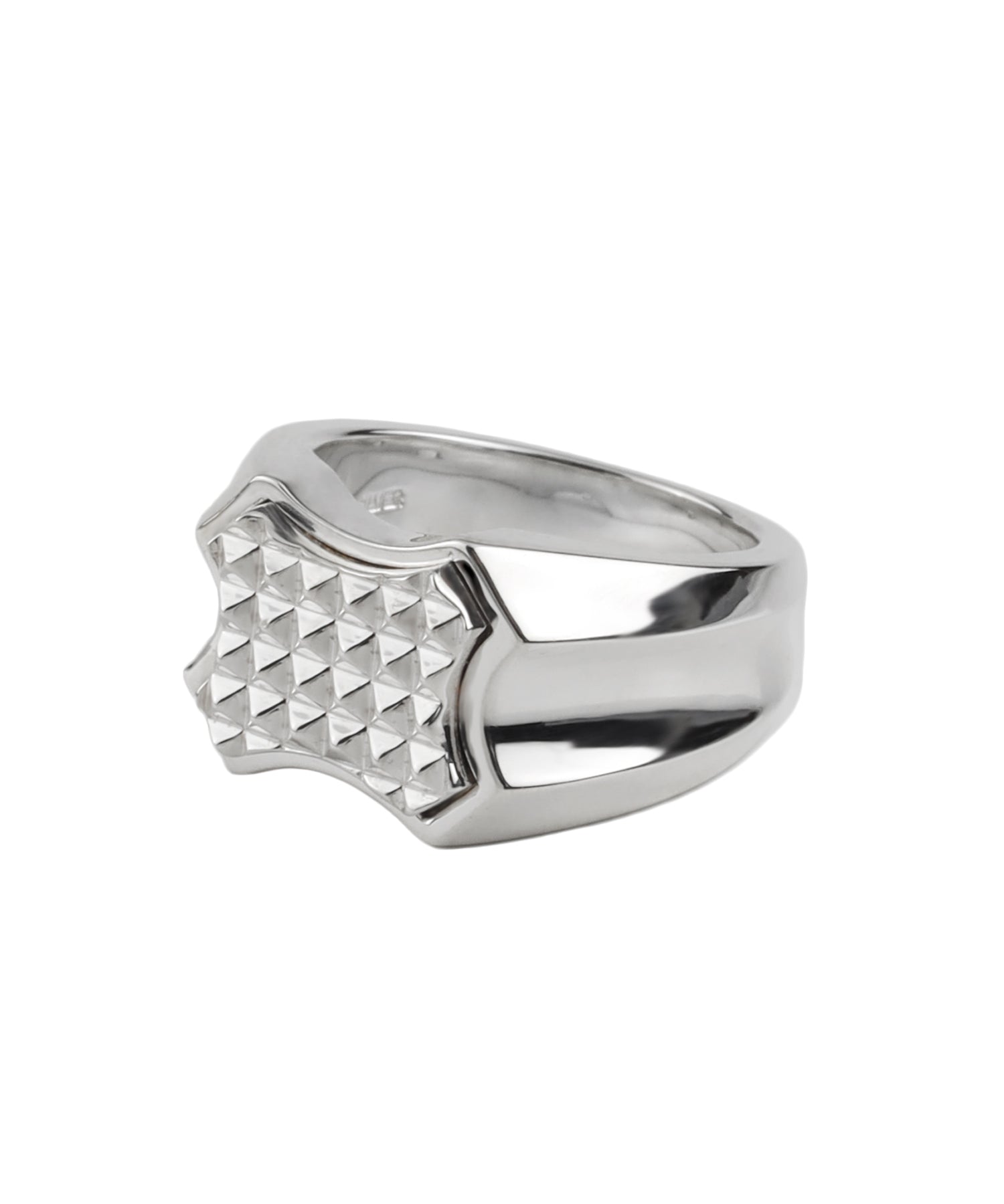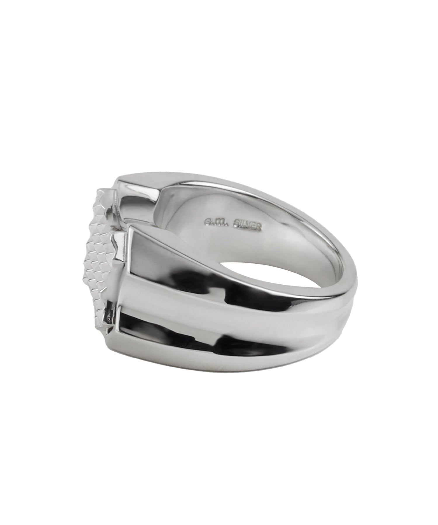 シルバーの印台リング。トップの印台部分は、レリーフ枠のようなシルエットの装飾とピラミッドスタッズを整列させたシルバーパーツを取り付けています。