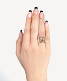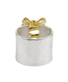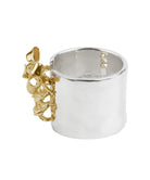 平打ちリングをコルセットに見立て、ゴールドのリボンで編み上げたデザインのシルバーリング。リボンの持つフェミニンな印象だけでない、甘さの中に強さや遊び心を感じます。