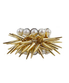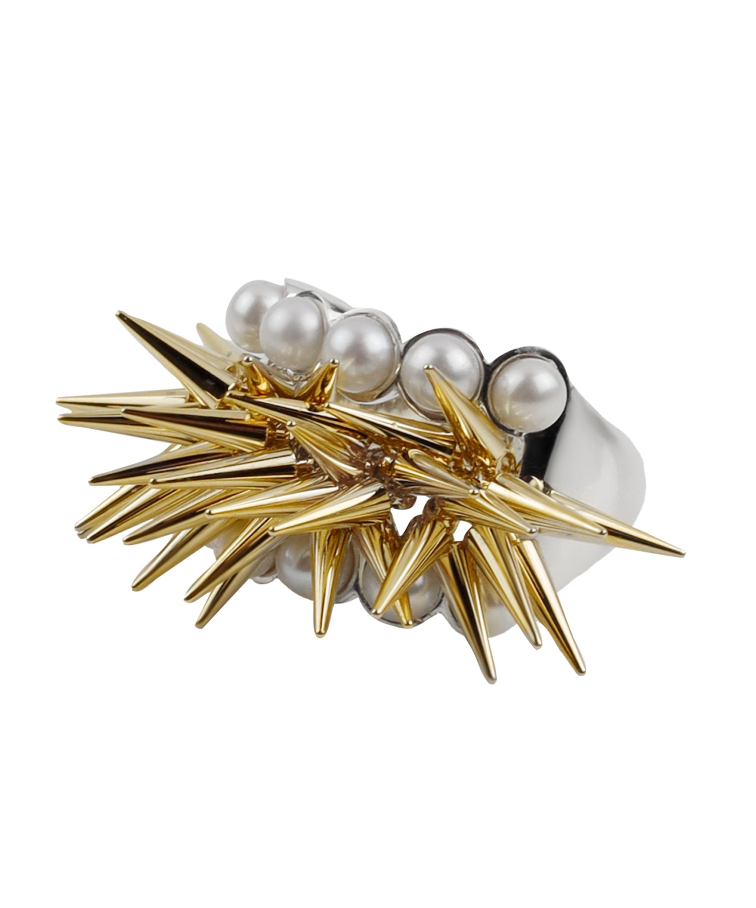 規則性をもたないスパイクスタッズのシャープなフォルムと、柔らかい光を纏うパールを大胆に組み合わせたデザイン。硬質な貴金属の人工的な美しさと、自然が生むありのままの美しさ。