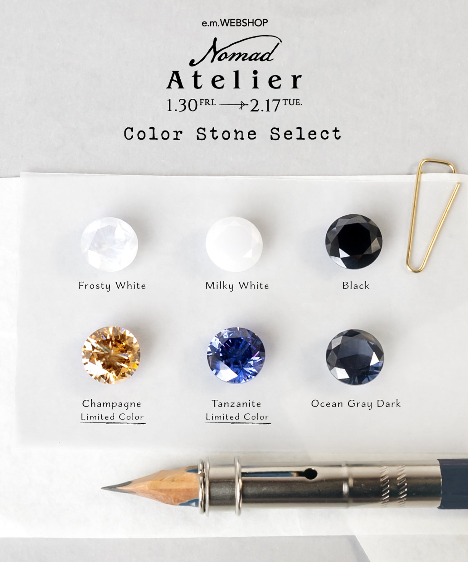 テーマに合わせたシックな色合いに加えて、e.m.WEBSHOPでは紫がかったブルー“タンザナイト"と柔らかい色調の“シャンパンゴールド”がセレクト可能です。