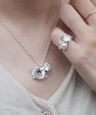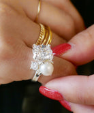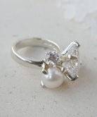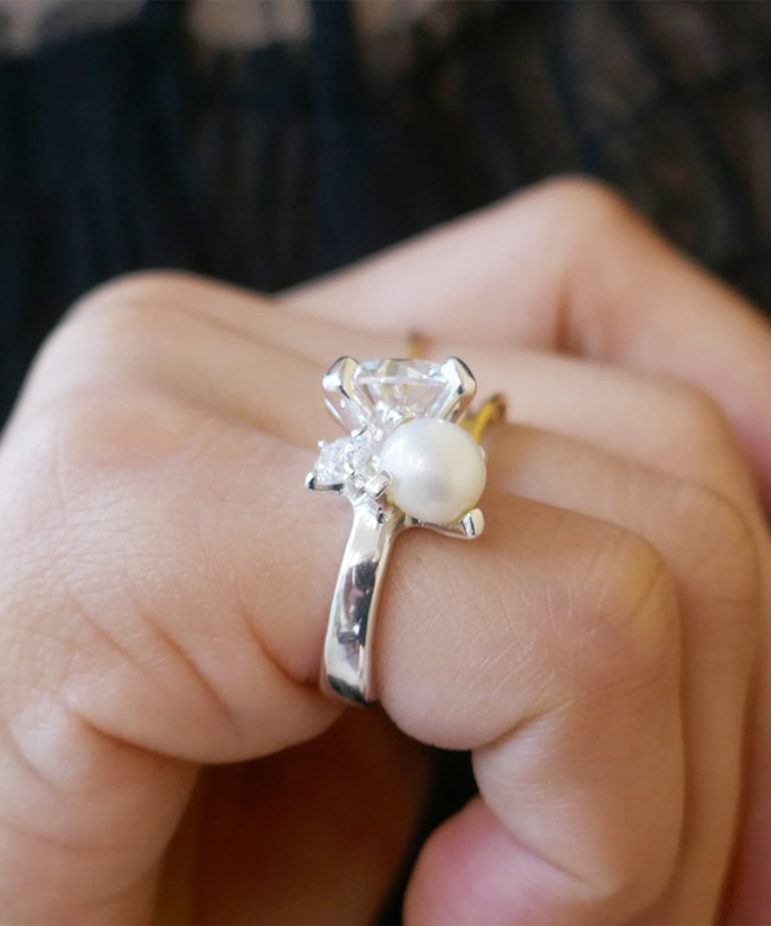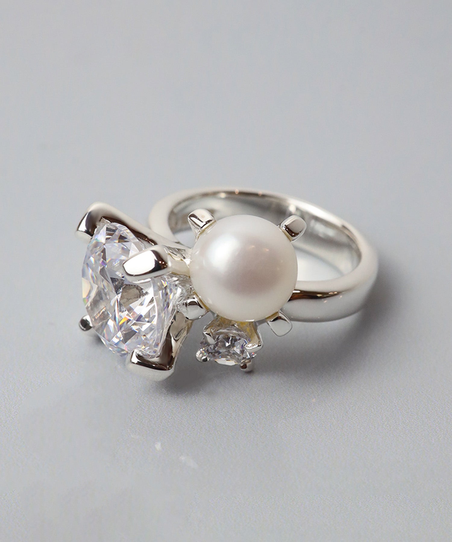 10mmの大粒のキュービックジルコニアを主役に、ナチュラルカラーのパールを寄せ合わせてセッティングしたシルバーリング。