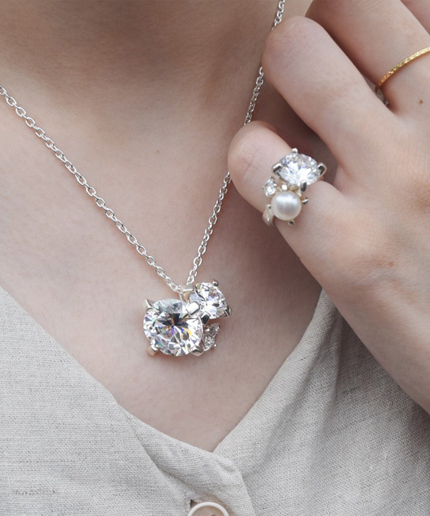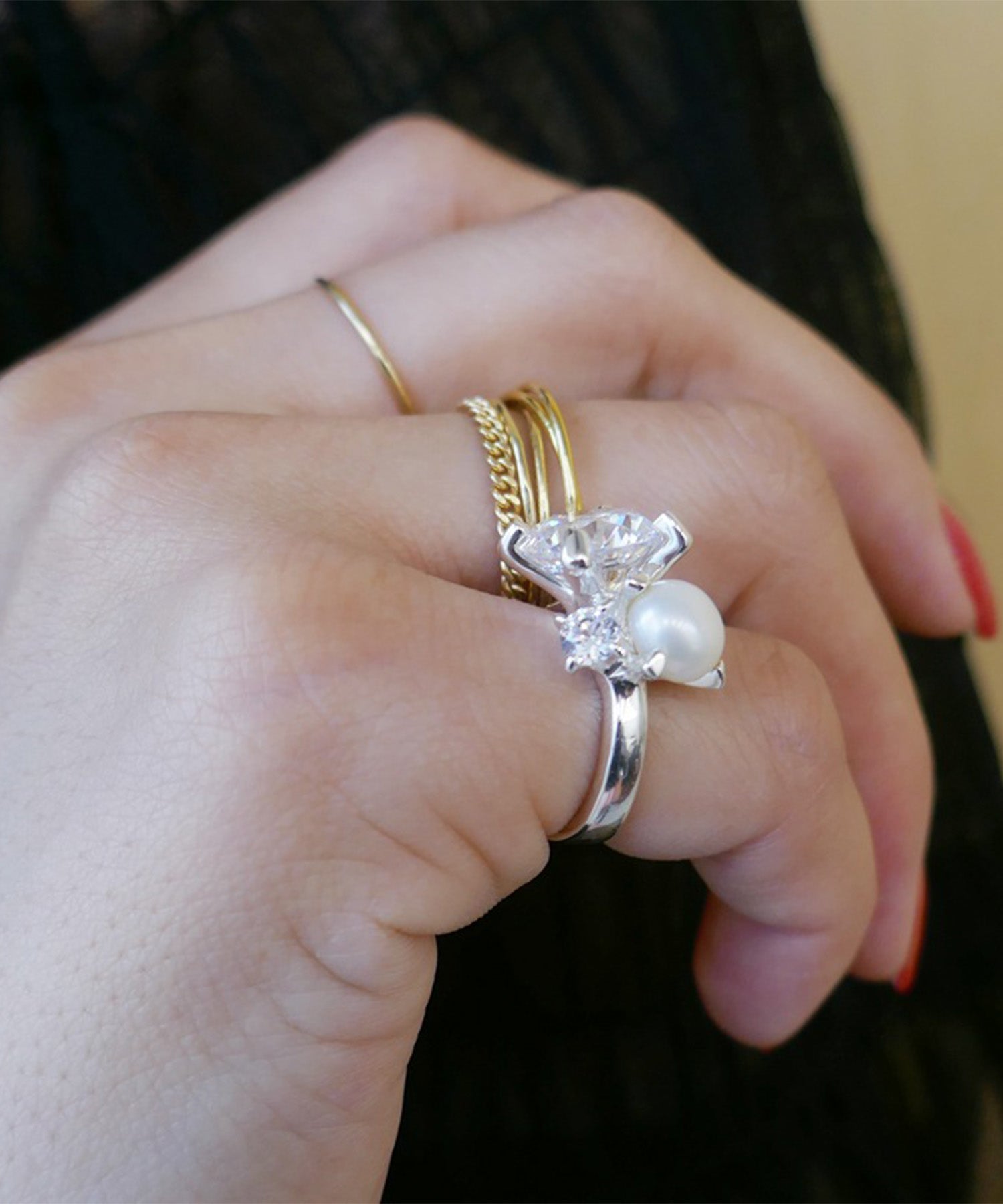 トップのストーンのボリューム感が、ありそでない遊びのあるシルエットを作り出します。