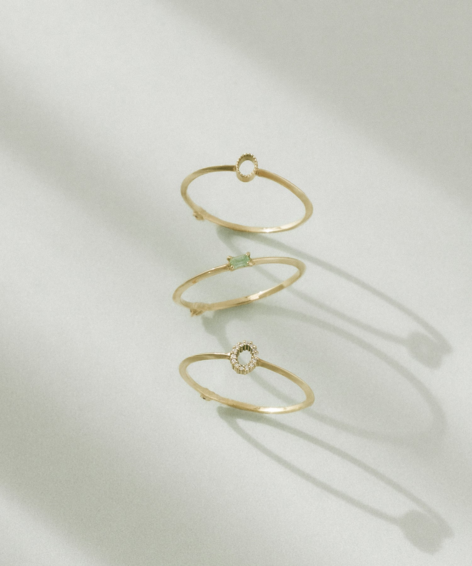 「ちいさなもの」を意味する “Teeny-Tiny” をテーマに、繊細なアームのリングやゴールドチェーン、職人の巧みな技術でセッティングされたメレダイヤやカラーストーンを美しく配置した数々のジュエリーたち。