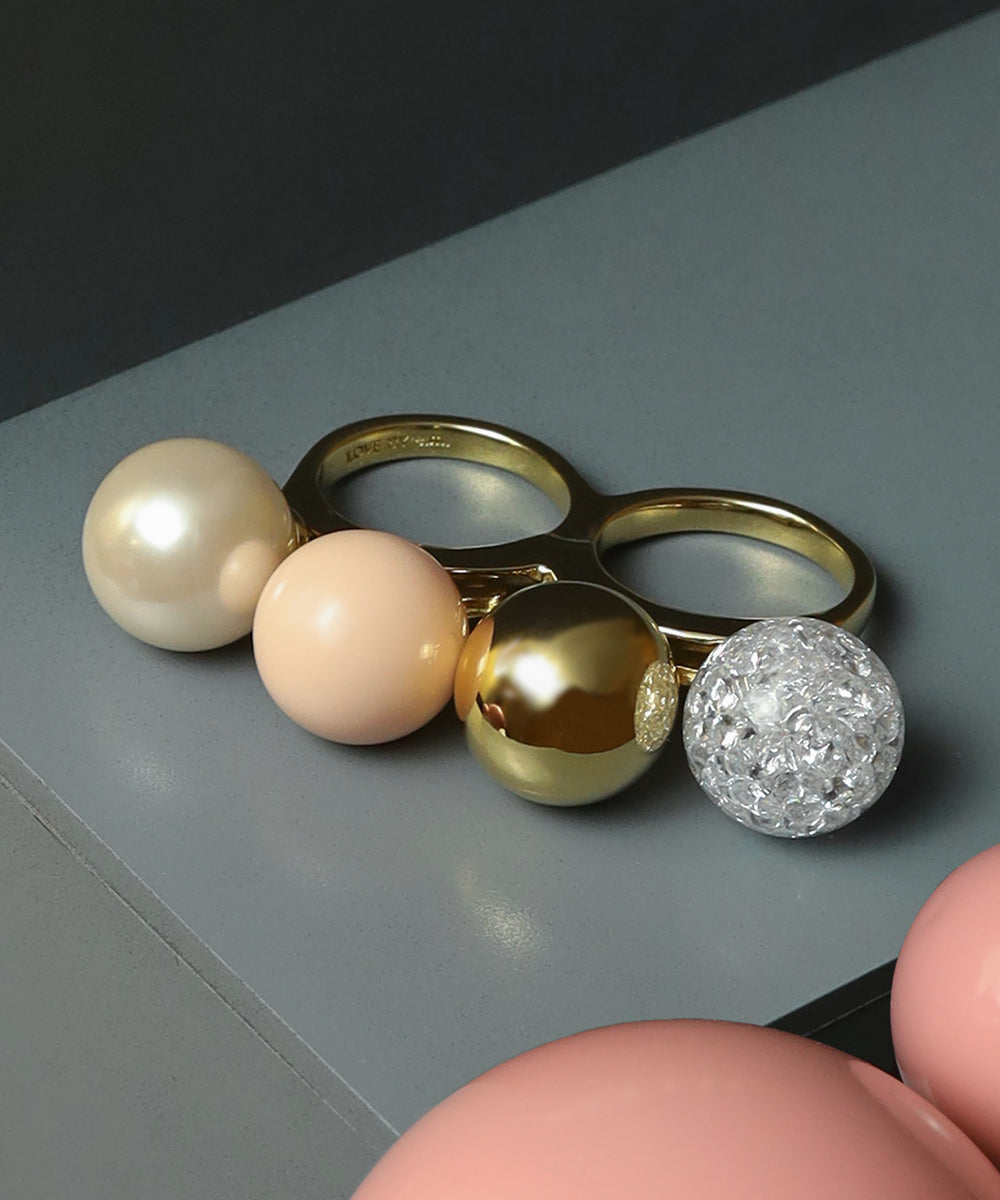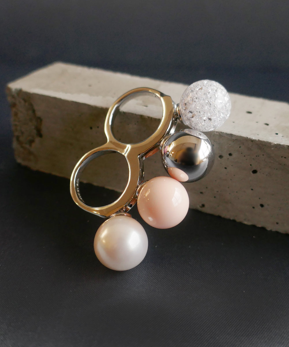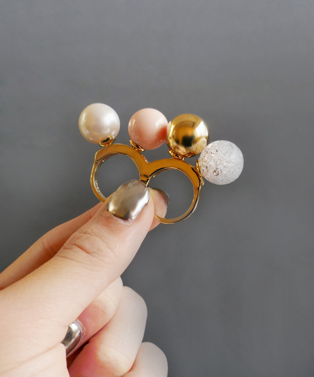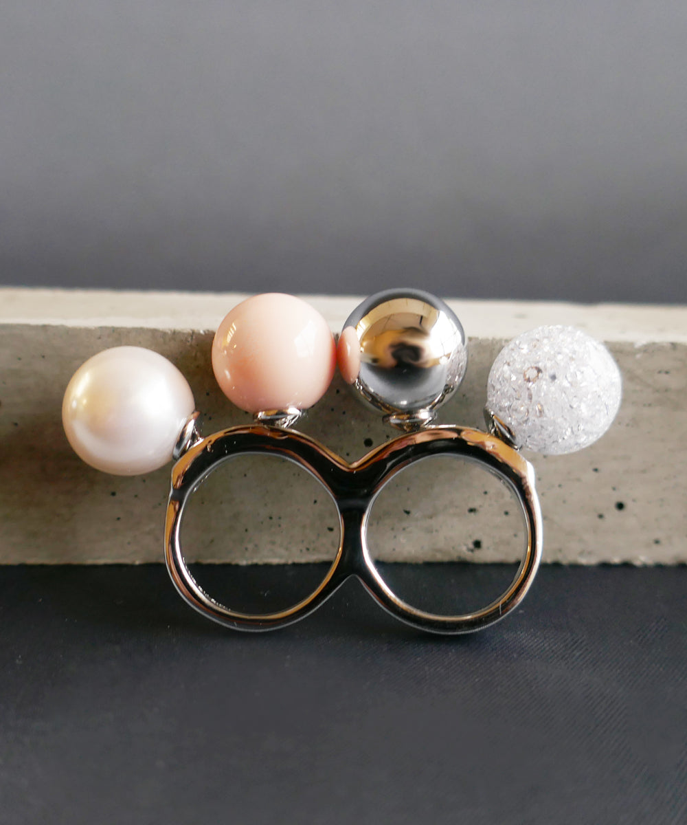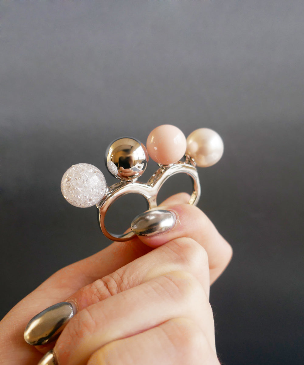 4種類の異なる球体をセッティングしたナックルリング。ボリューム感があり、手元を大きく飾る