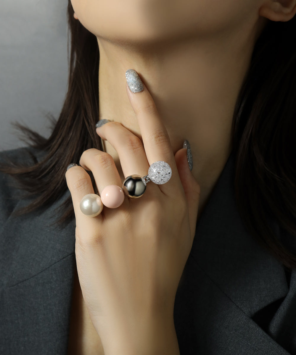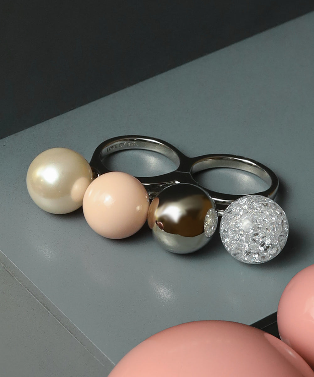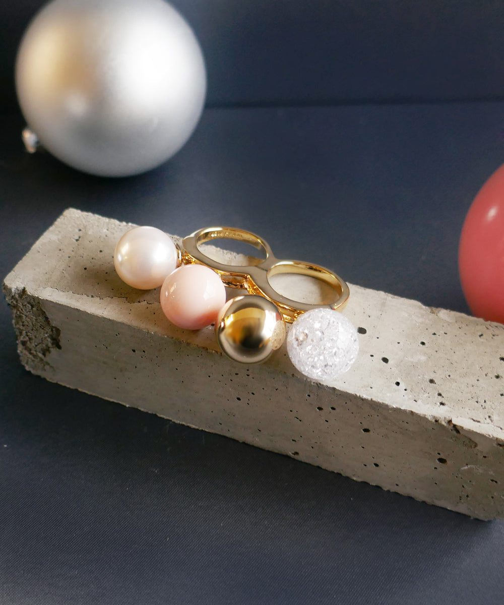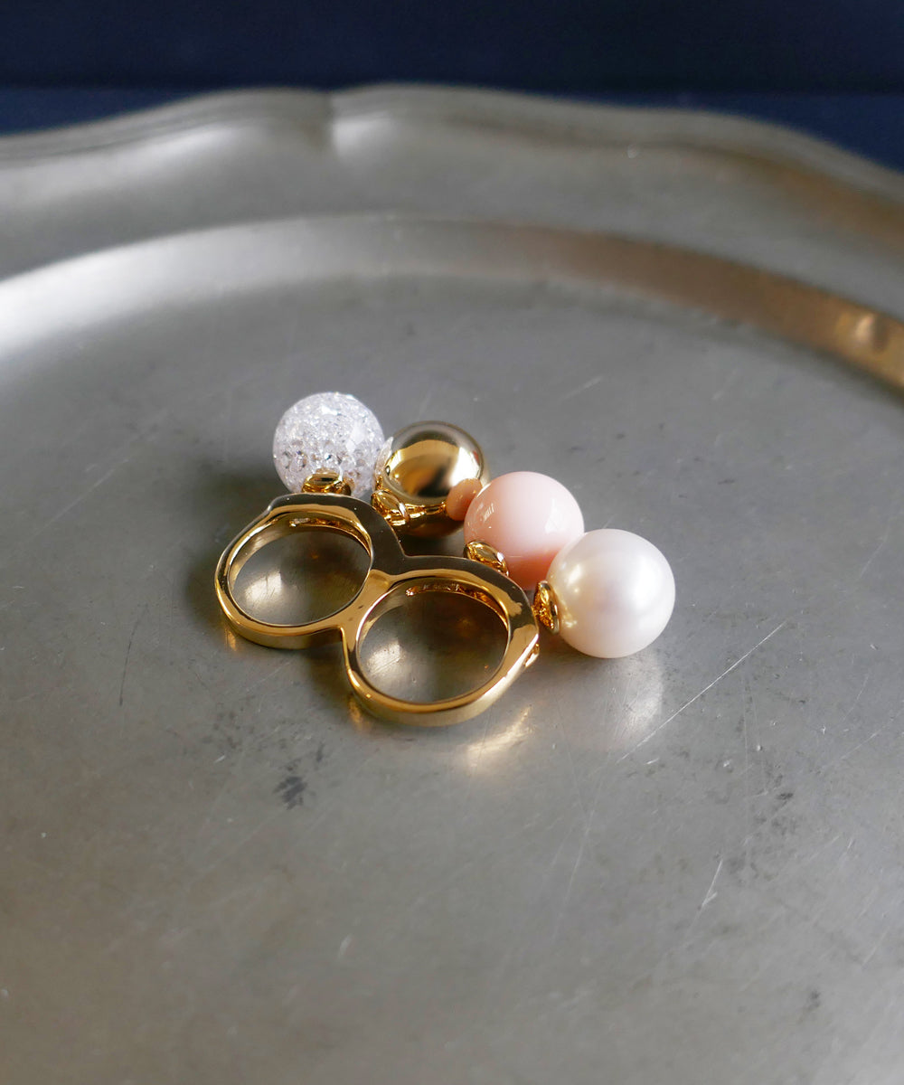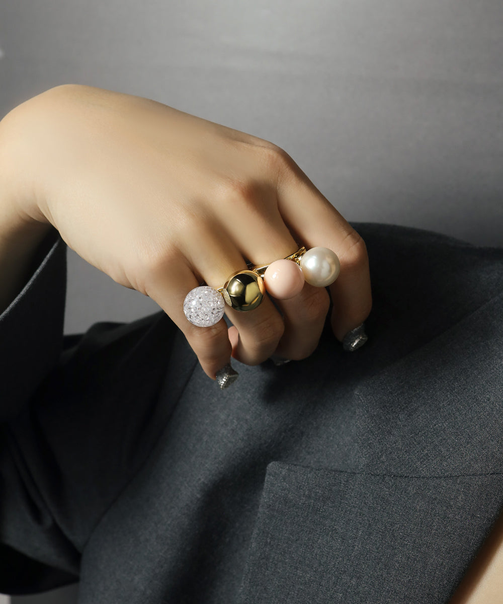 4種類の異なる球体をセッティングしたナックルリング。ボリューム感があり、手元を大きく飾る