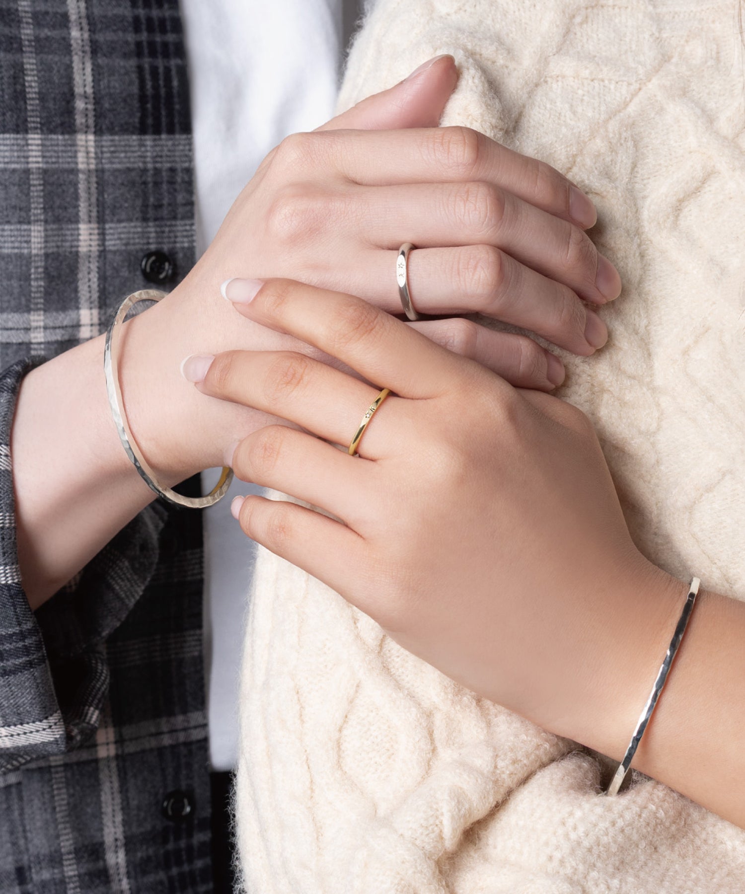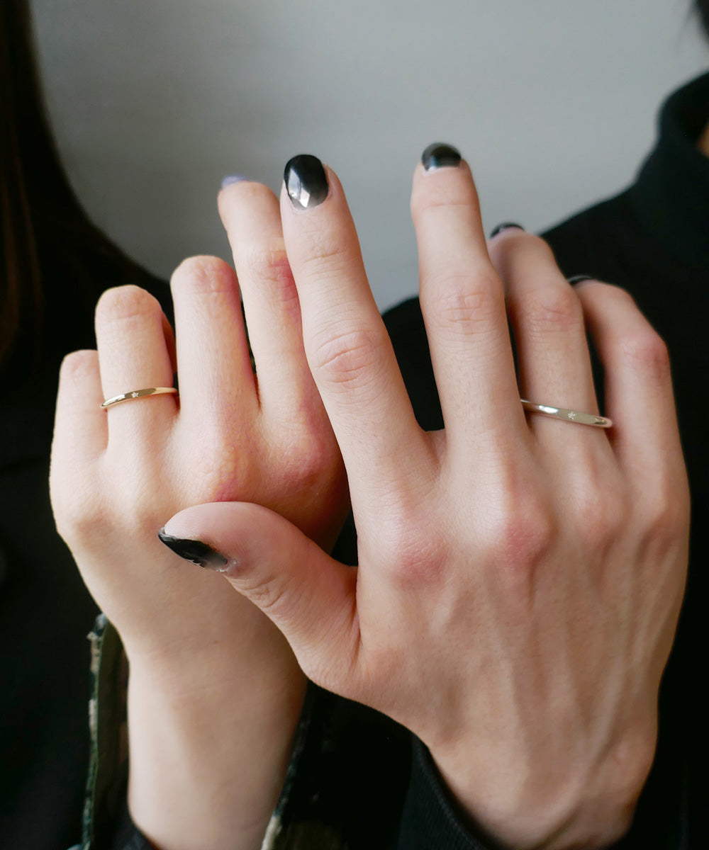 ファッショナブルなデザインは薬指以外にも、人差し指や中指での ぺアコーディネートもおすすめです。