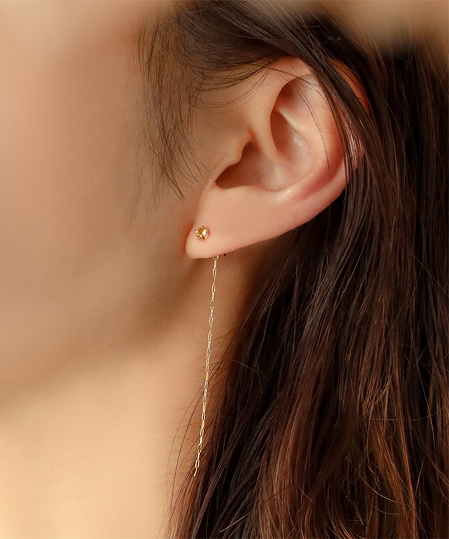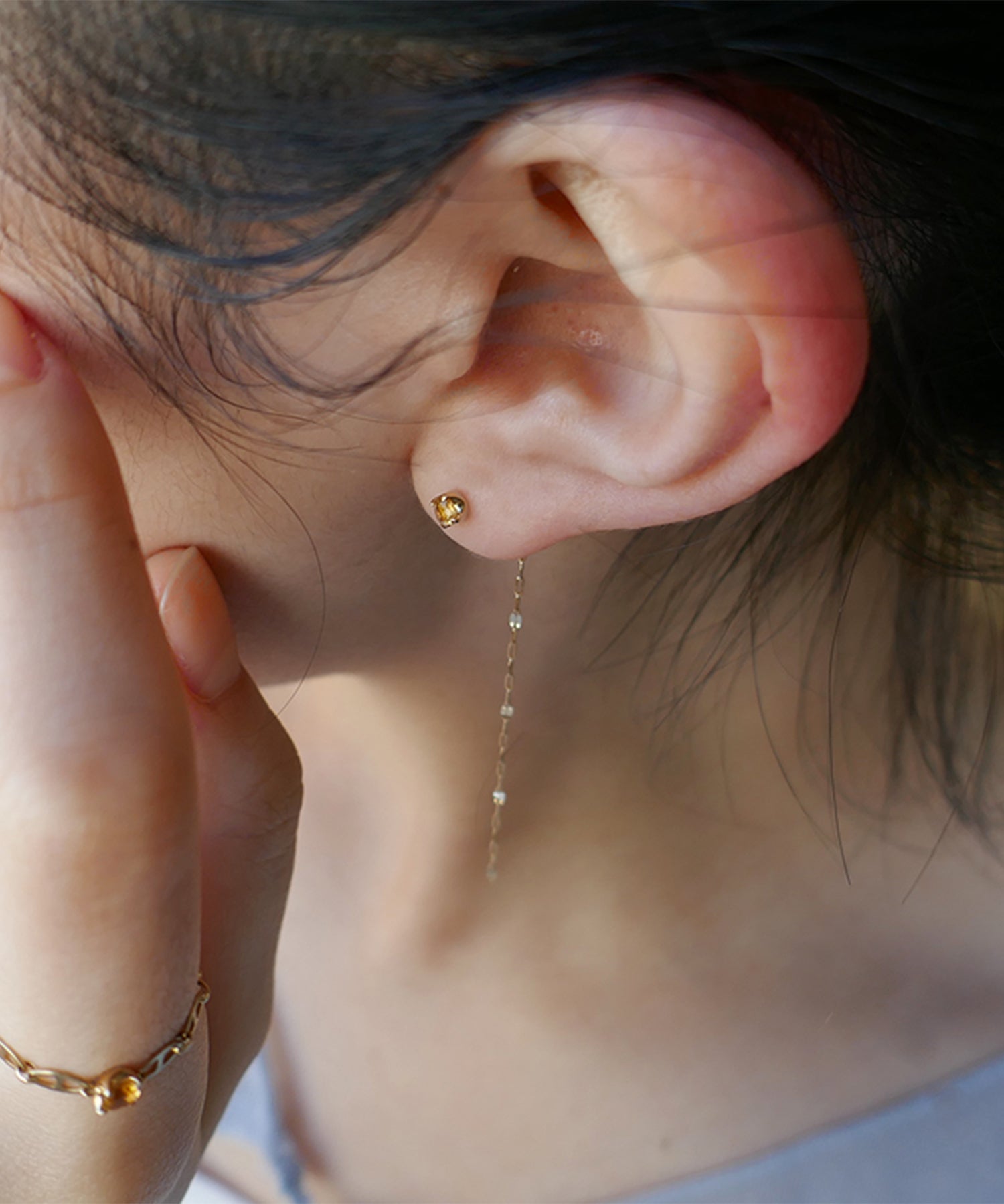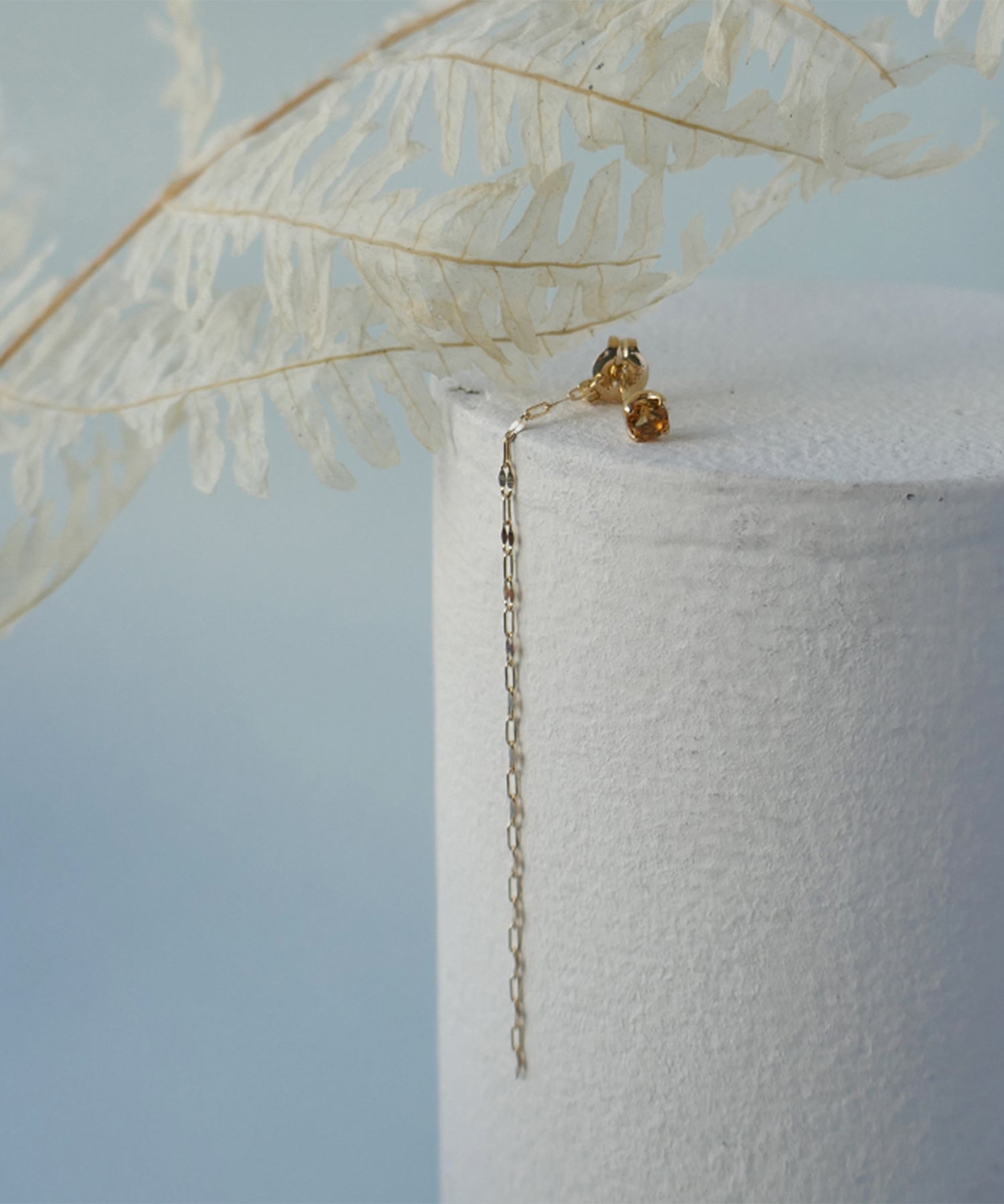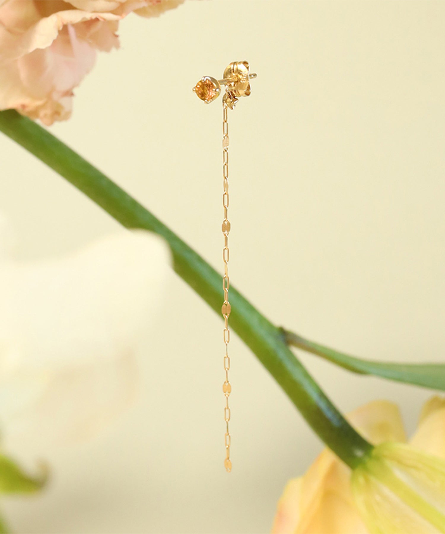 シトリンから揺れ動くロングチェーンが目を惹くゴールドピアス。チェーンは花びらのように光を受けて煌めくペタルチェーン。肌馴染みの良いイエローカラーが毎日着けたくなりあなたの生活に溶け込みます。